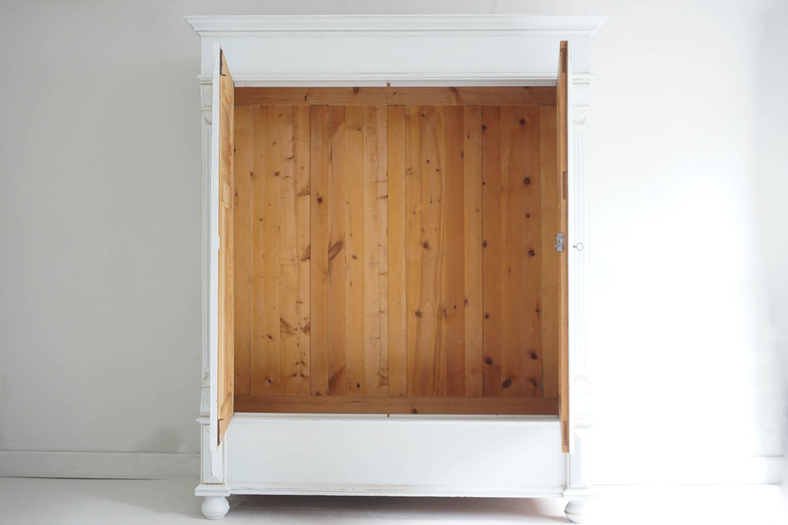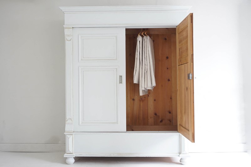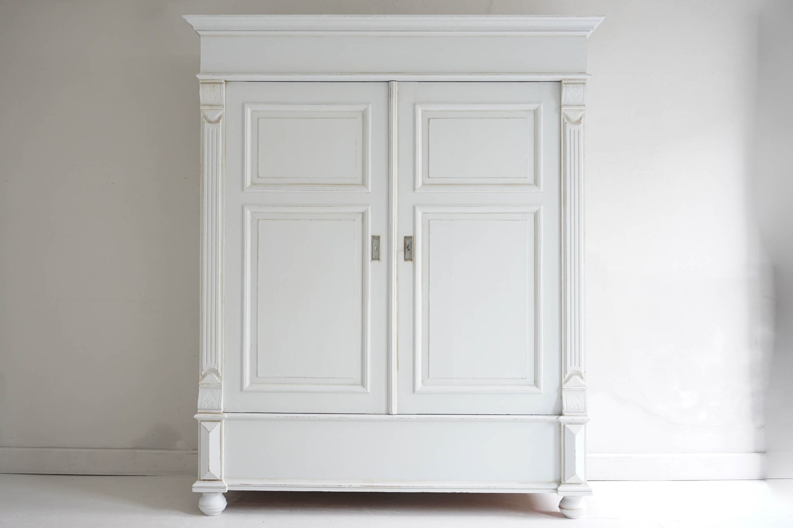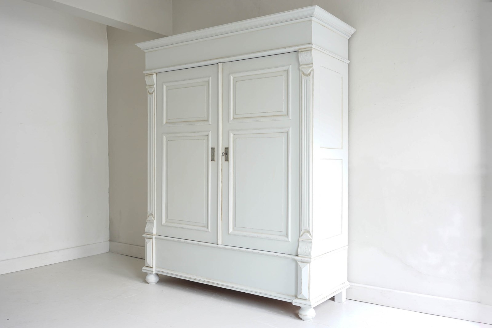Antique Continental knockdown wardrobe recently refurbished in Rustoleum Chalk Paint (Dove) and lightly distressed. This piece fully dismantles for ease of transportation and access into awkward spaces. It is easy to assemble and then provides sturdy storage space. Fitted with a rail. Dimensions are to the largest external edges. Internal depth 50cm spacious for side to side hanging.