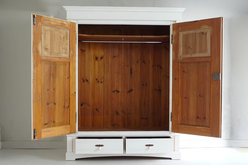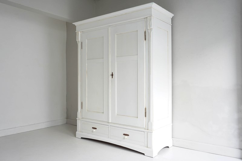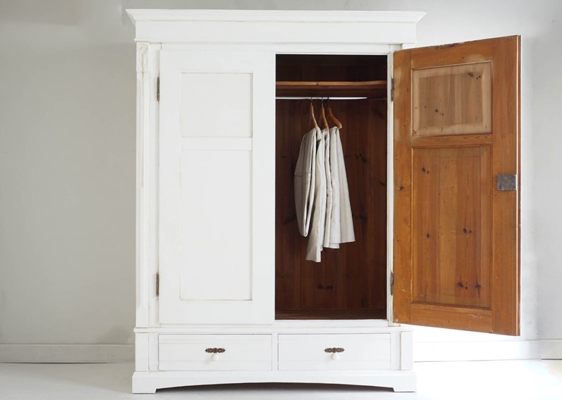 Antique Continental knockdown wardrobe recently refurbished in Rustoleum Chalk Paint (Chalk White) and lightly distressed. This piece fully dismantles for ease of transportation and access into awkward spaces. It is easy to assemble and then provides sturdy storage space. Fitted with a rail. Dimensions are to the largest external edges. Internal depth 57cm spacious for side to side hanging.