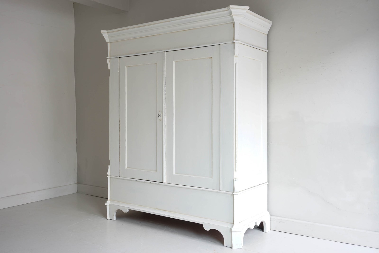 Antique Continental knockdown wardrobe recently refurbished in Rustoleum Chalk Paint (Oyster) and lightly distressed. This piece fully dismantles for ease of transportation and access into awkward spaces. It is easy to assemble and then provides sturdy storage space. Fitted with a rail. Dimensions are to the largest external edges. Internal depth 51cm spacious for side to side hanging.