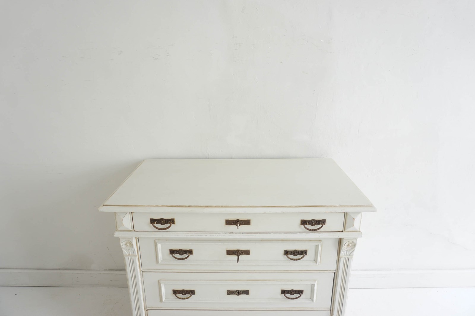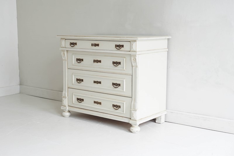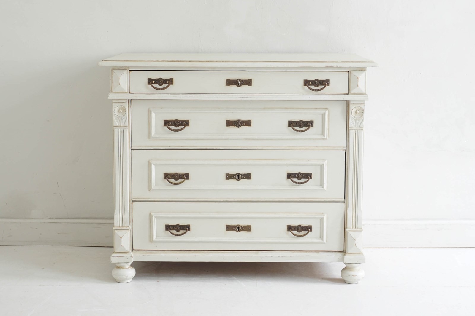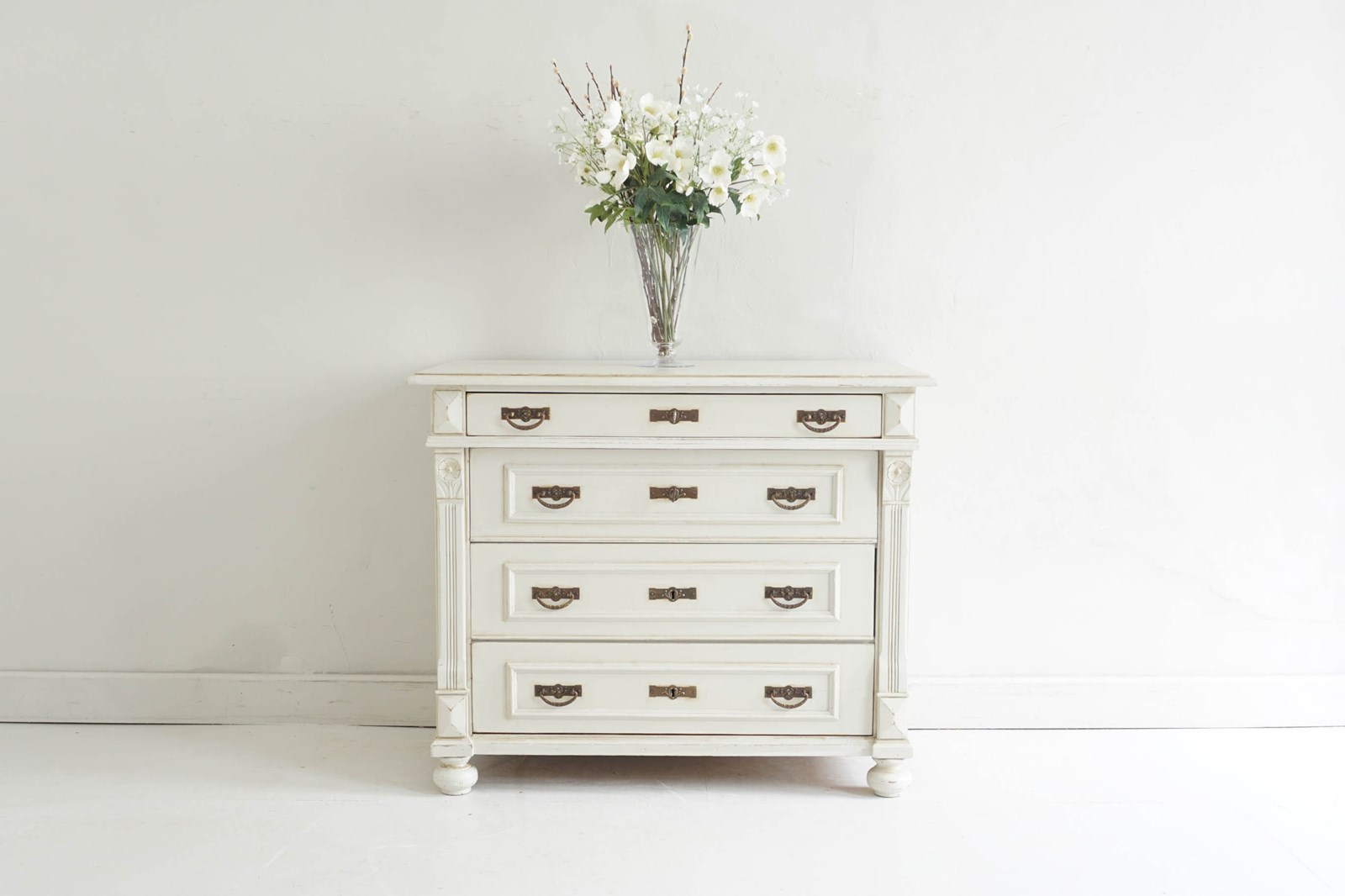 Continental chest of drawers recently refurbished in Rustoleum Chalk Paint 'Tanglewood' and lightly distressed. Attractive decorative carving, original handles and escutcheons.