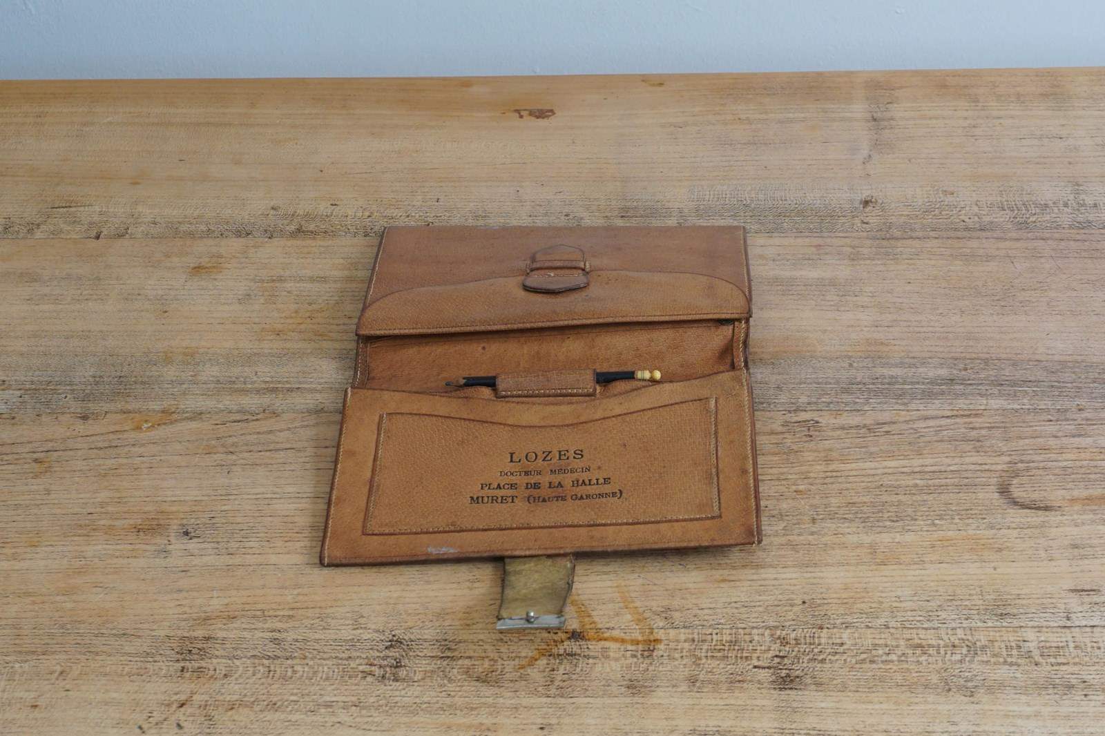 Unusual French leather notebook holder embossed with doctors details. Silver plated clasp and complete with original ivory tipped pencil. Does not appear to have been heavily used so is in great condition. Would make an unusal gift for medical related student or qualified person.