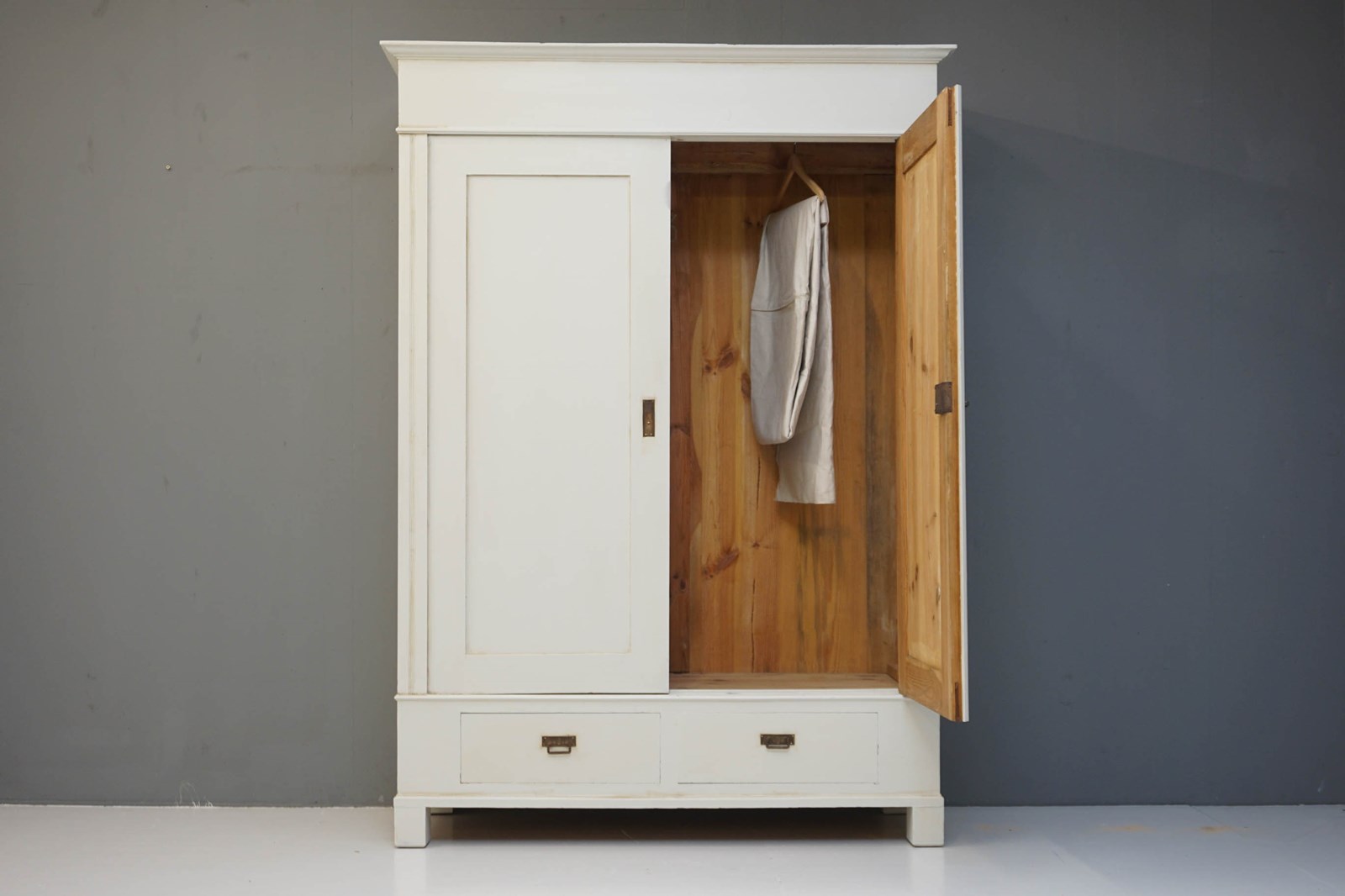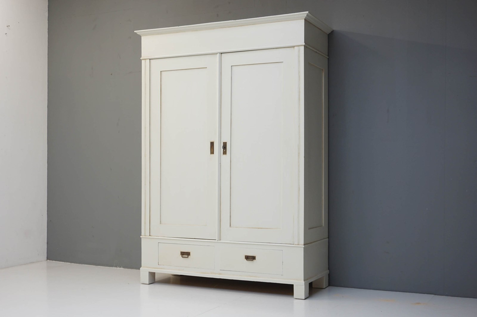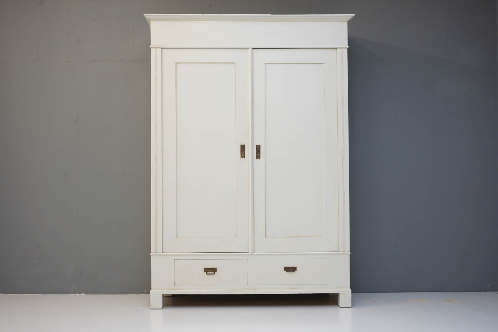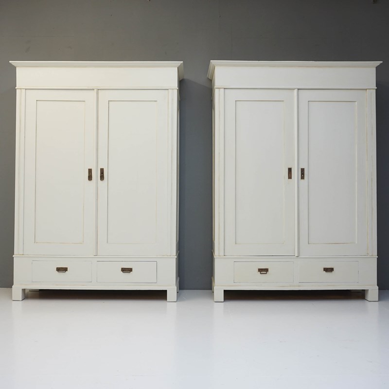 Pair of antique Continental knockdown wardrobes recently refurbished in Rustoleum Chalk Paint (Oyster) and lightly distressed. These wardrobe fully dismantle for ease of transportation and access into awkward spaces. They are easy to assemble and then provide sturdy storage space. Fitted with side to side hanging rails. Dimensions differ slightly.