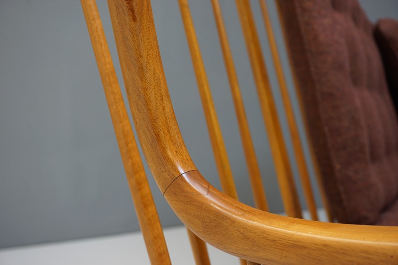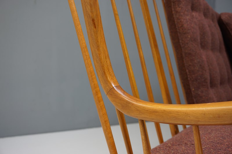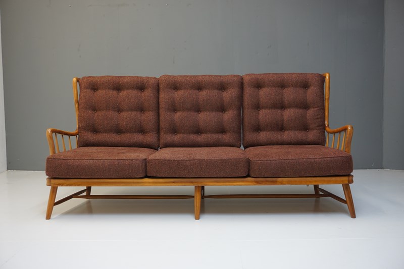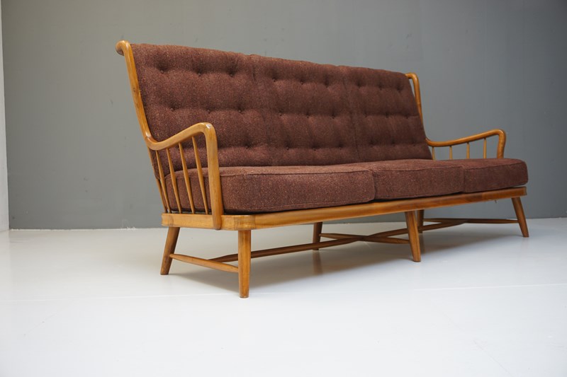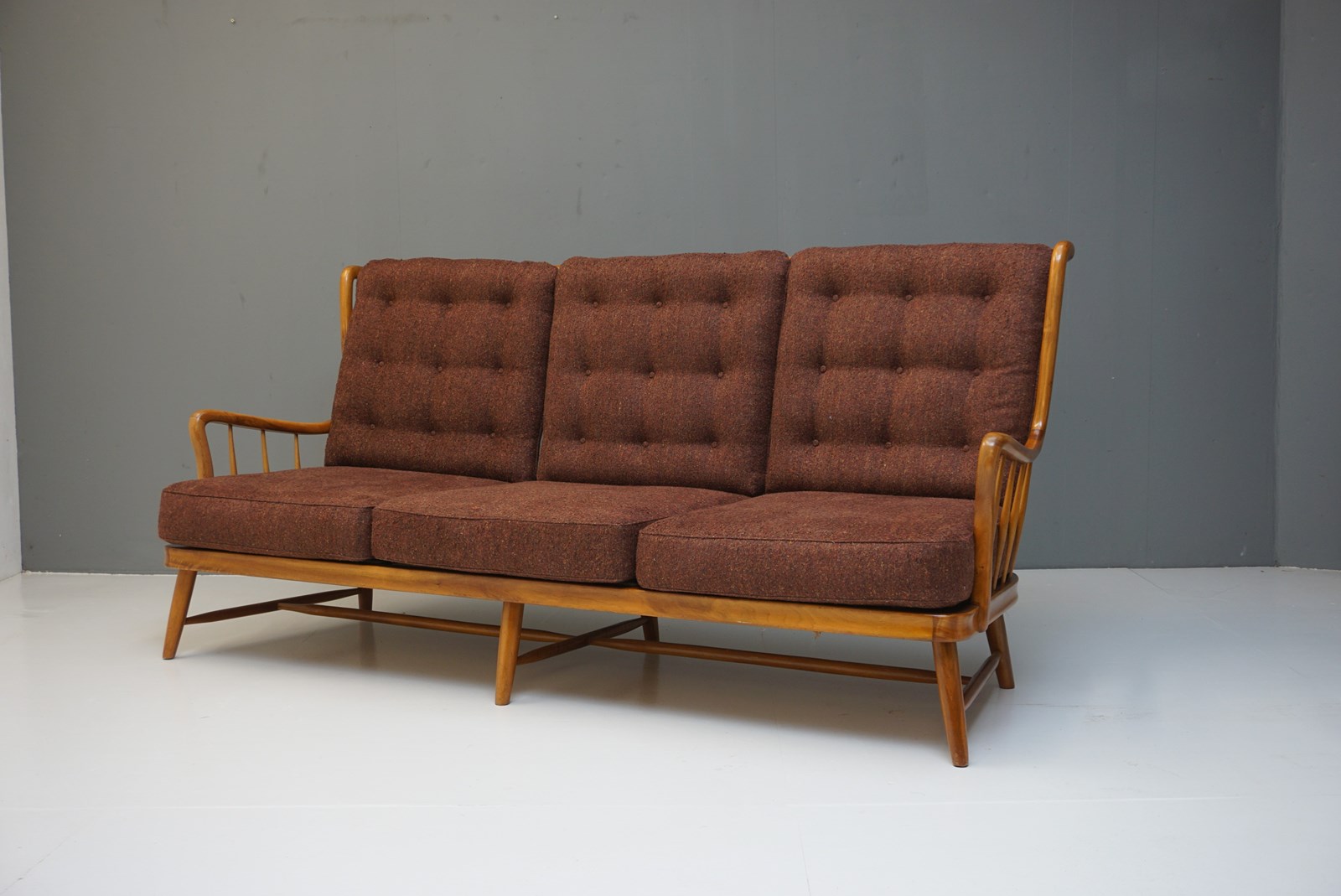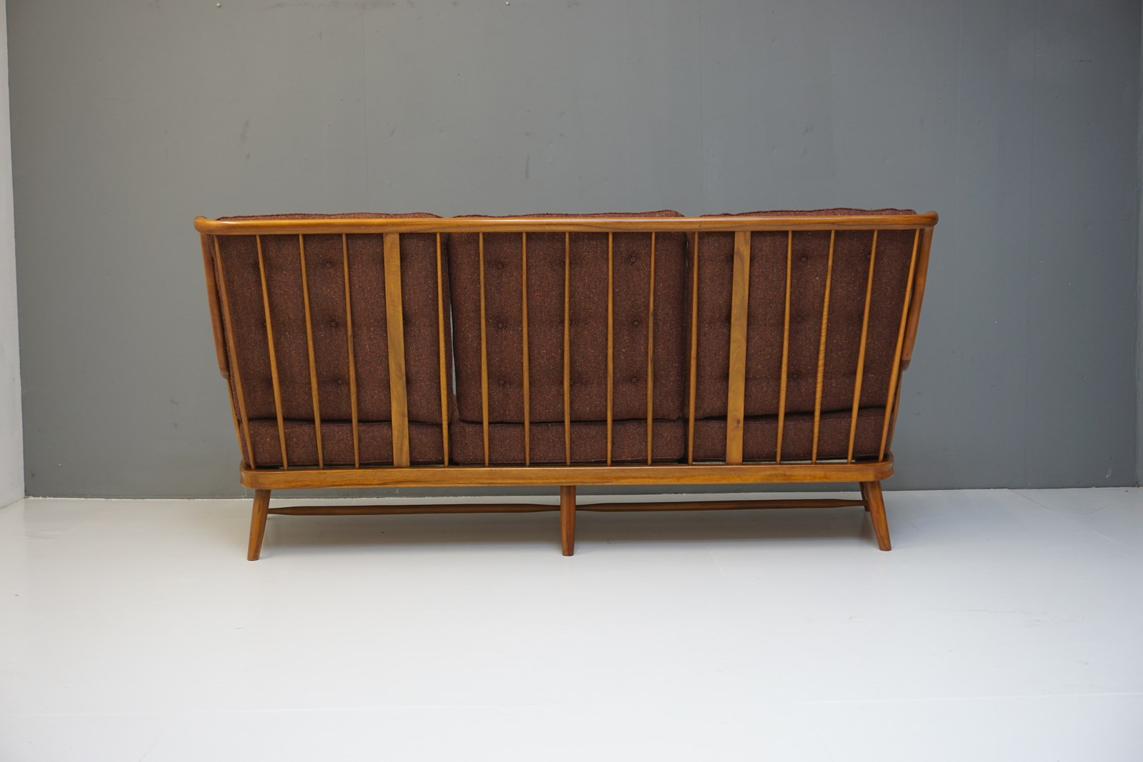 A stylish German beech framed Mid-century sofa with clean lines and warm wooden detailing. This piece has been reupholstered in Mark Alexander Textura Sienna Linen Melange, offering a rich, textured finish.