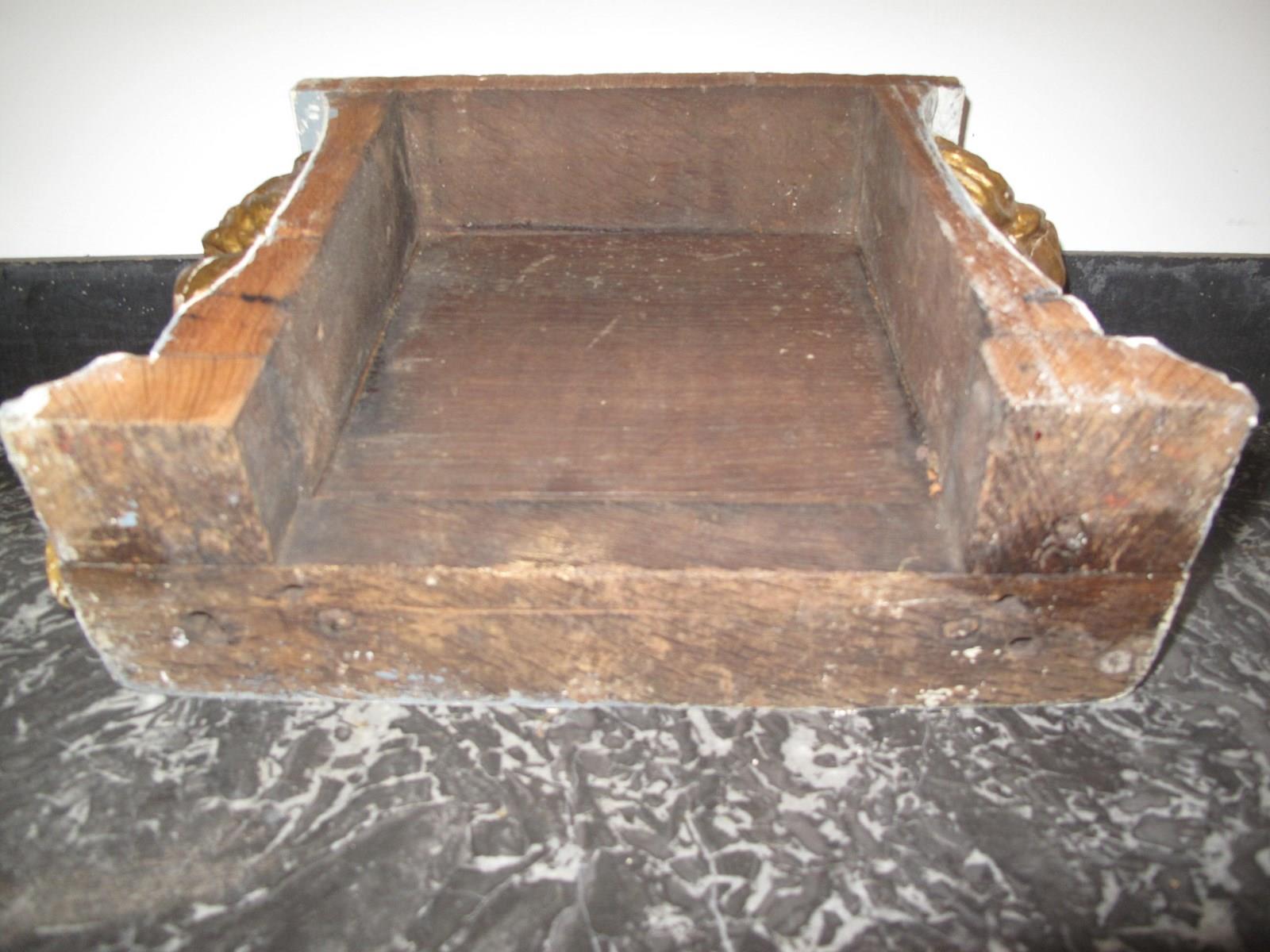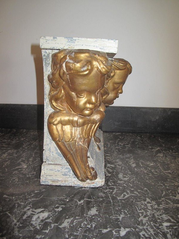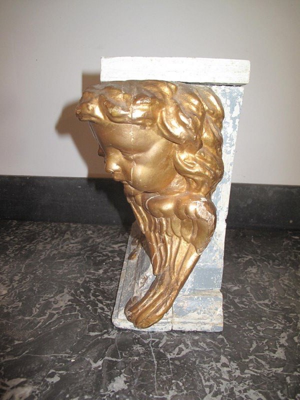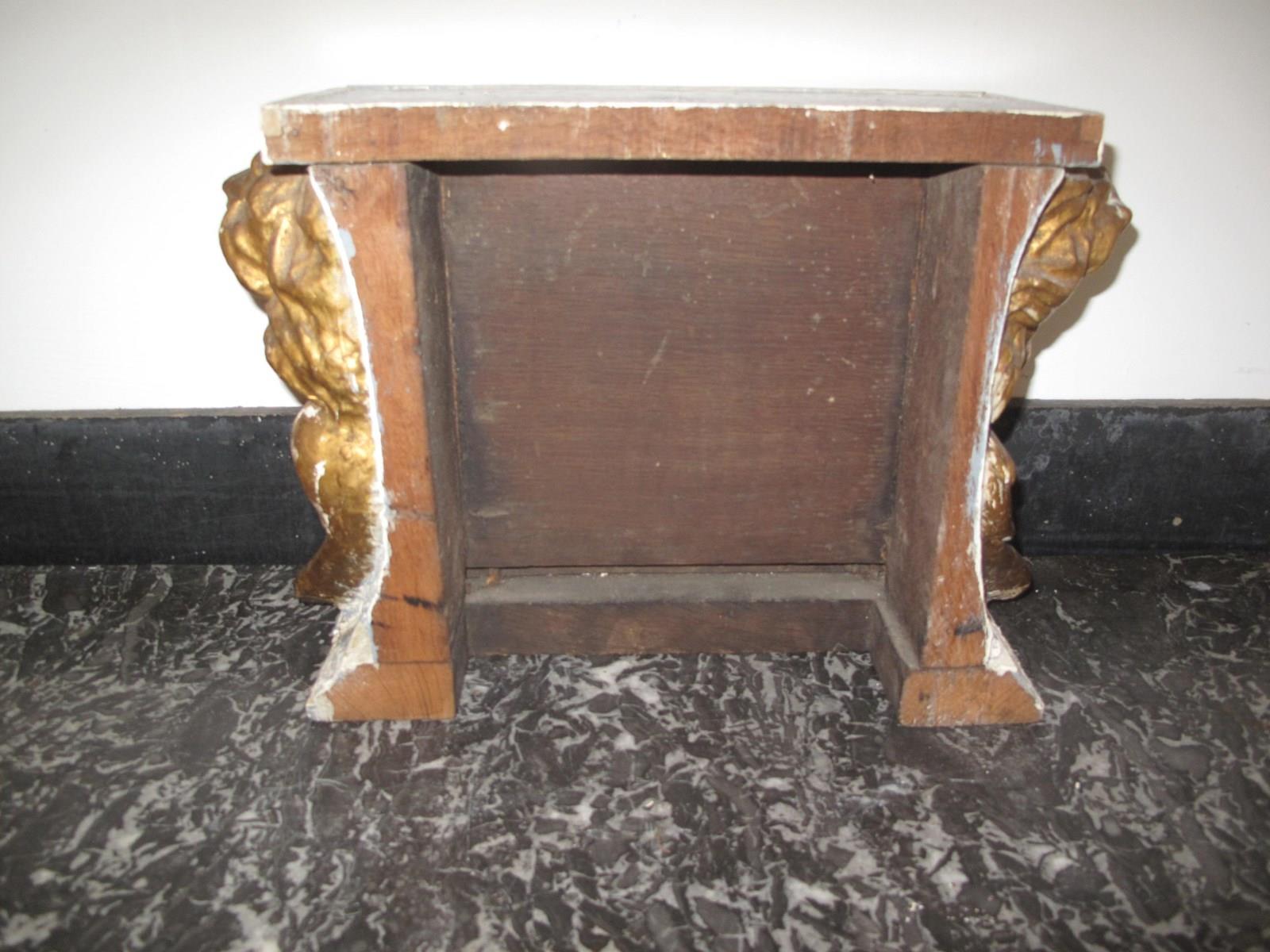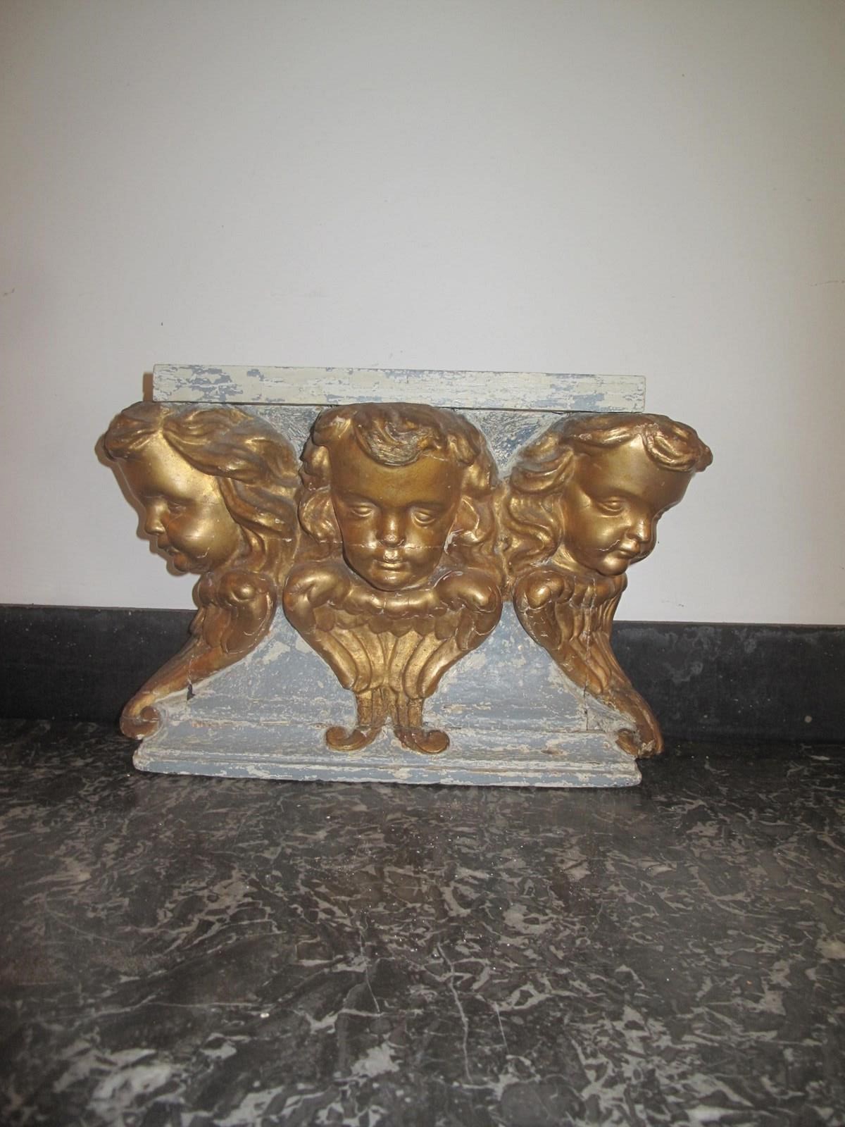 18th century hand carved giltwood cherub plinth. The plinth has its original French blue paint and gilding to the cherubs. This highly decorative plinth is carved in oak. c.1750.