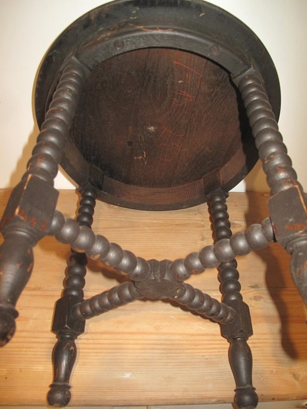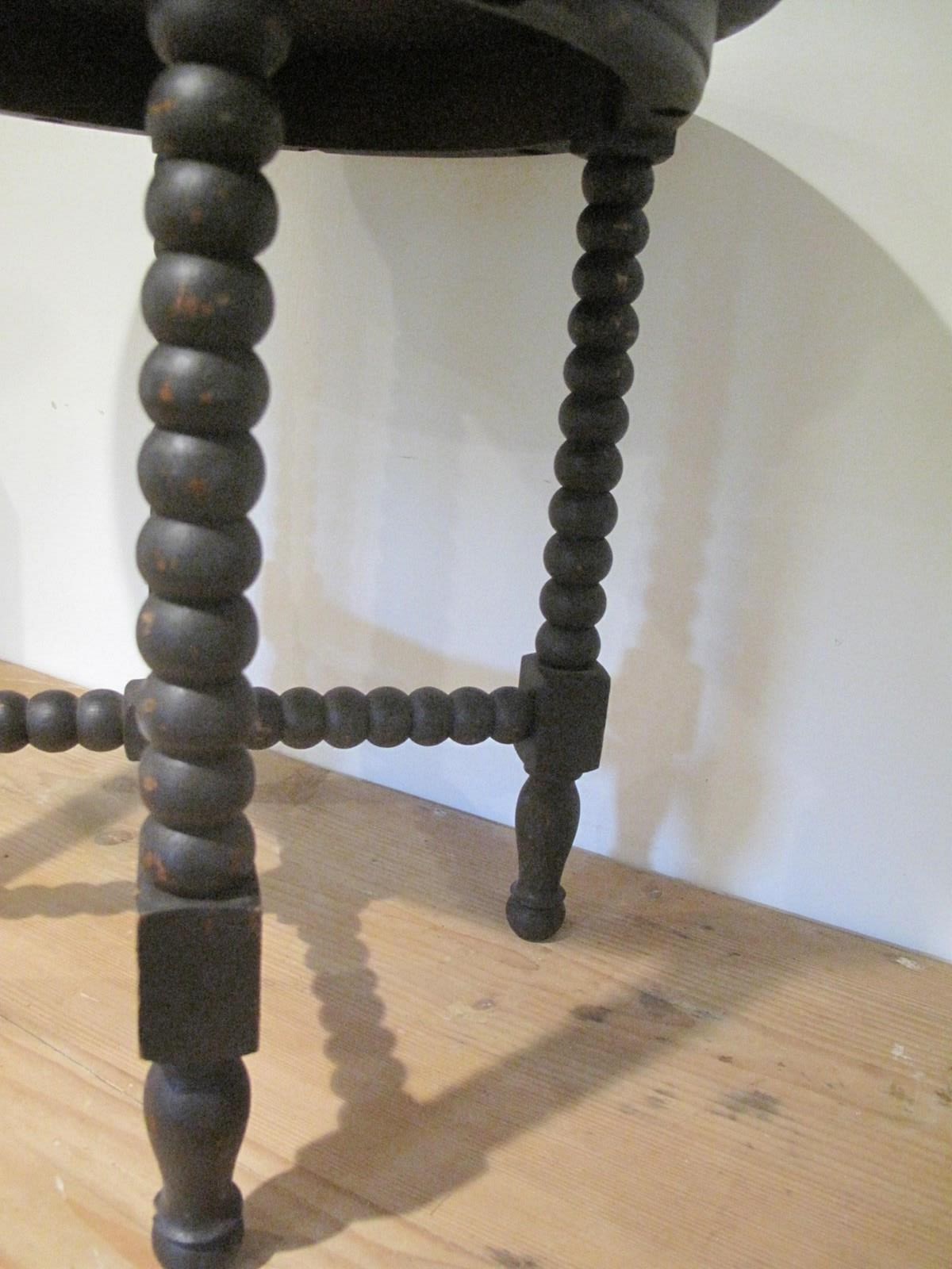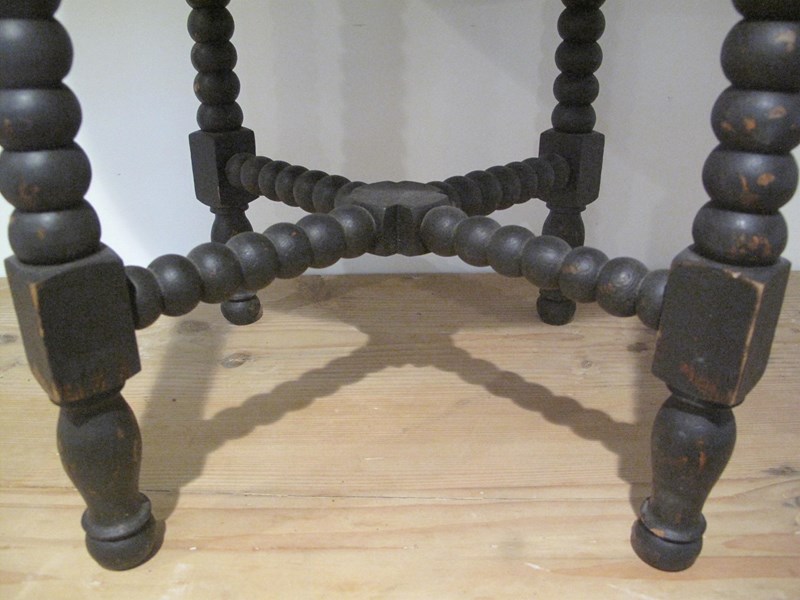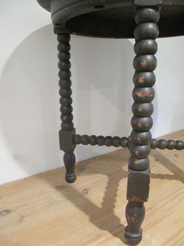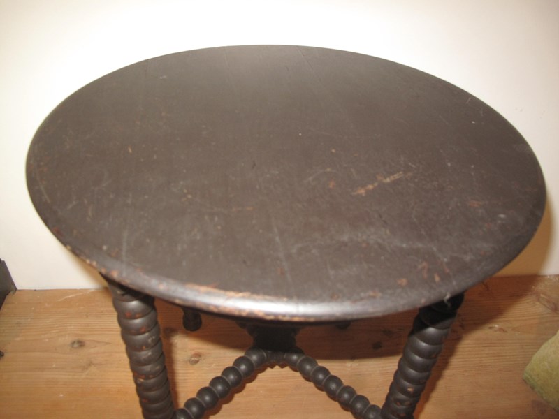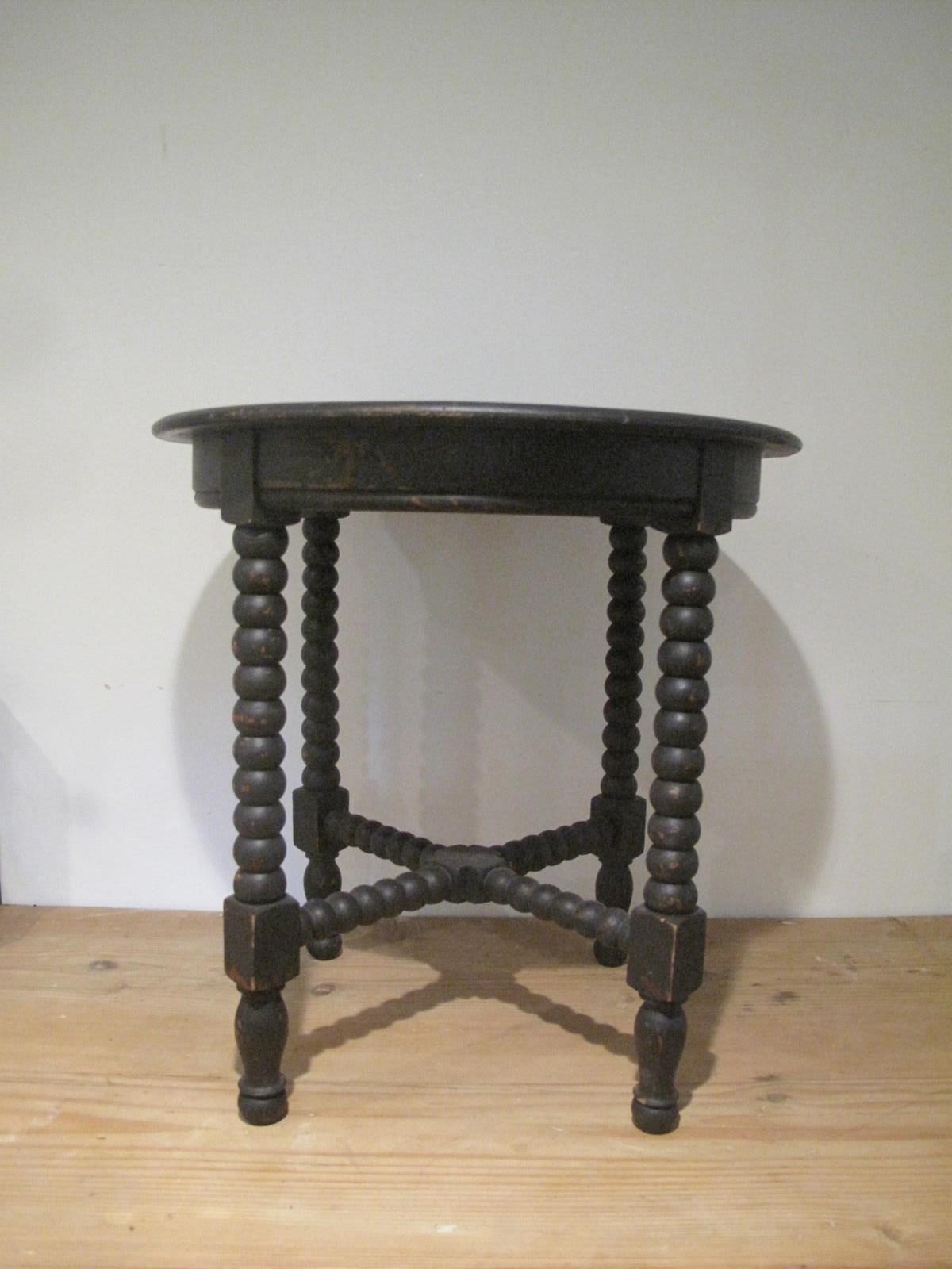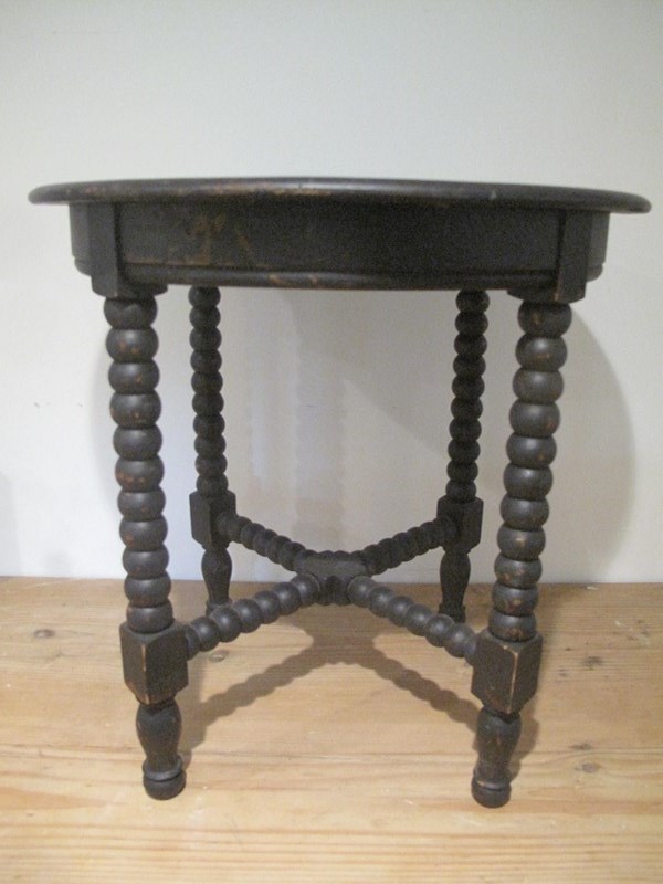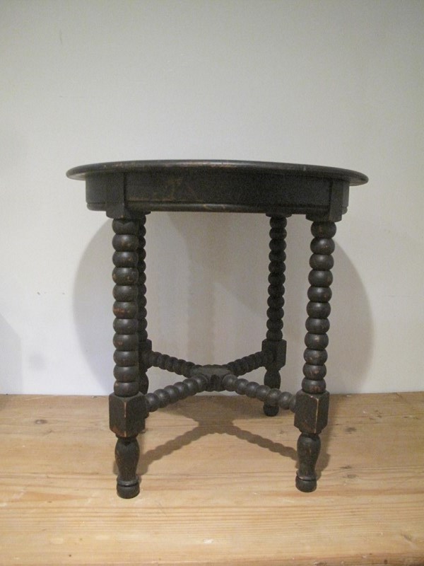 Antique oak side/lamp table featuring beautifully turned bobbin legs and a round top with a rich aged patina. Solid and well balanced with four sturdy legs. Perfect as a side table or lamp table. Late 19th century.