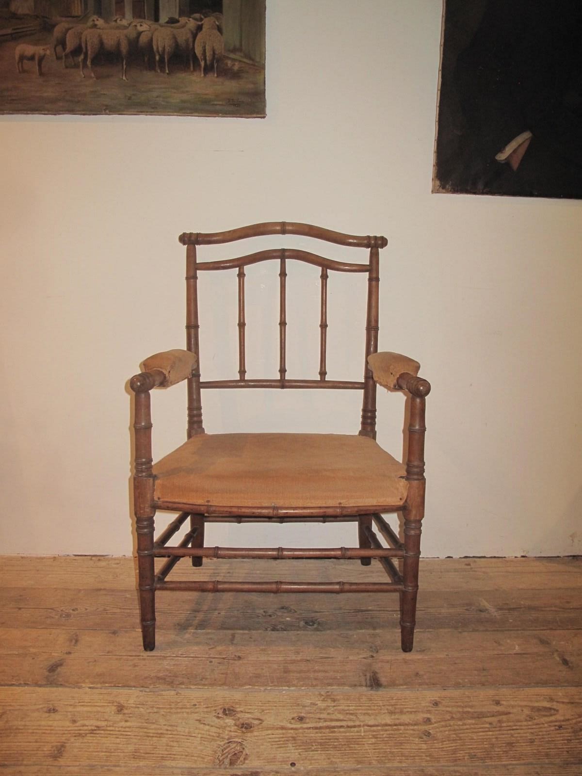 Antique faux bamboo chair with excellent woodwork and webbing. Ready for you to put your chosen fabric on. Late 19th century.
