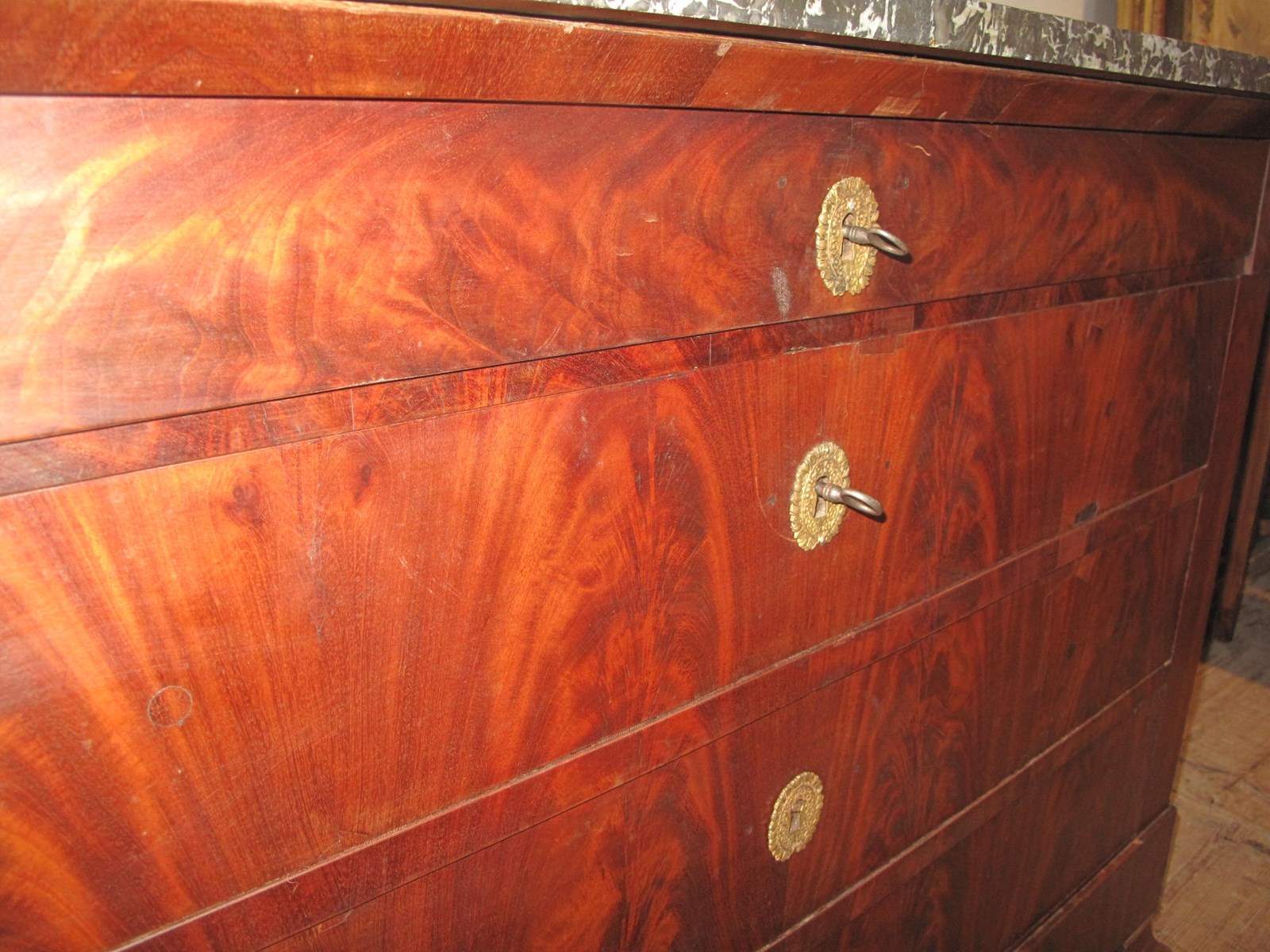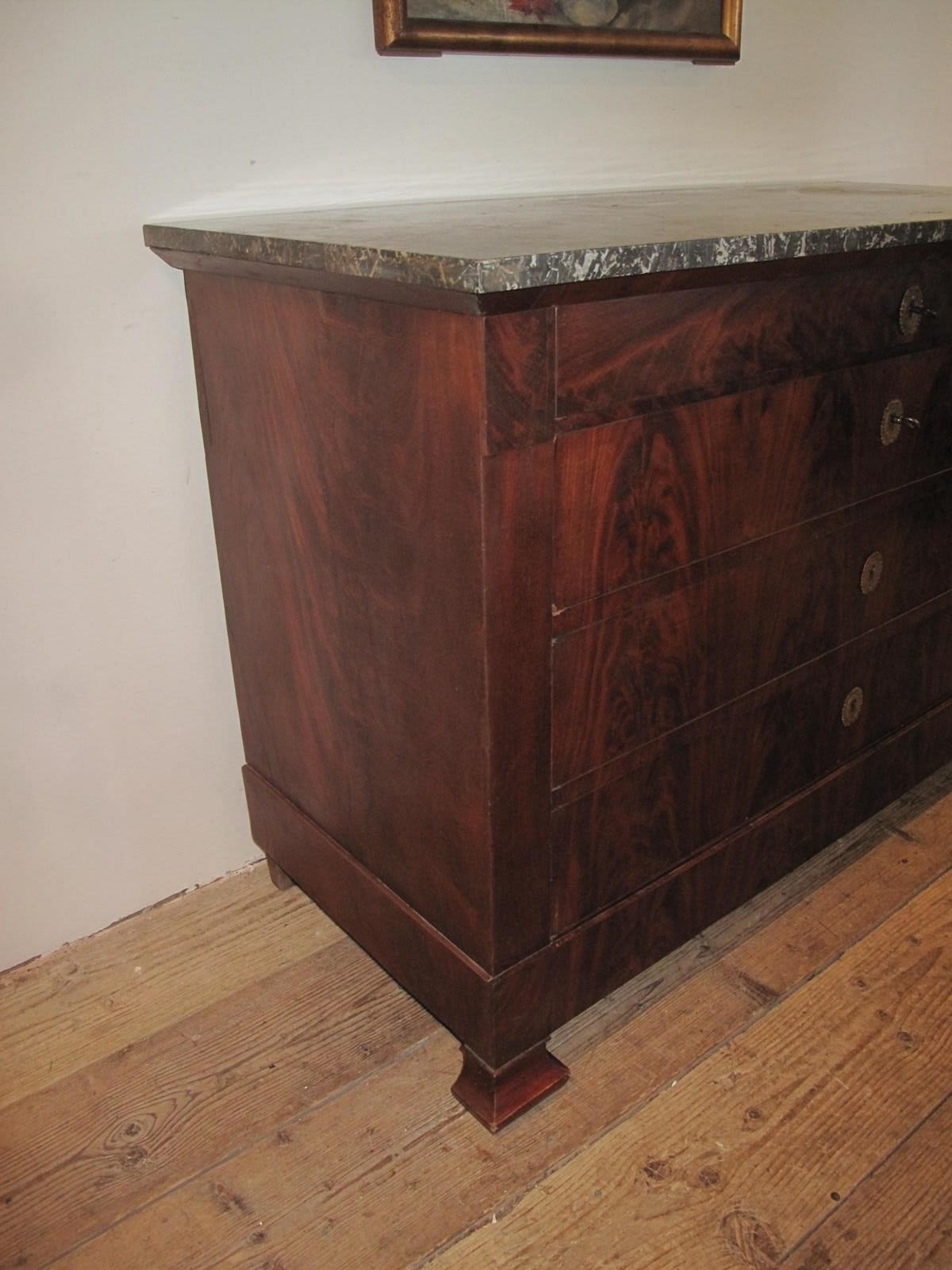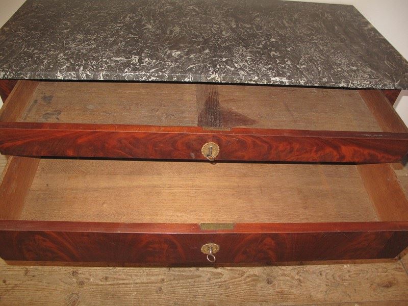 Antique flame mahogany commode with its working locks and key. The commode has its original marble top and the drawers slide easily.