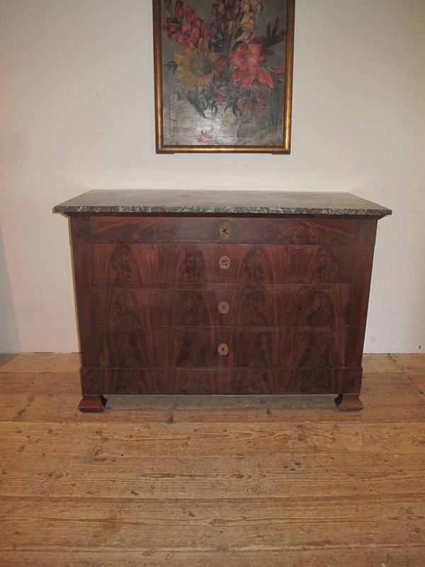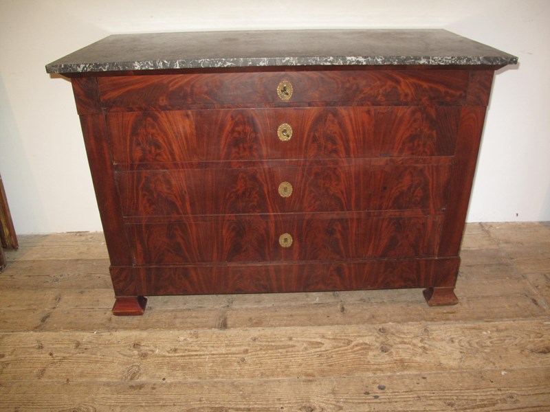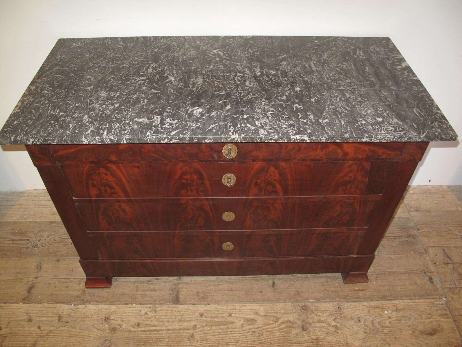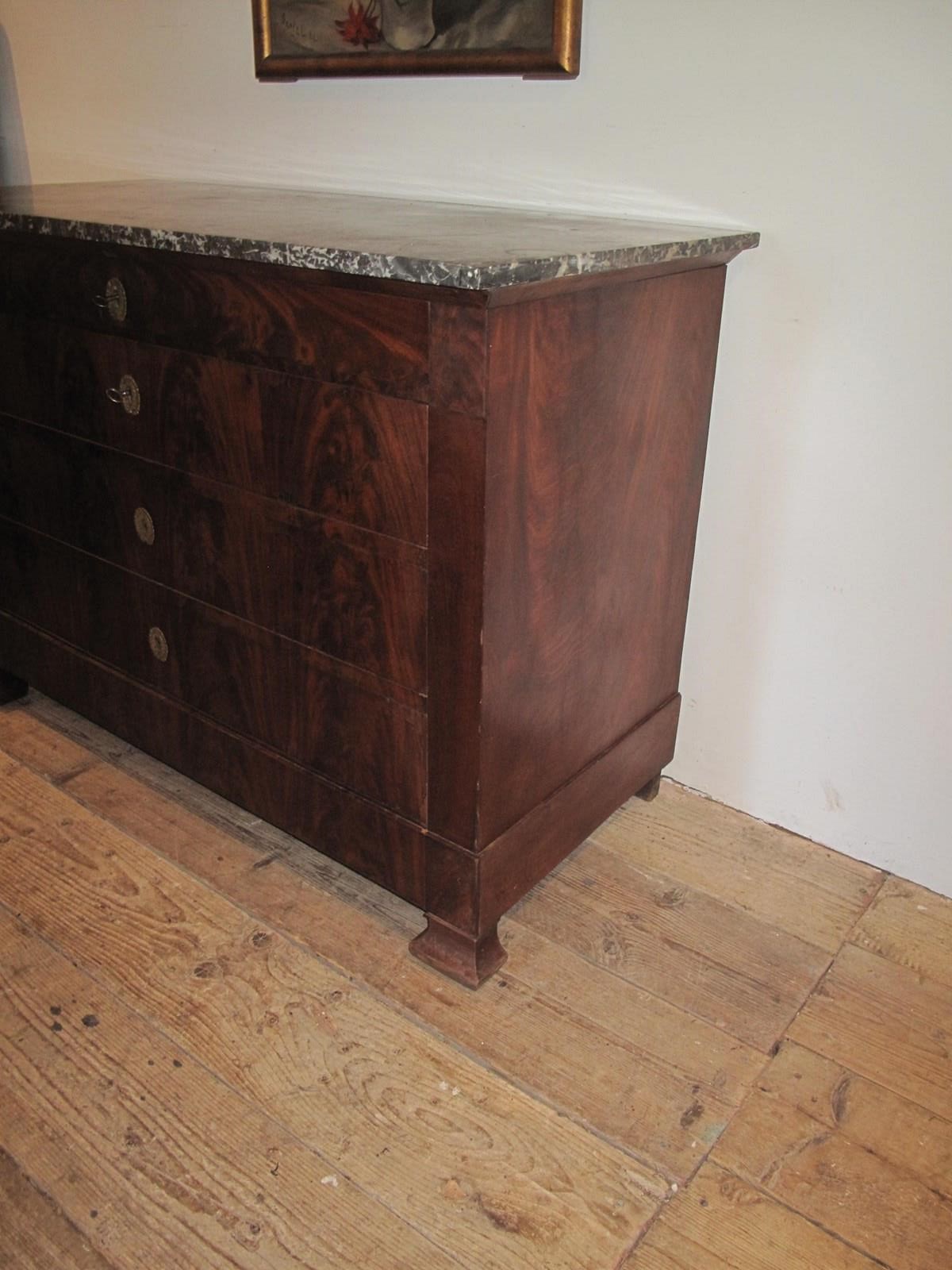 Antique flame mahogany commode with its working locks and key. The commode has its original marble top and the drawers slide easily.