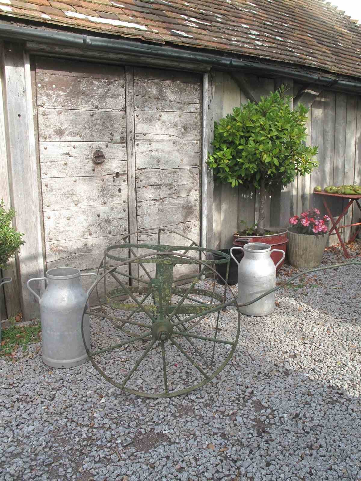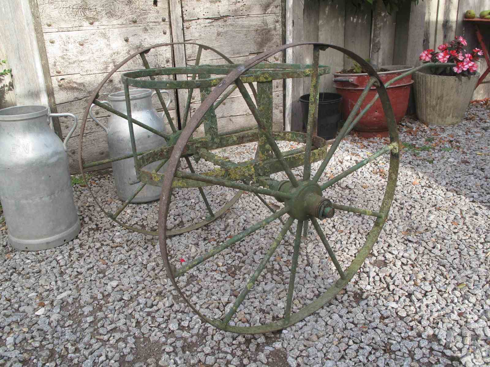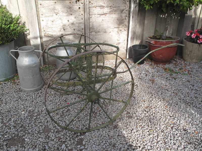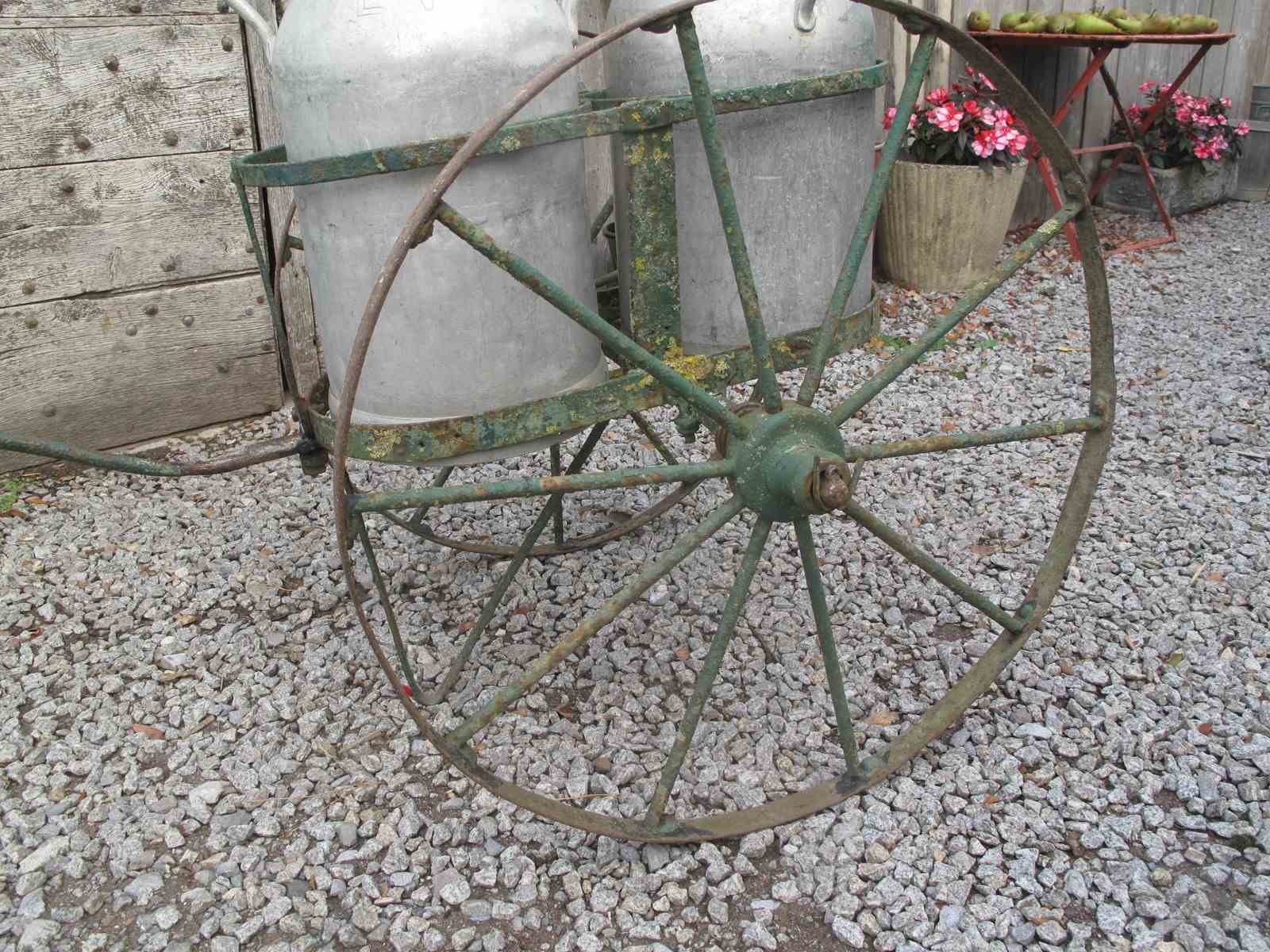 Late 19th century milk churn carrier in its original old green paint. The carrier is in good but well used condition the wheels move freely. Would make a wonderful garden planter. The two churns can be purchased separately for £50 the pair.