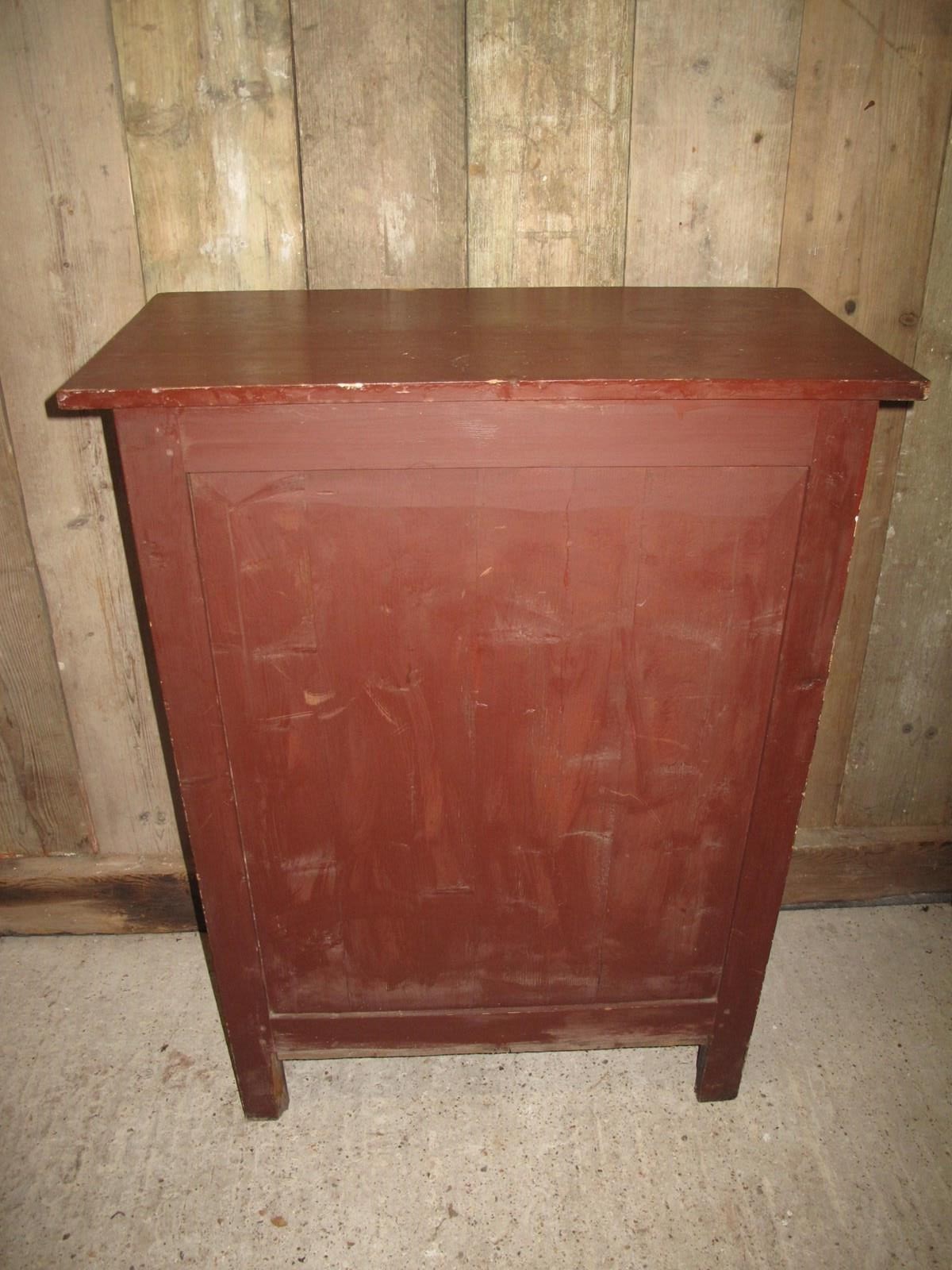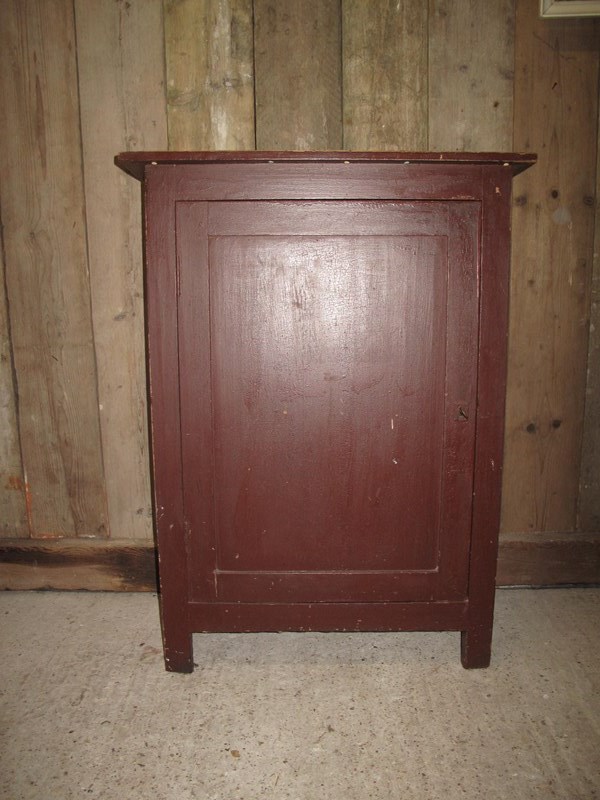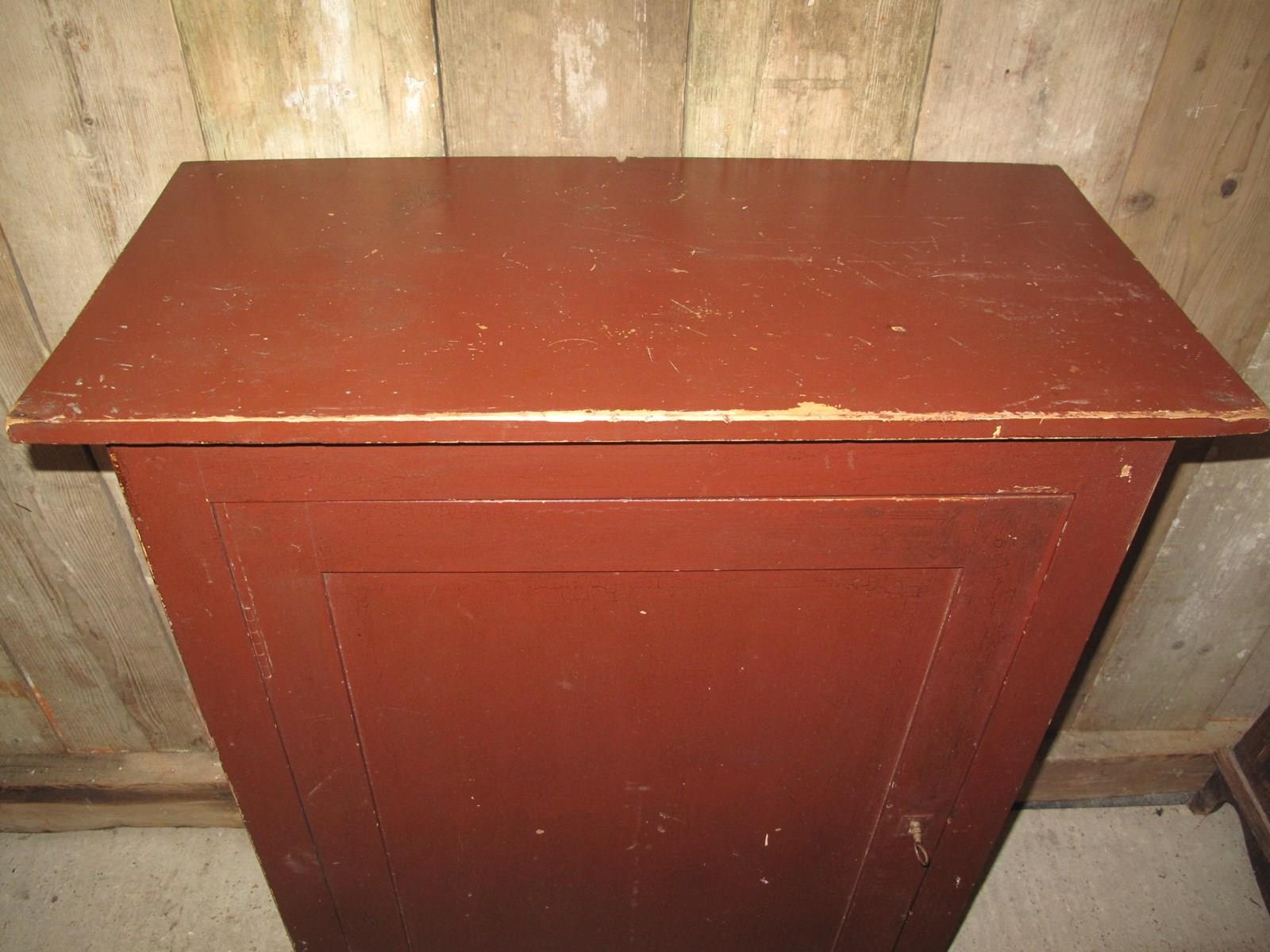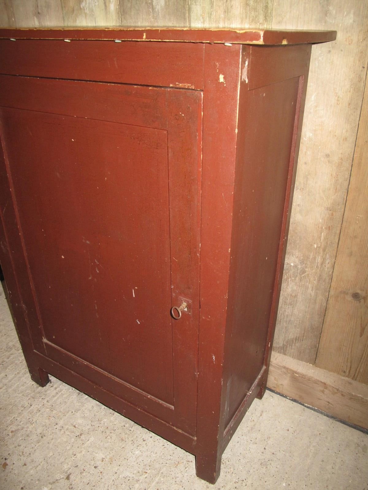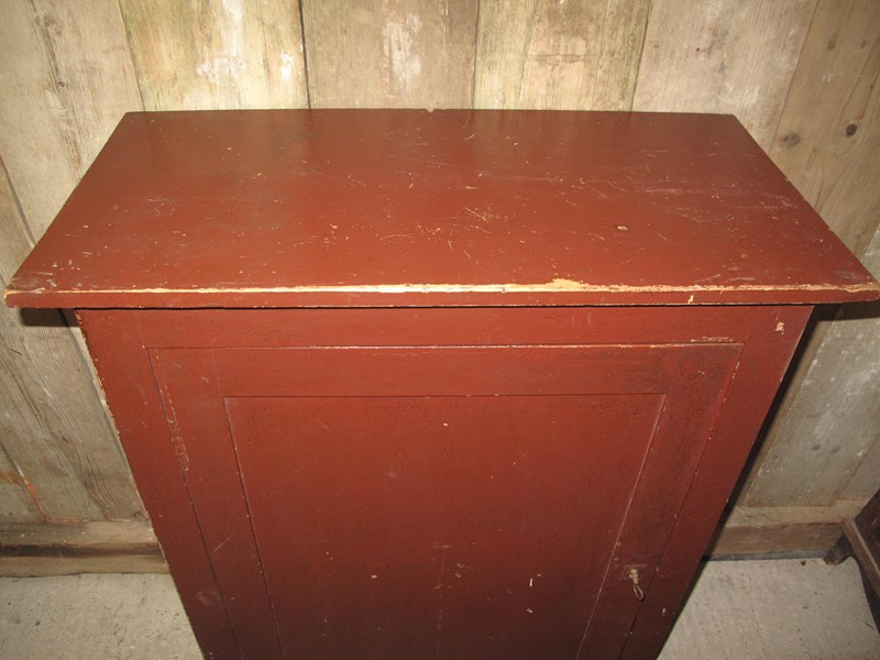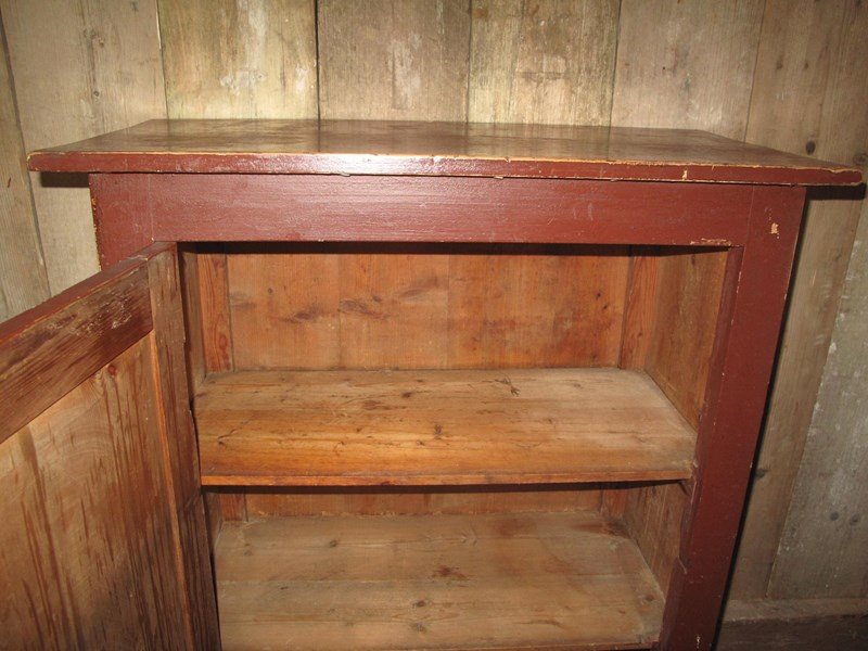 Pine cupboard in its original old brick red paint. The cupboard has solid pine shelves. This is a useful size cupboard that could fit into any situation. c.1880.