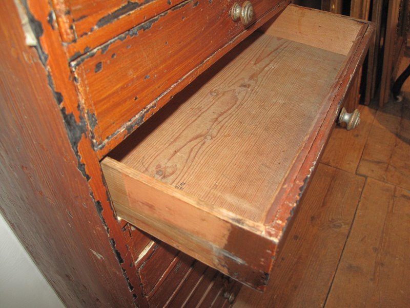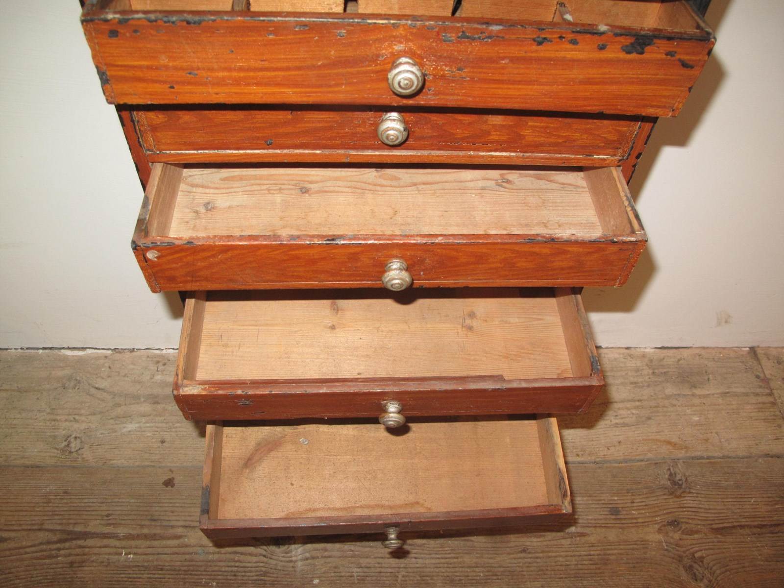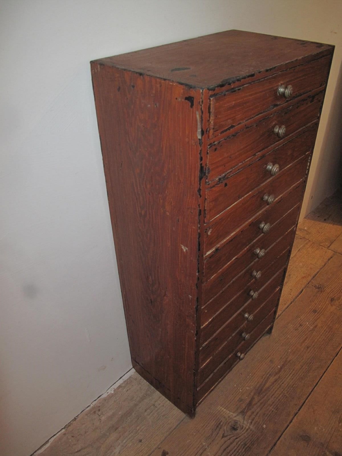 Flight of pine drawers with the original wooden knobs. The drawers were originally ebonised but have had a 1920s faux oak finish applied. The drawers all move freely and the unit is solid. Easy dry scrape back to the ebonising if required. c.1890.
