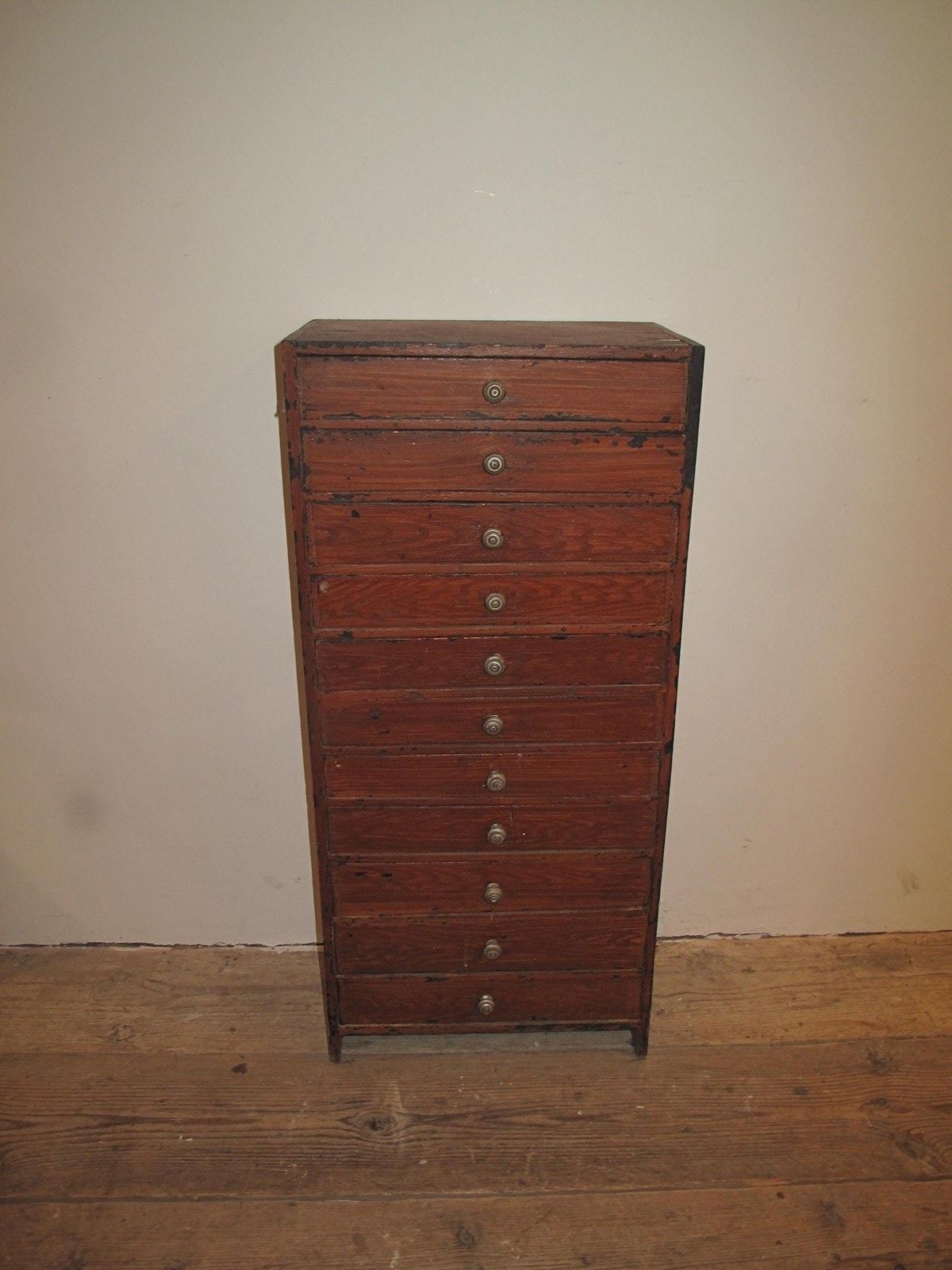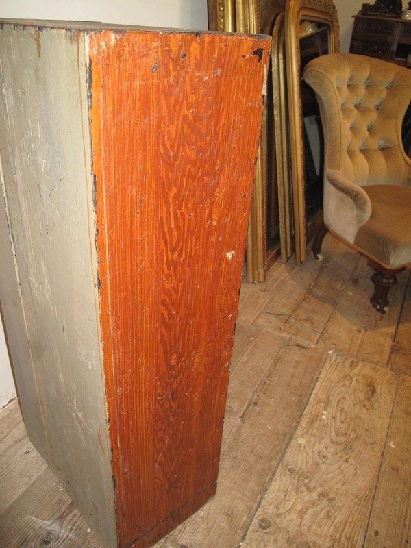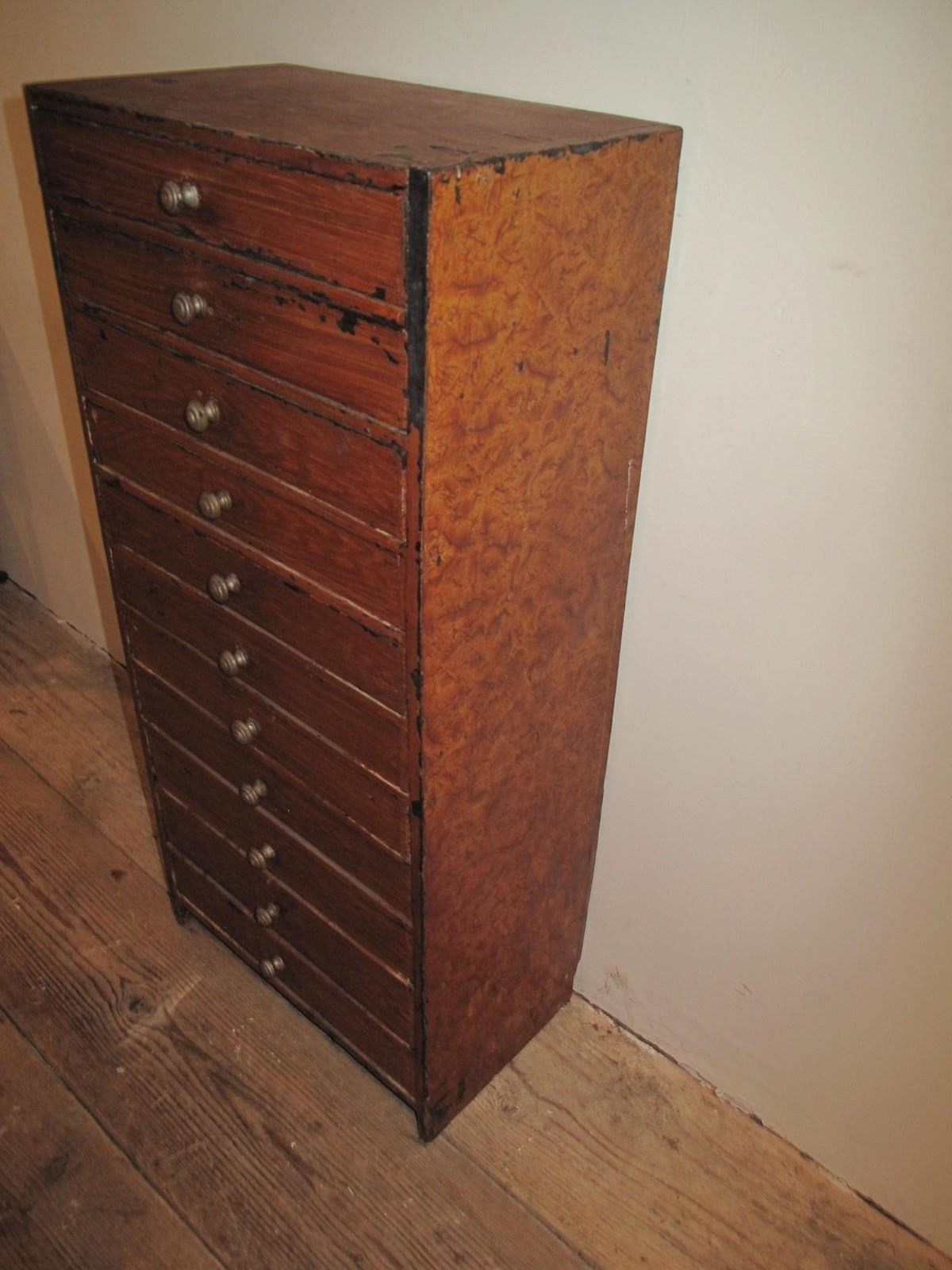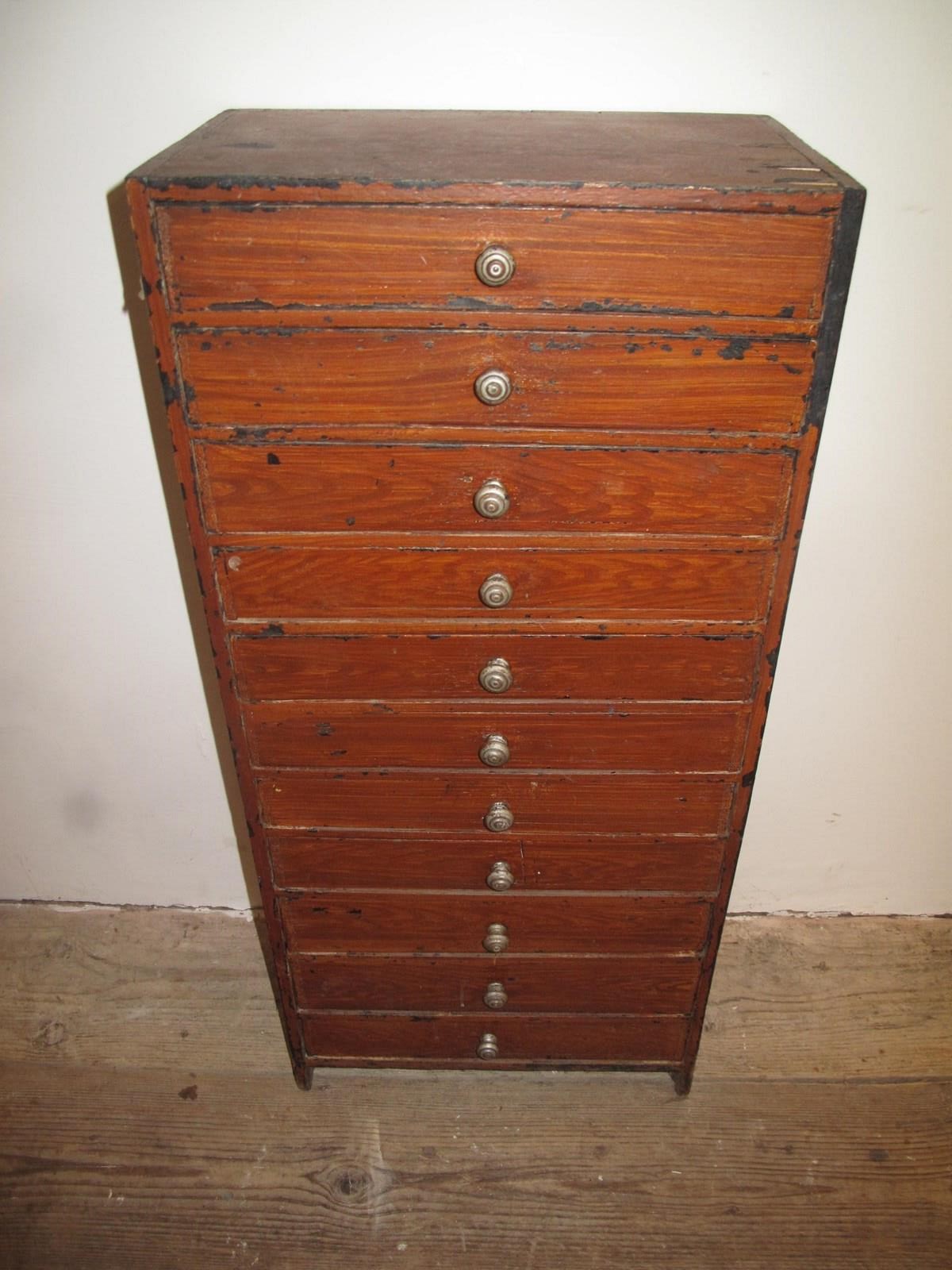 Flight of pine drawers with the original wooden knobs. The drawers were originally ebonised but have had a 1920s faux oak finish applied. The drawers all move freely and the unit is solid. Easy dry scrape back to the ebonising if required. c.1890.