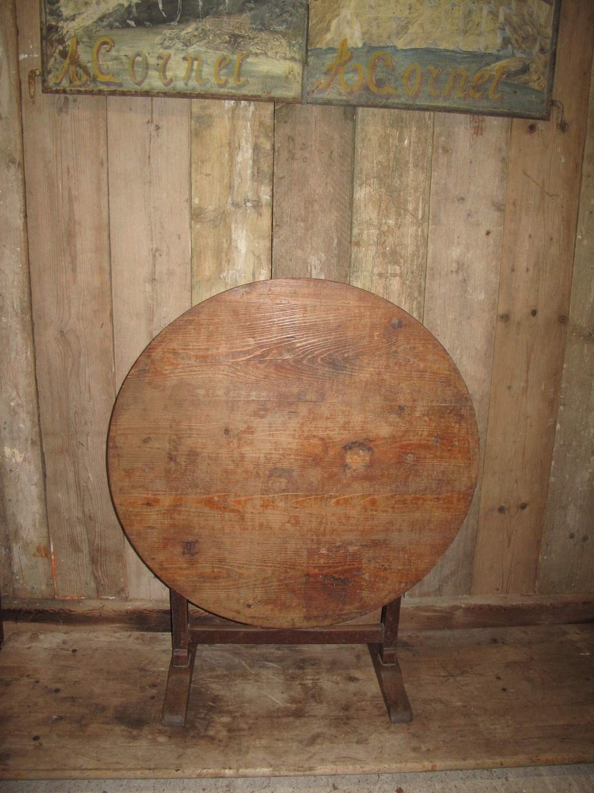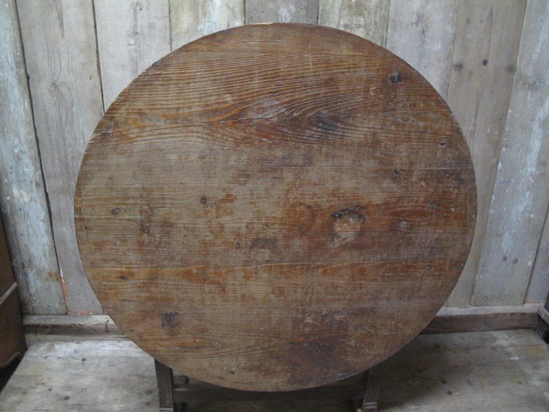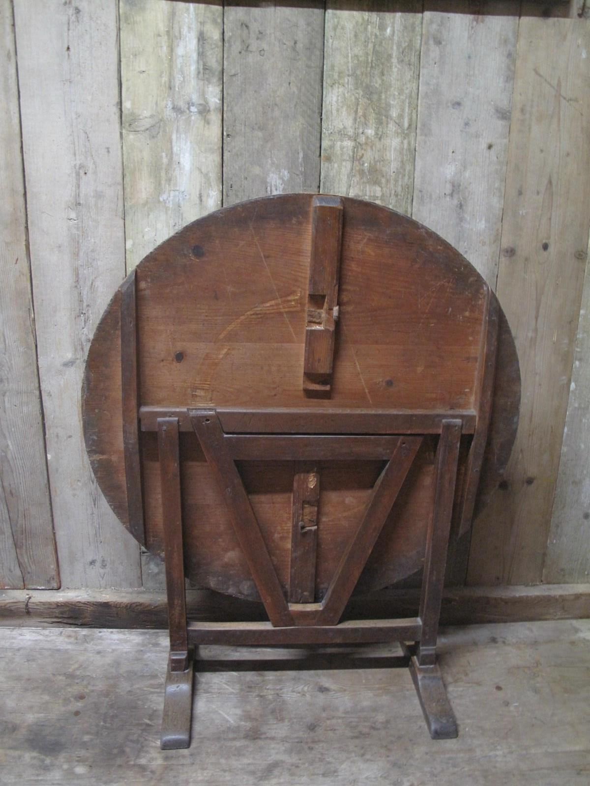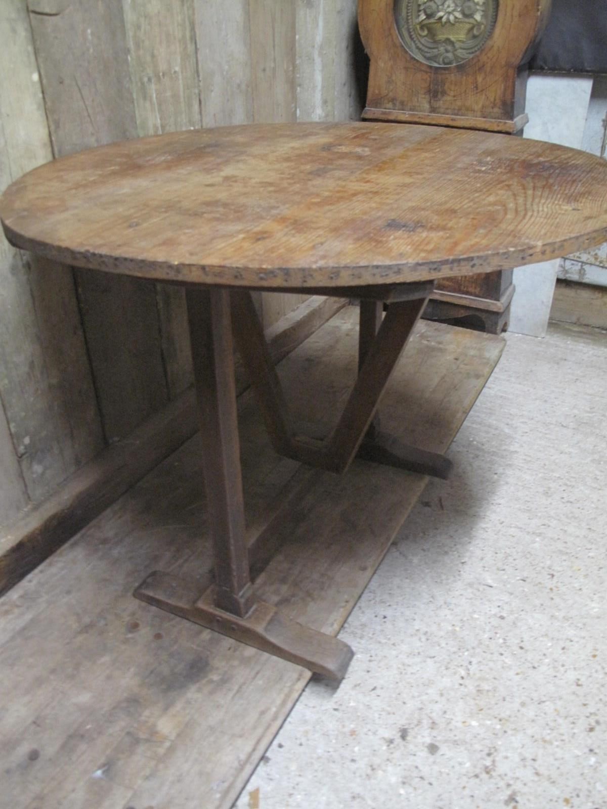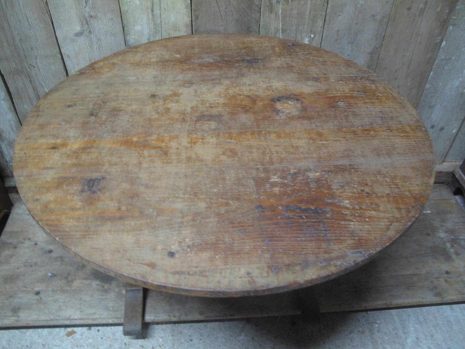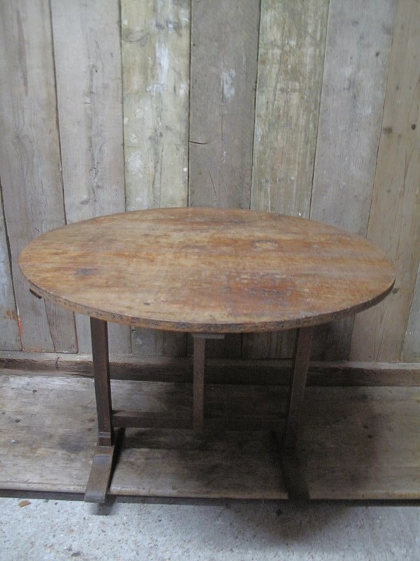 Antique vendage table with a solid pine top and a oak base. The table is in good condition folds easily and is very sturdy.