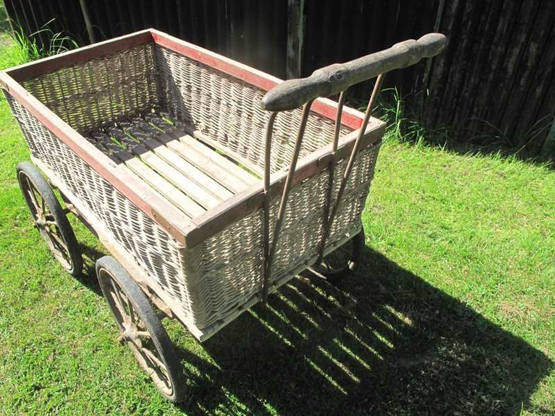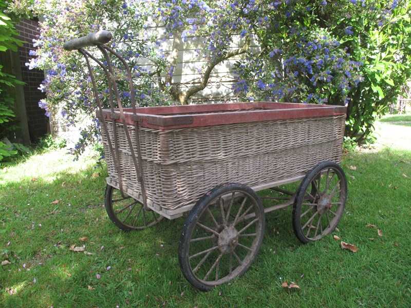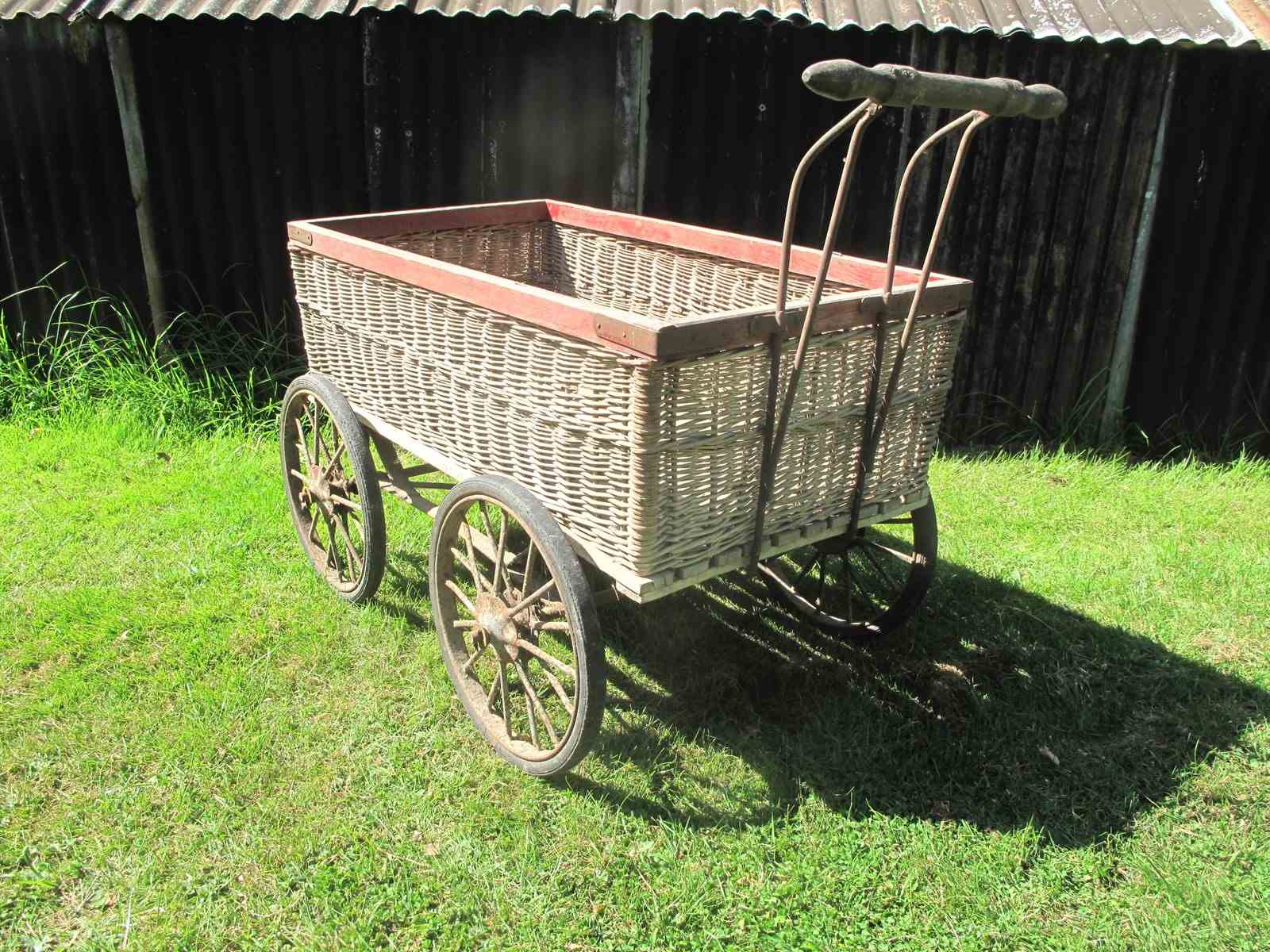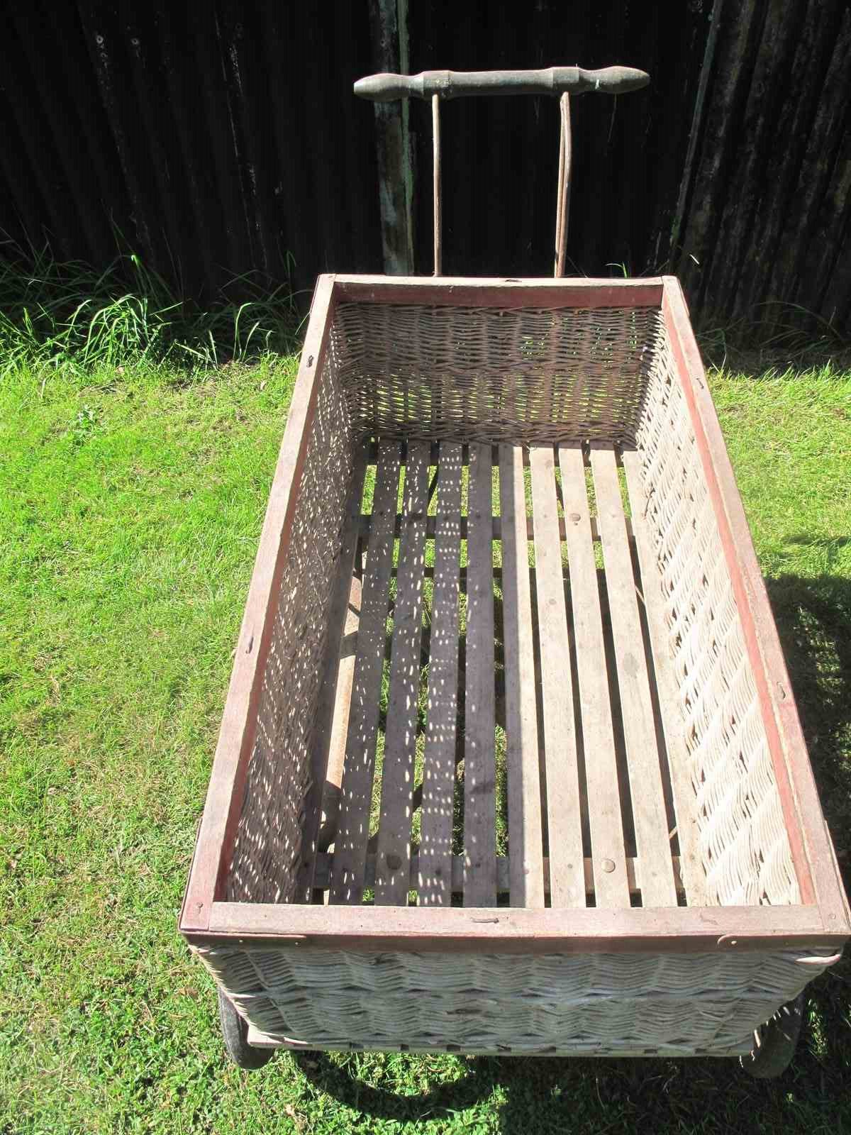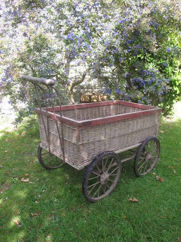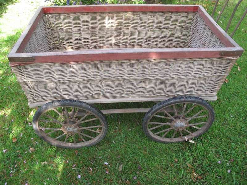 Original antique garden cart from Alsace Lorraine in eastern France. This is not a copy but an early 20th century cart in fantastic condition. The cart is on an iron axle with an iron and wooden beechwood handle, iron spoke wheels with solid rubber tyres. Original red painted framework surrounding the undamaged wicker basket. c.1920.