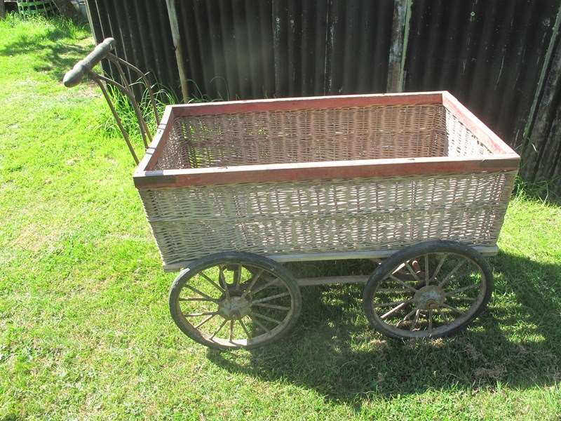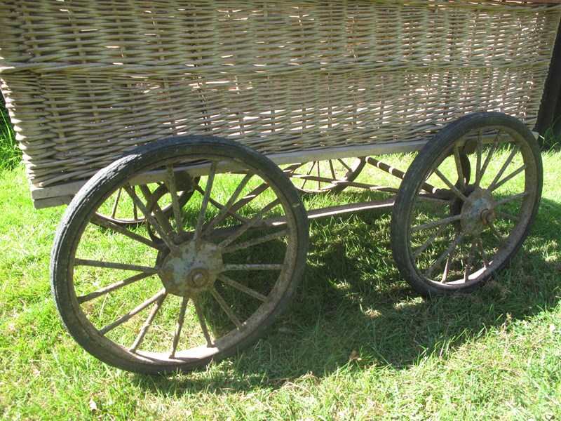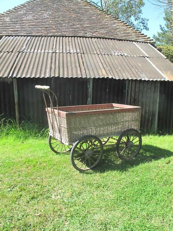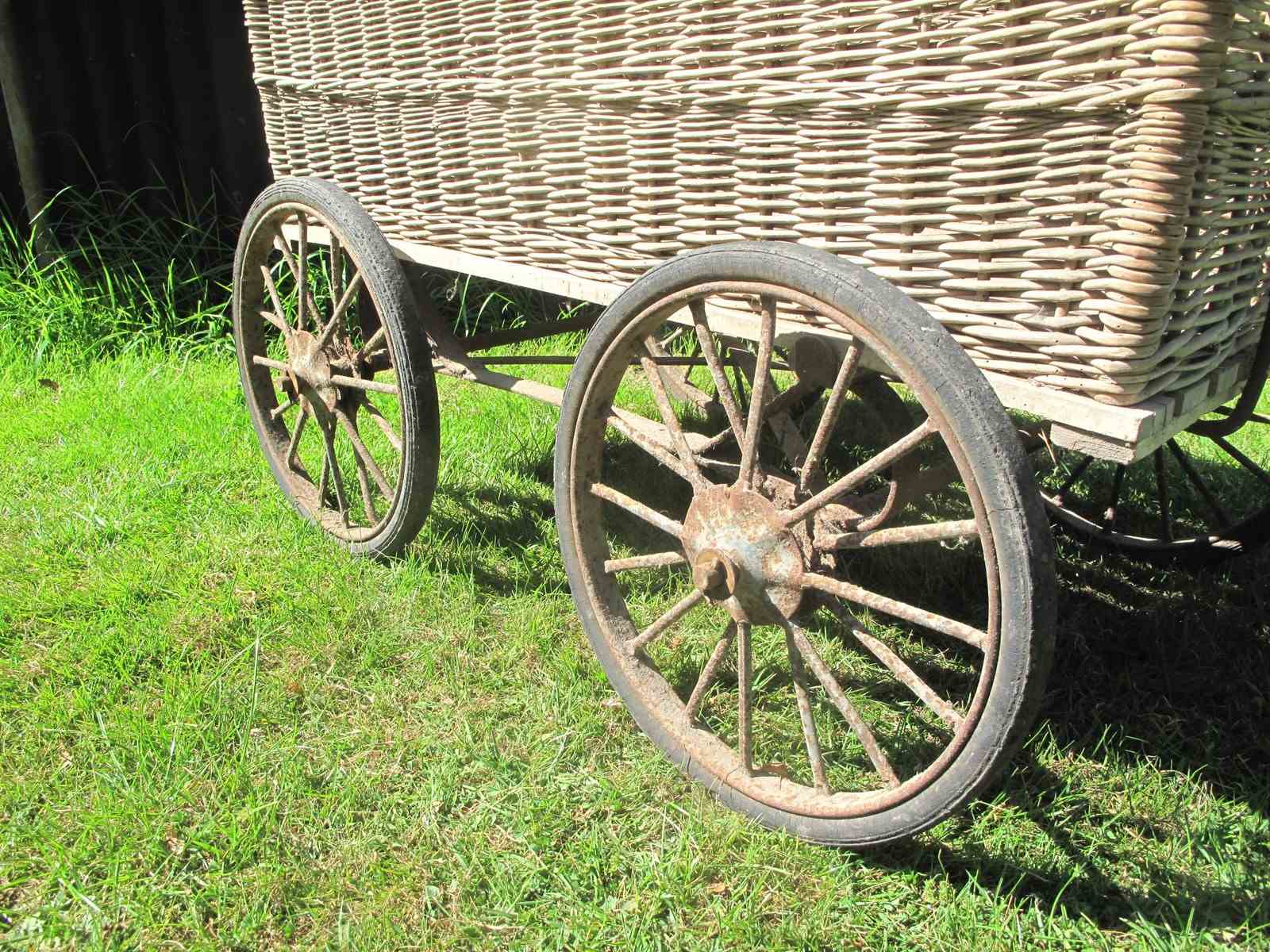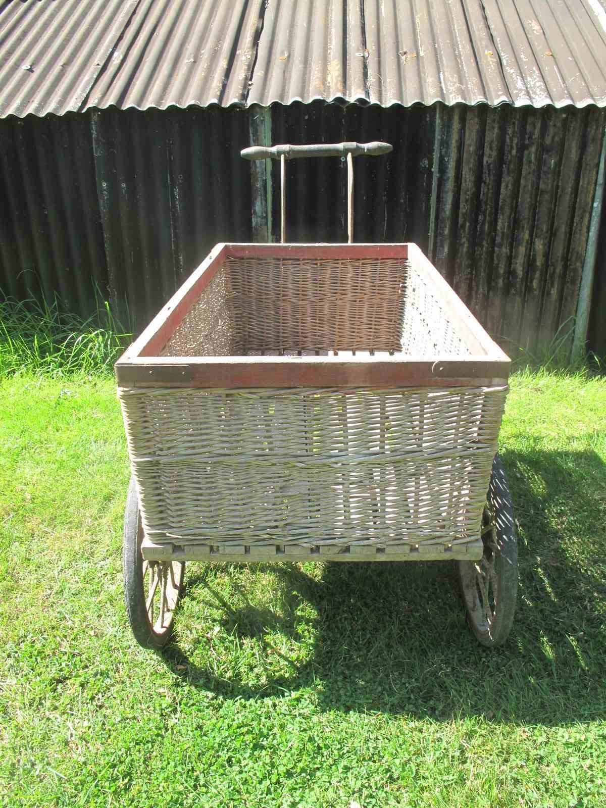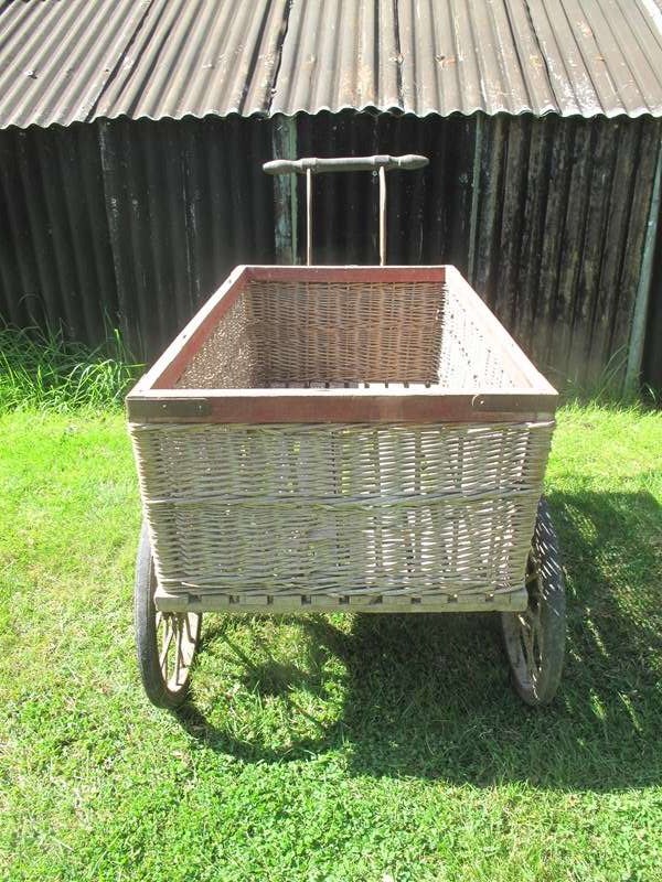 Original antique garden cart from Alsace Lorraine in eastern France. This is not a copy but an early 20th century cart in fantastic condition. The cart is on an iron axle with an iron and wooden beechwood handle, iron spoke wheels with solid rubber tyres. Original red painted framework surrounding the undamaged wicker basket. c.1920.