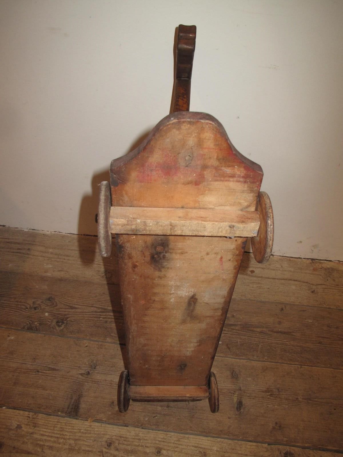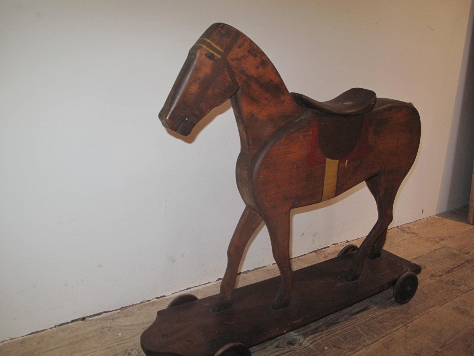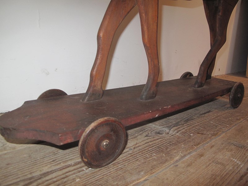 Antique wooden horse mounted on a wheeled base. The wheels move freely on the base. c.1880.