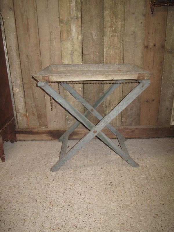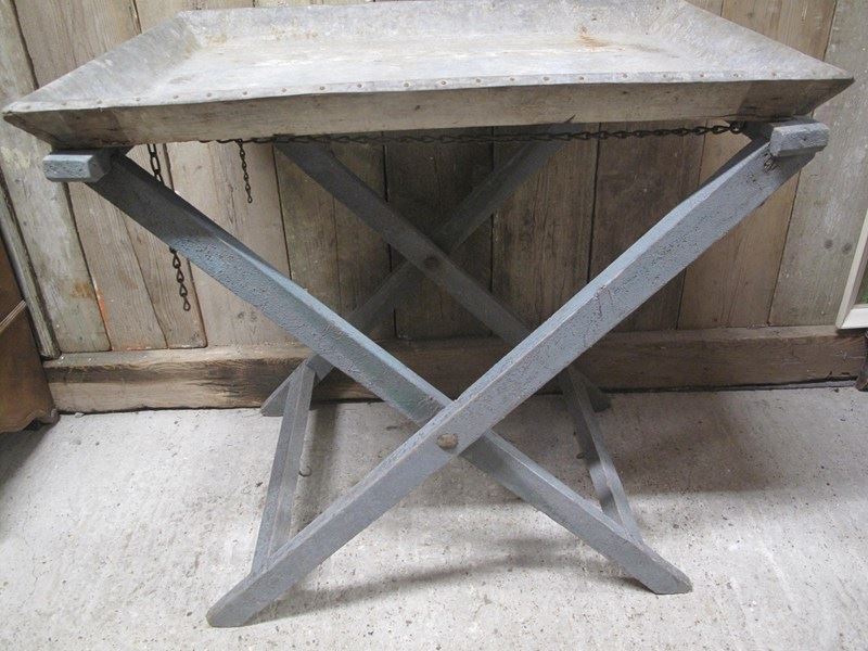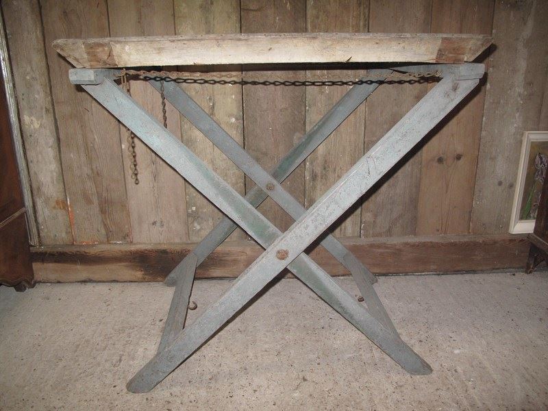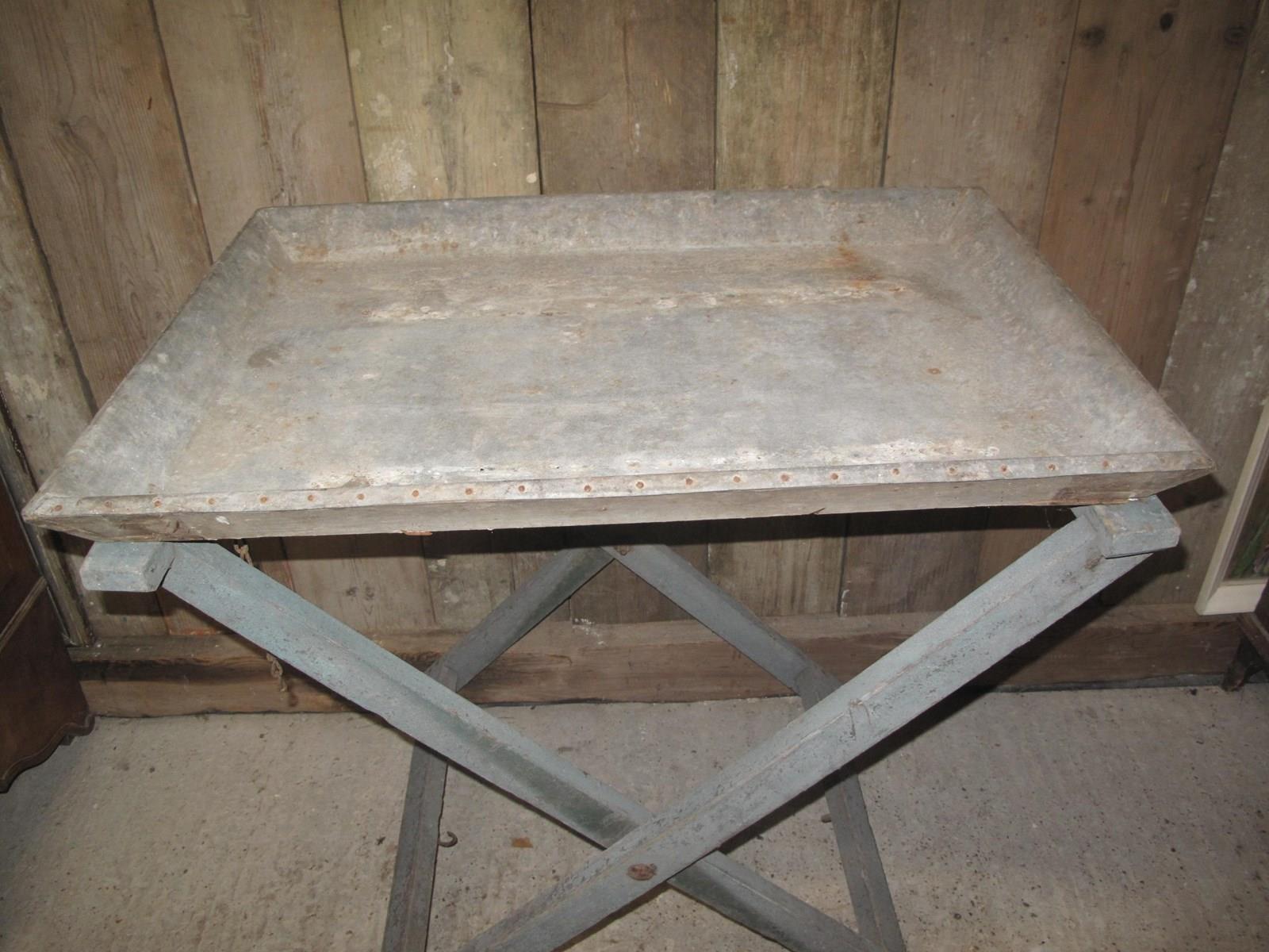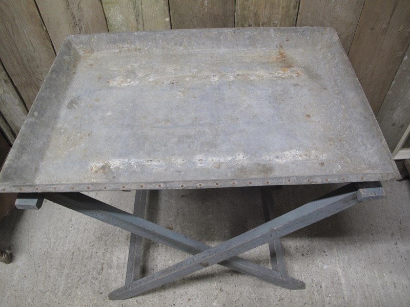 Unusual folding potting table in its original paint and its original zinc tray.