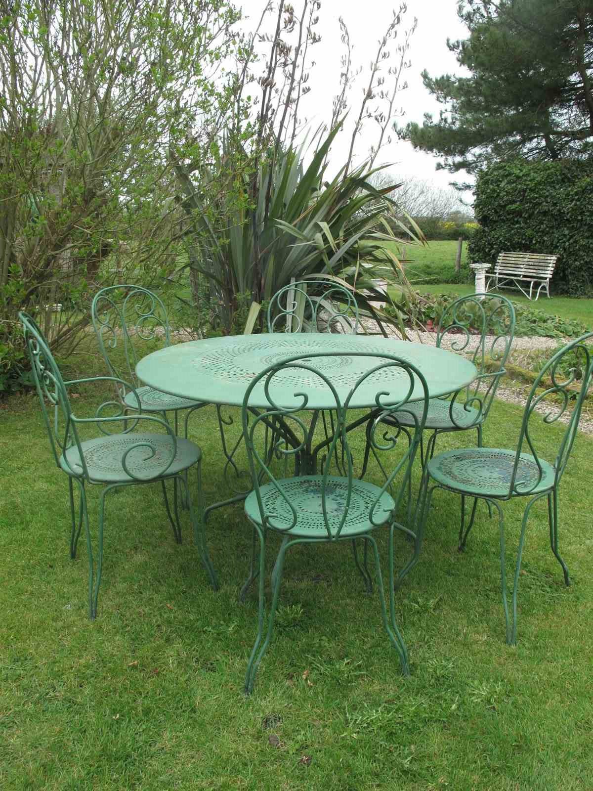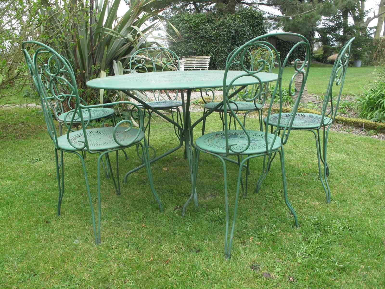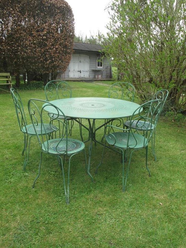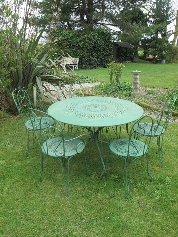 Garden table and six chairs in the original factory green paint. The table and chairs are all in really good condition. The measurement is for the table.
