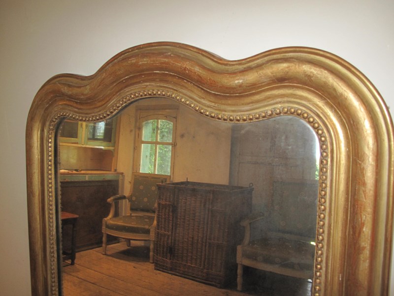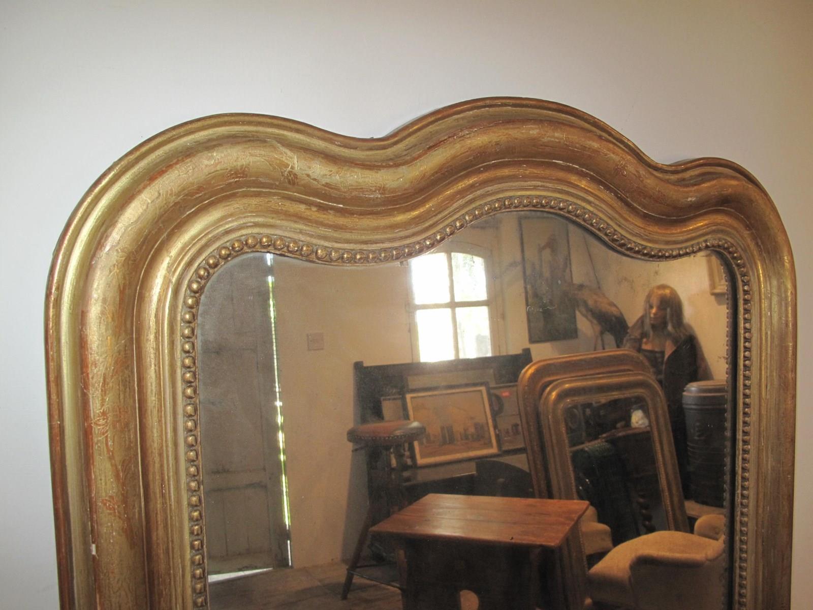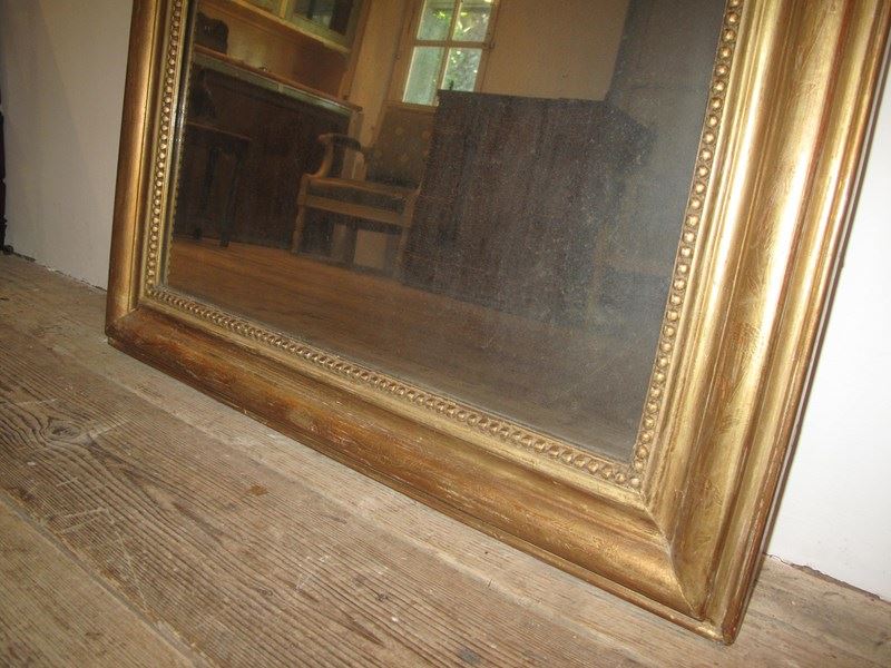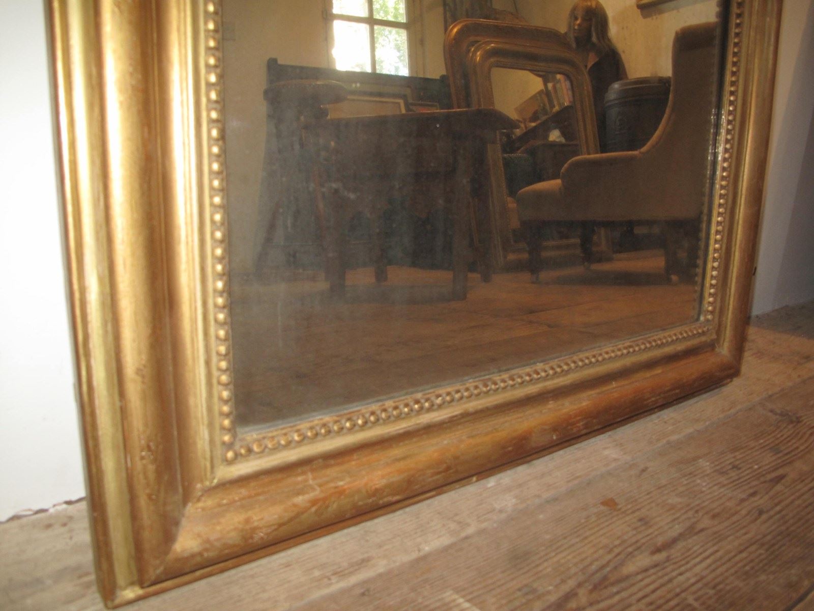 Large antique gilt mirror in good condition. The mirror has its original glass, gilding, and backboards. Mid 19th century.