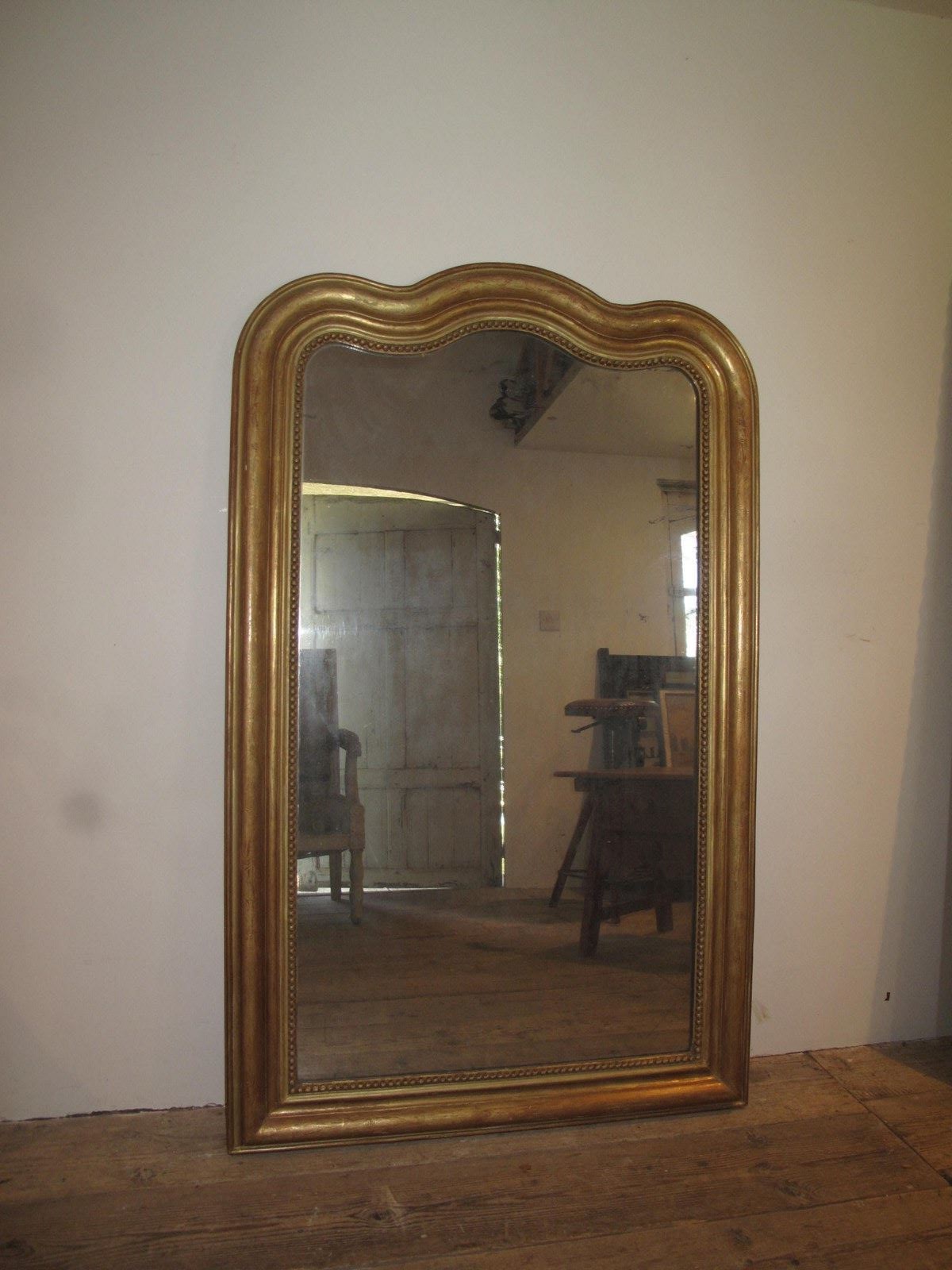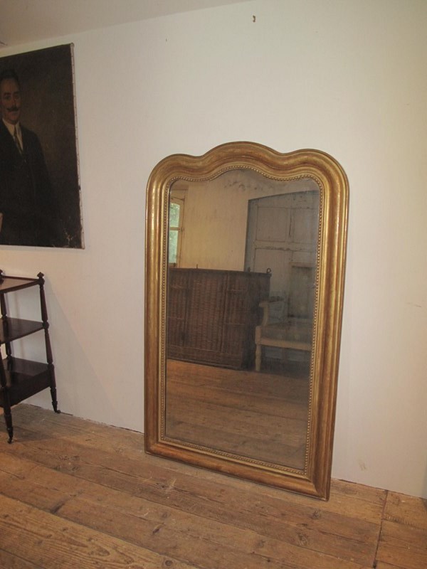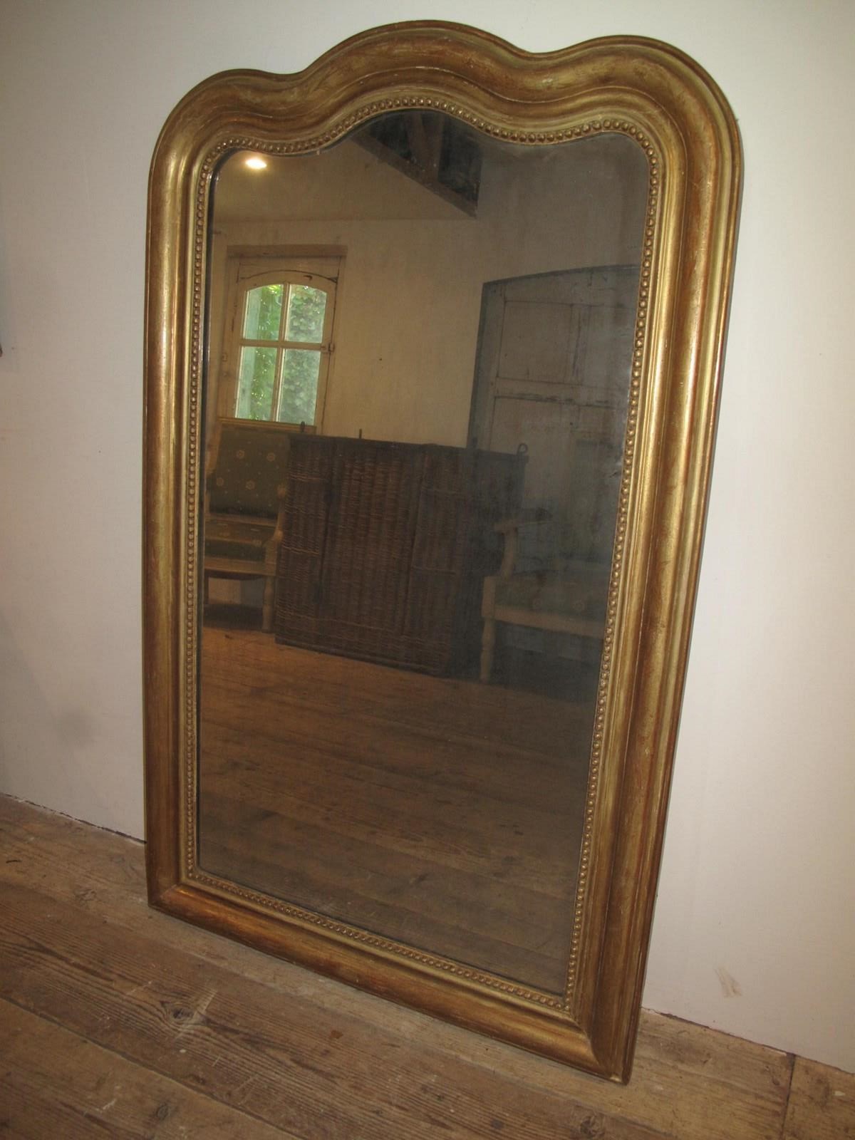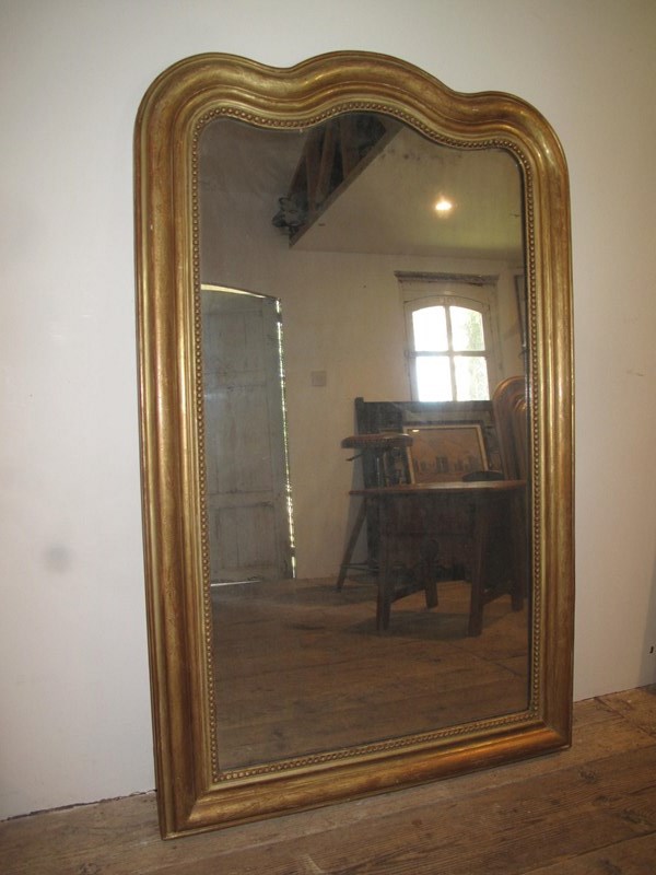 Large antique gilt mirror in good condition. The mirror has its original glass, gilding, and backboards. Mid 19th century.