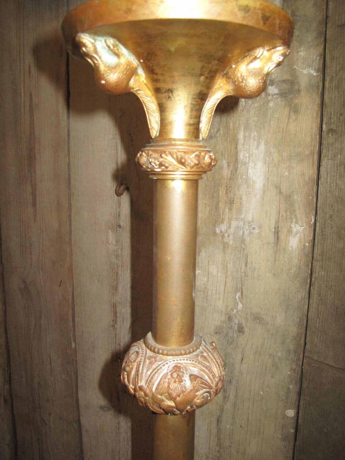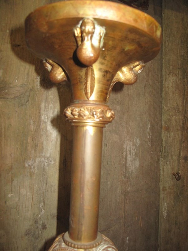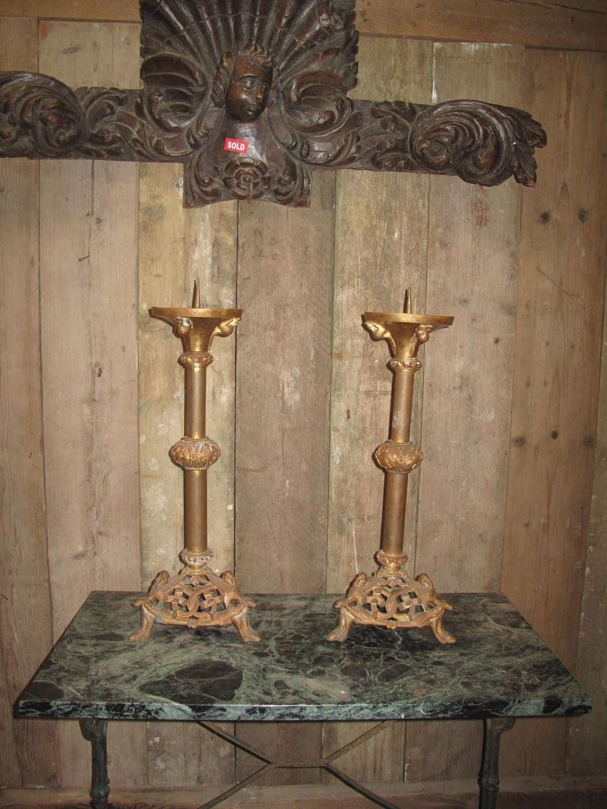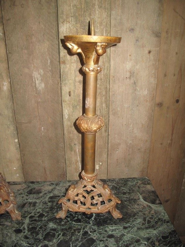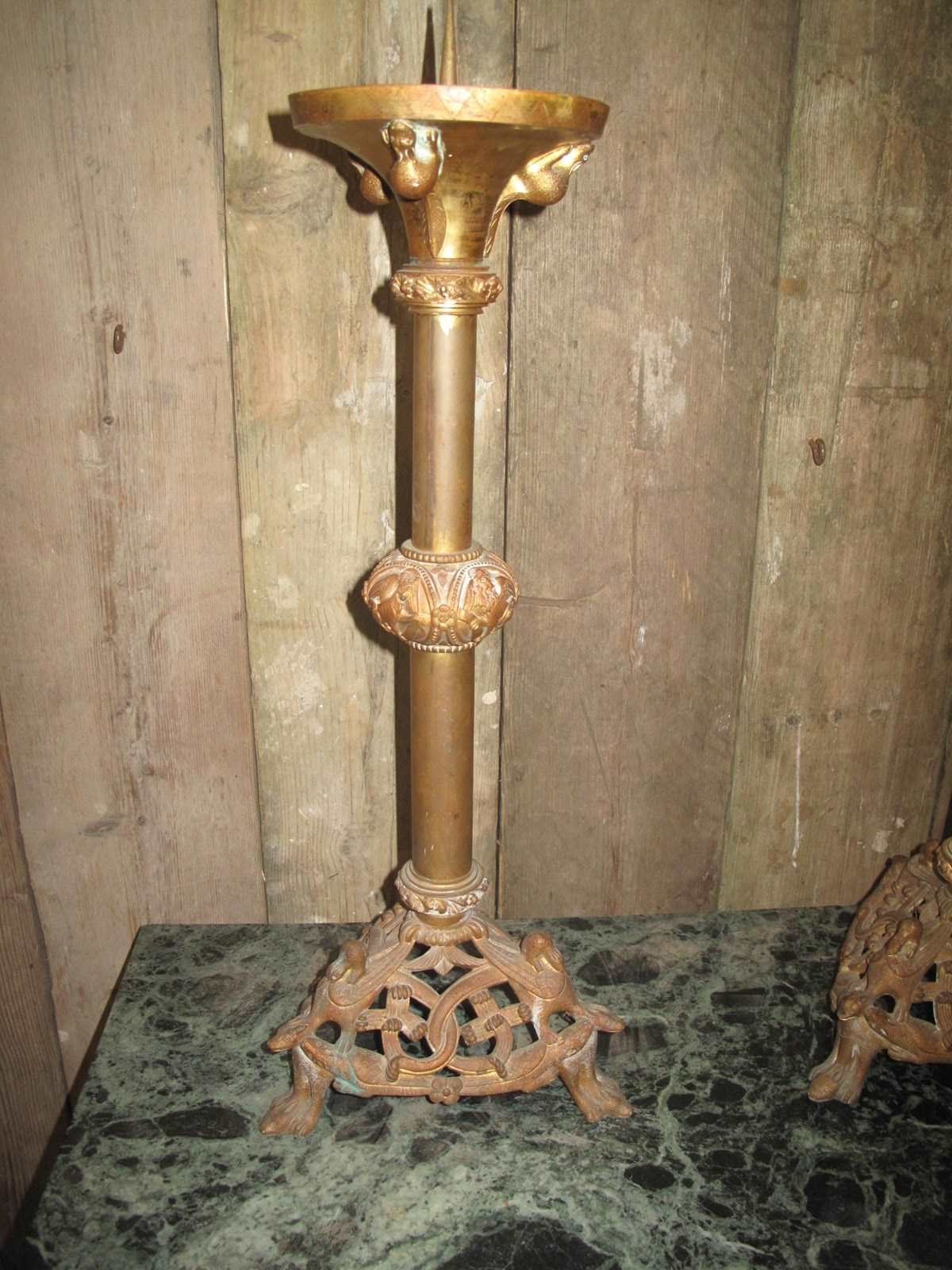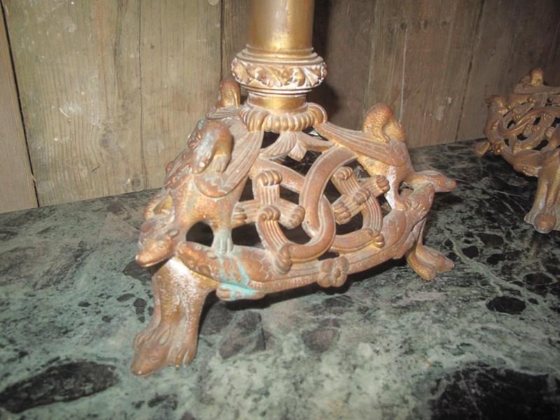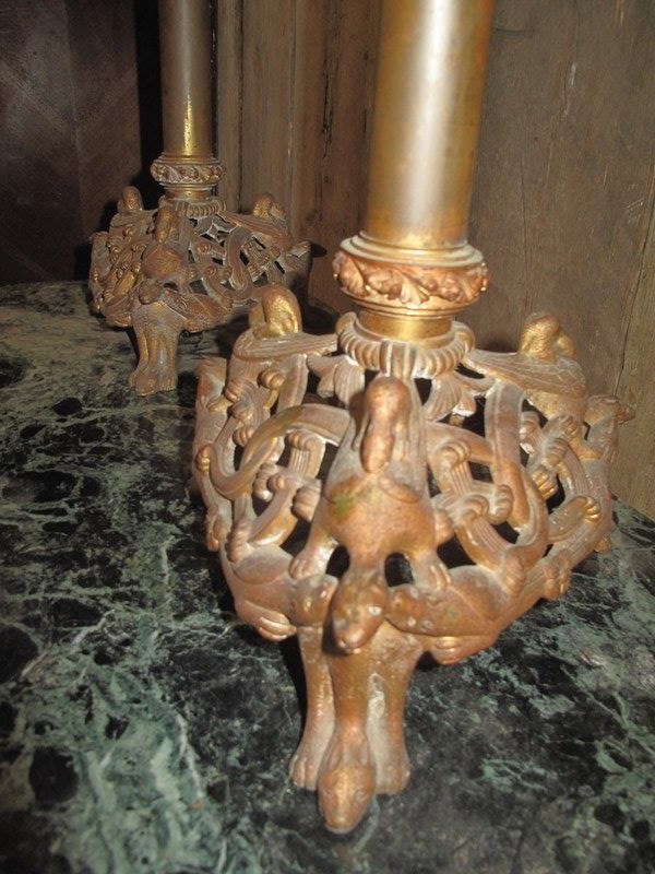 Large pair of ormulu brass pricket candlesticks. Pair of really unusual candlesticks in good condition decorated with mythological creatures.