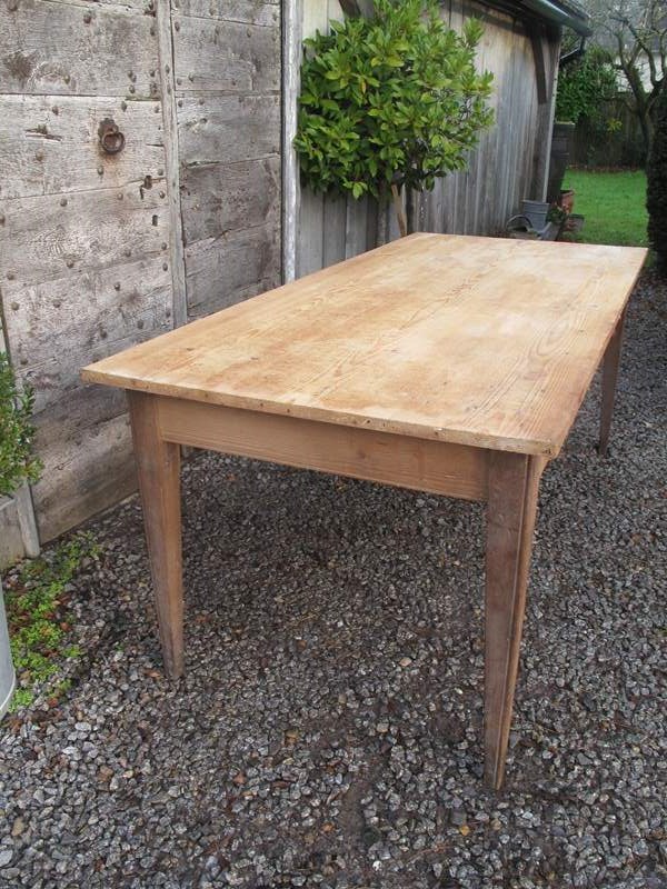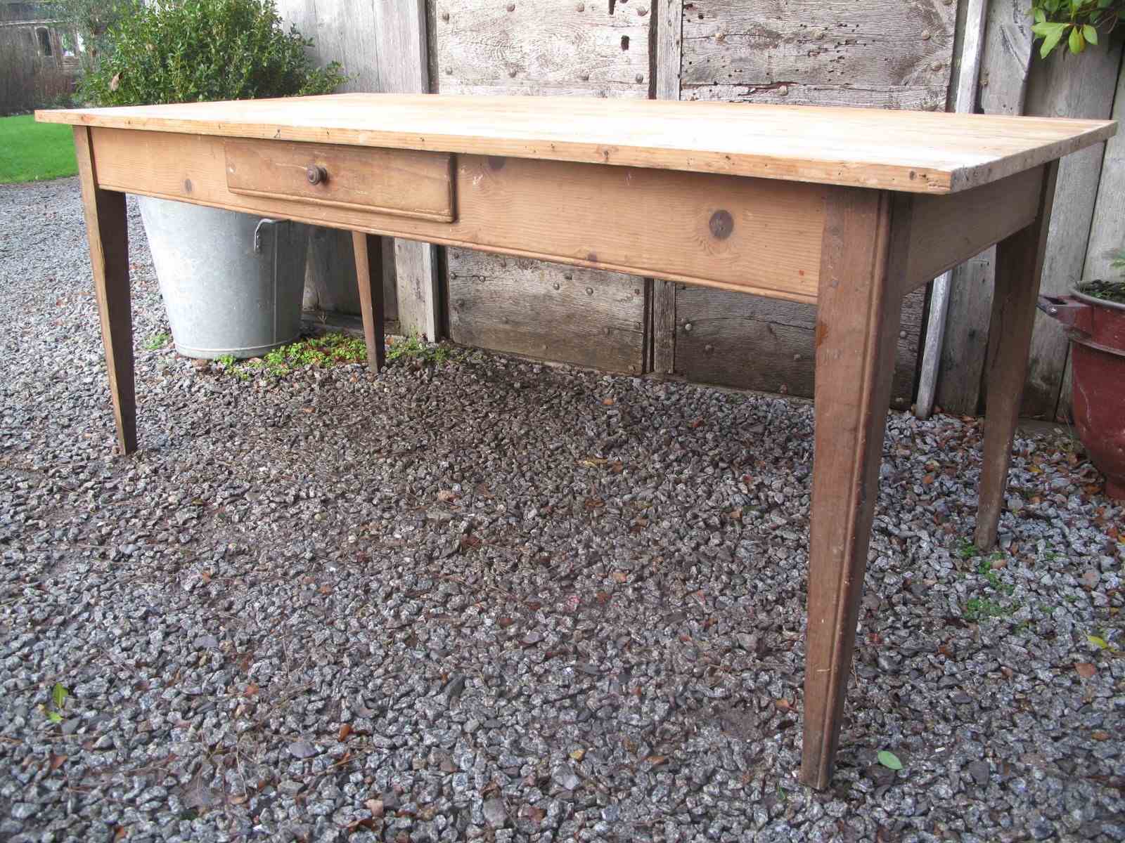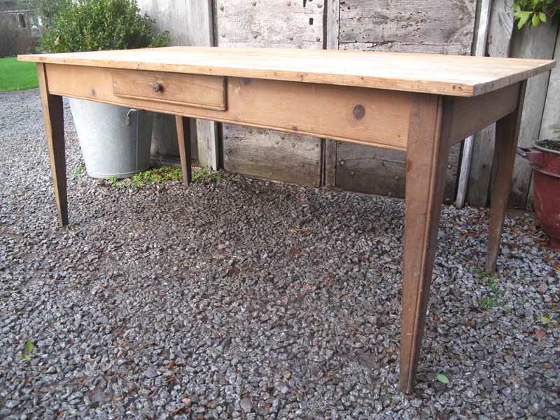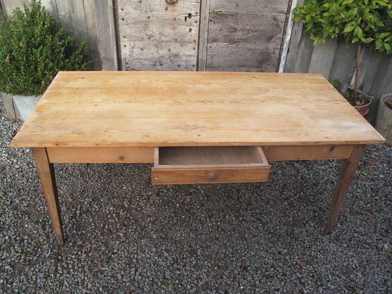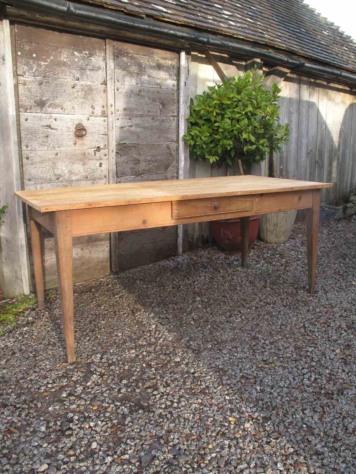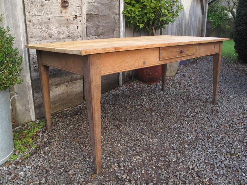 A good sturdy antique farm table with a pine top and a fruitwood base. The table has a single central drawer that slides easily.