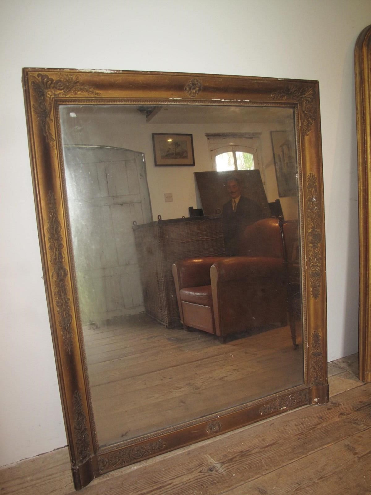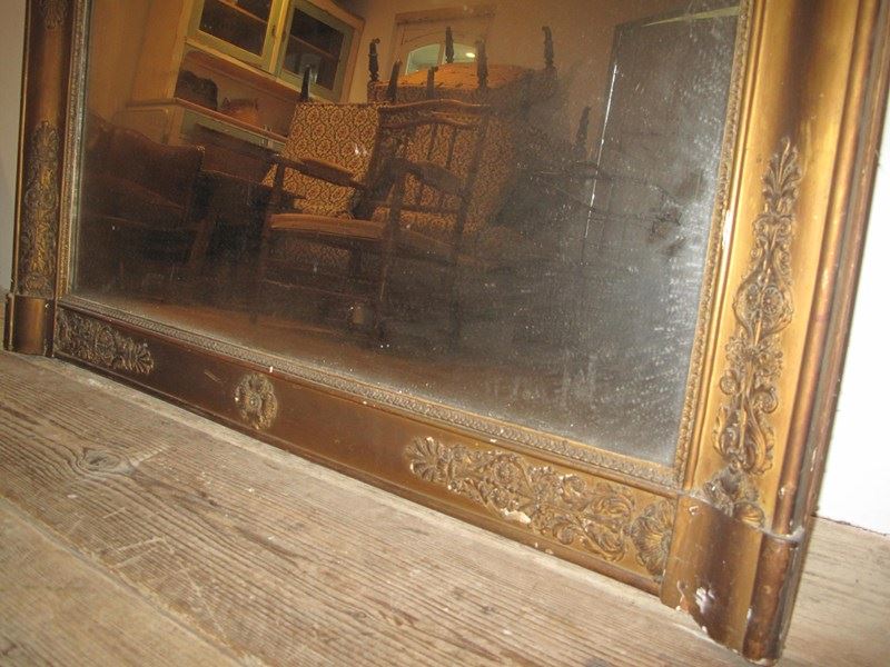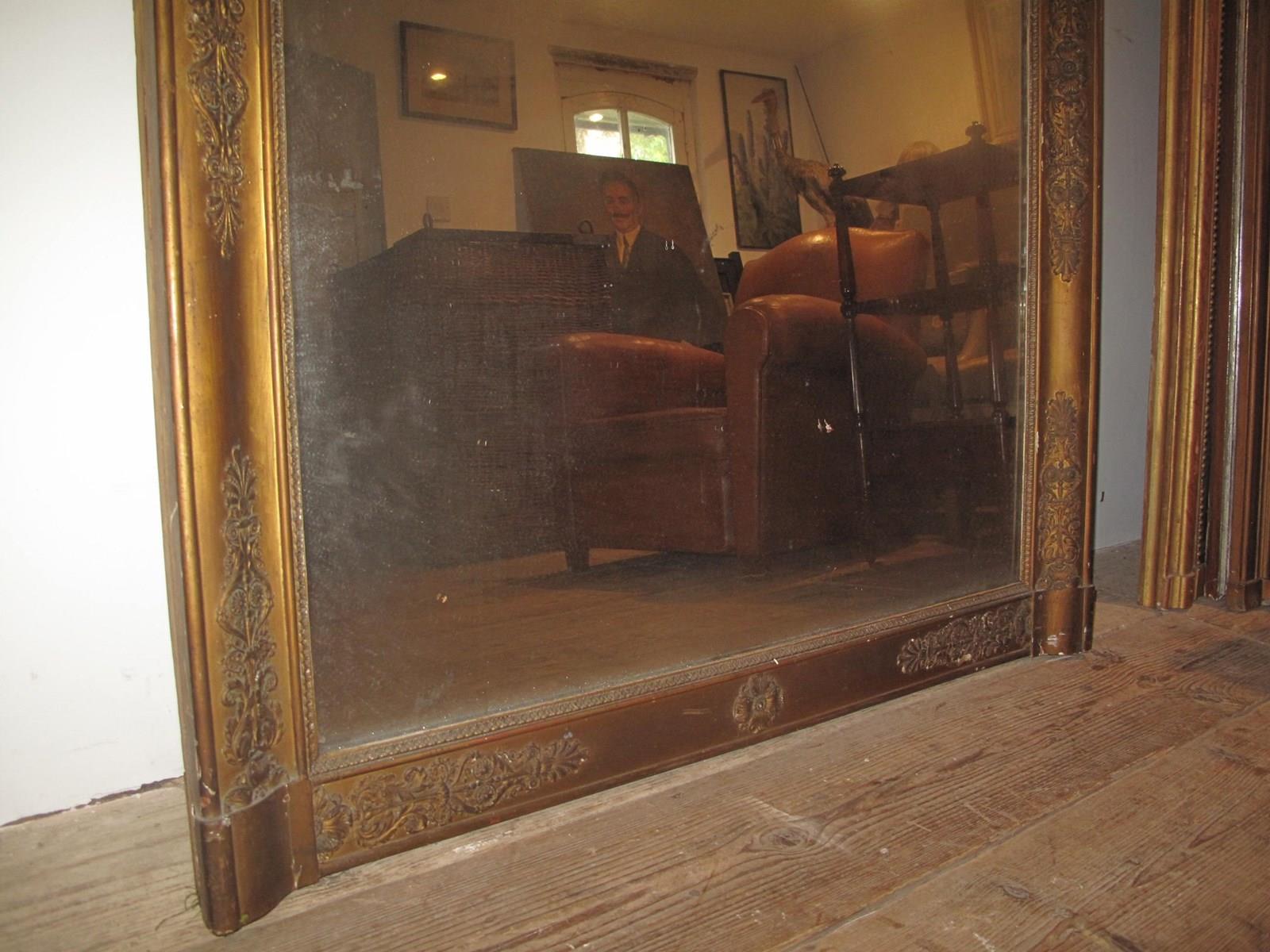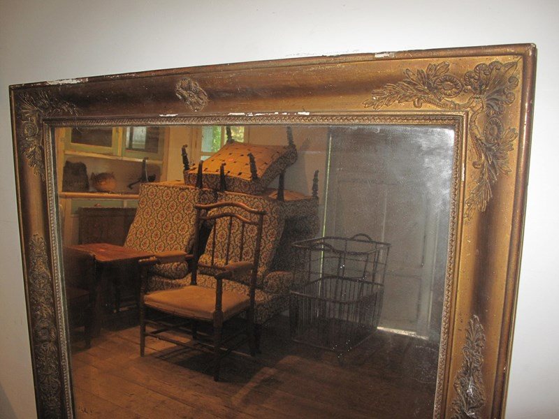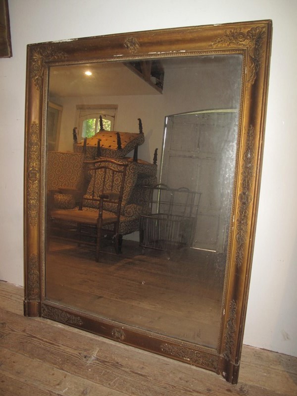 Large antique mirror with its original faded gilt finish. The mirror also has its original glass and back panel.