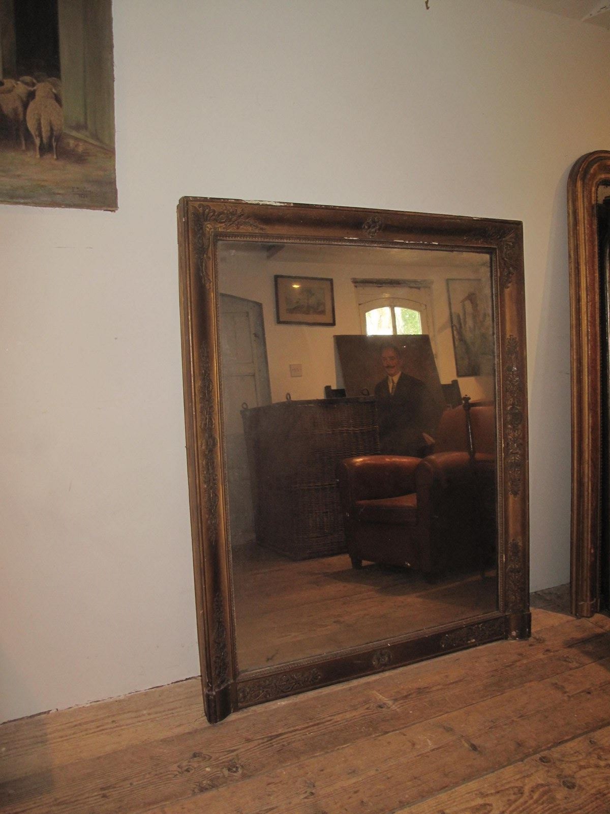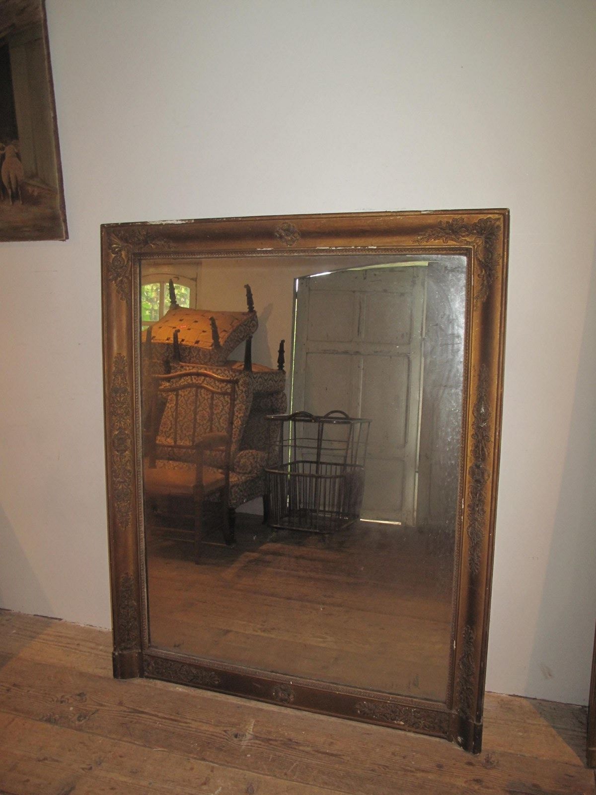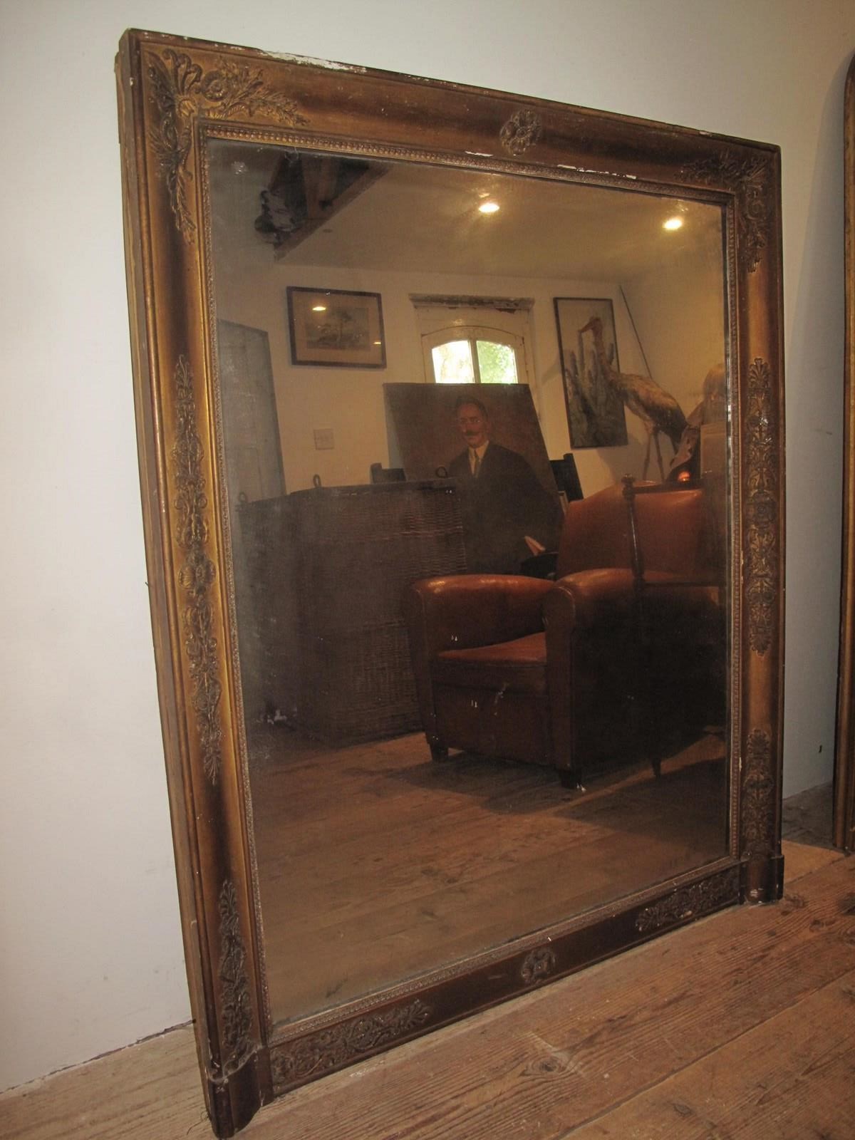 Large antique mirror with its original faded gilt finish. The mirror also has its original glass and back panel.