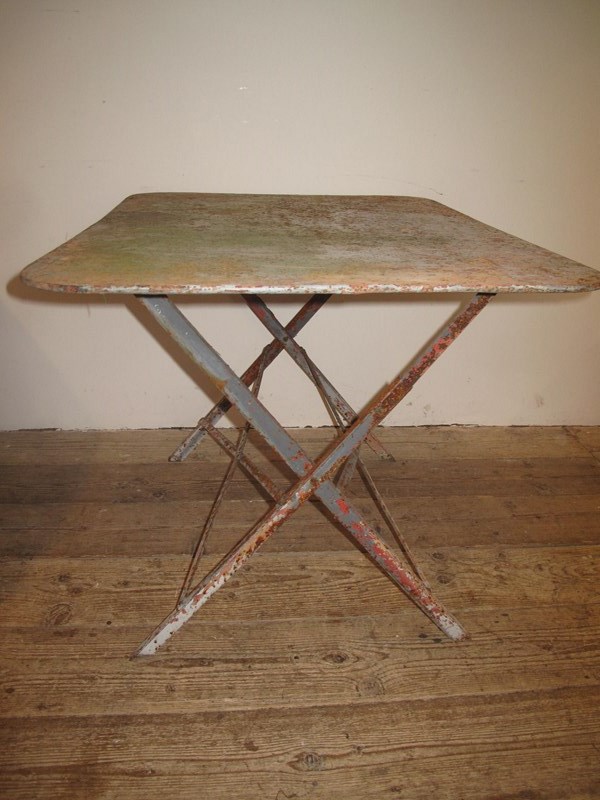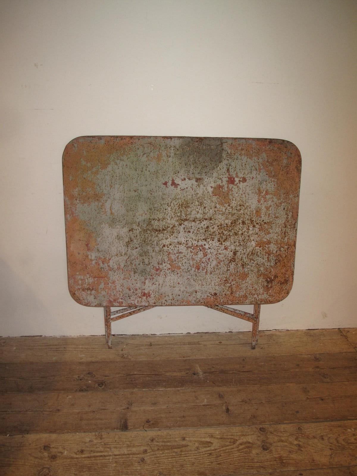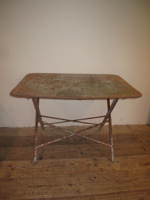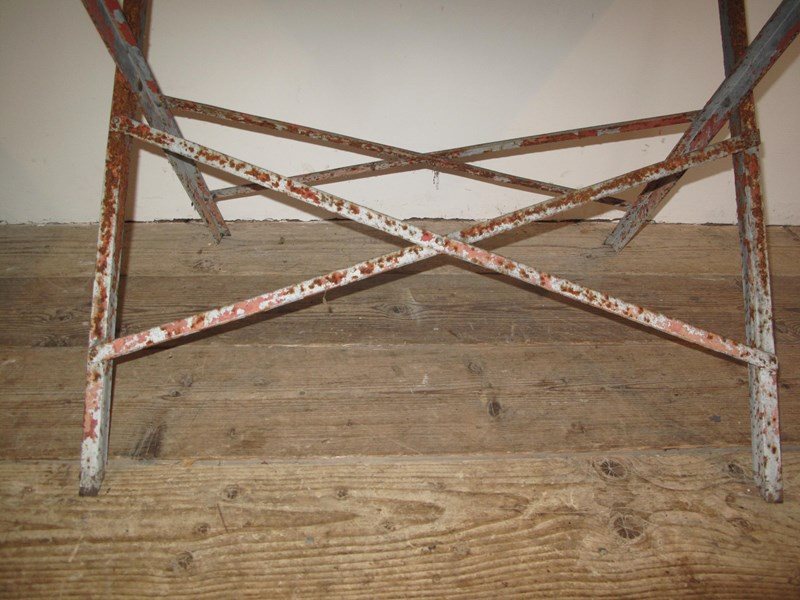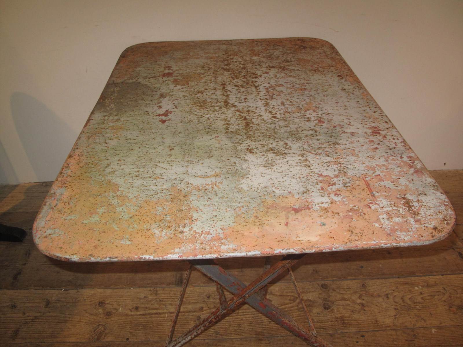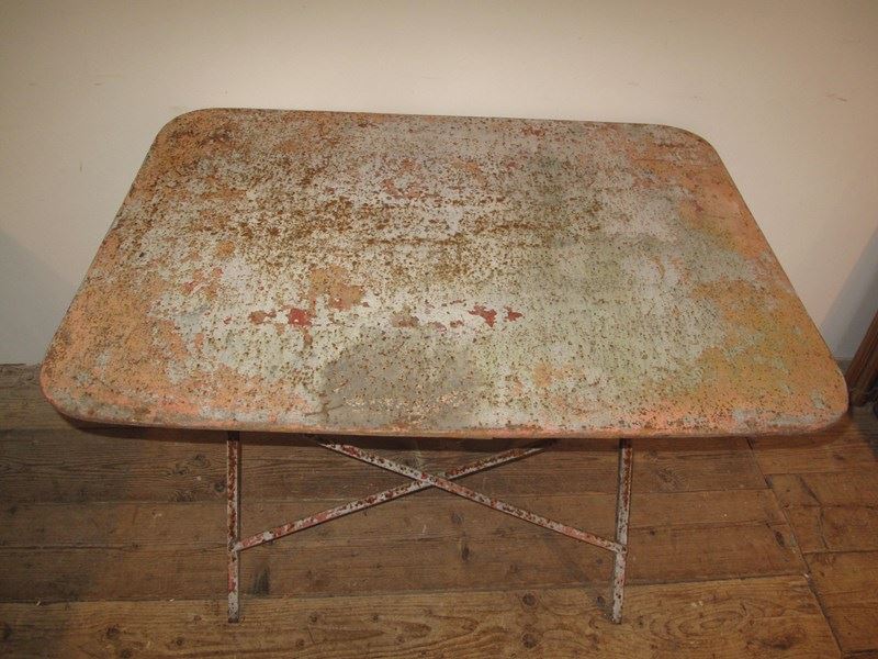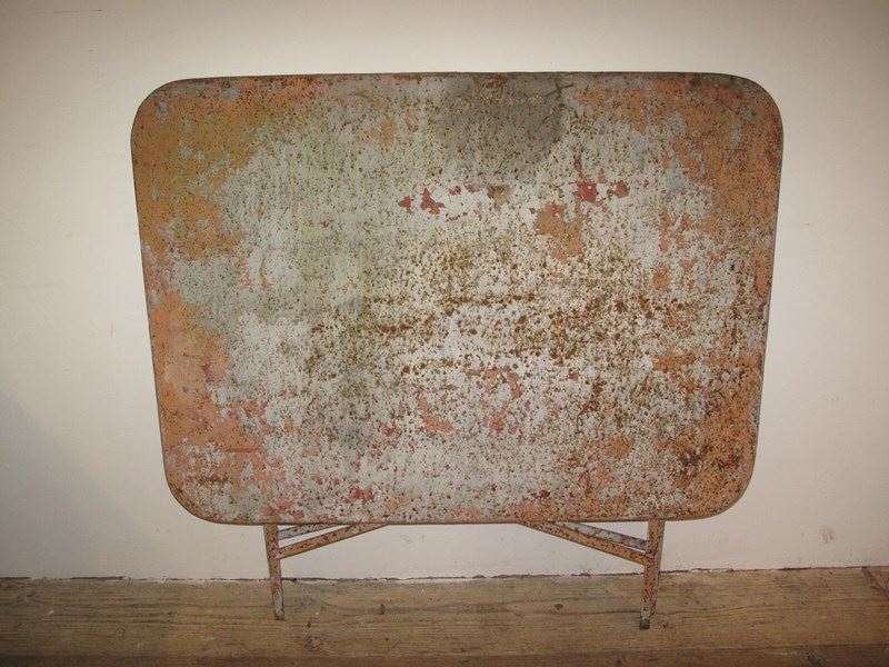 Large folding iron table with its original flaky paint. The table can be used inside or out. The table is in good condition and folds easily. c.1890.