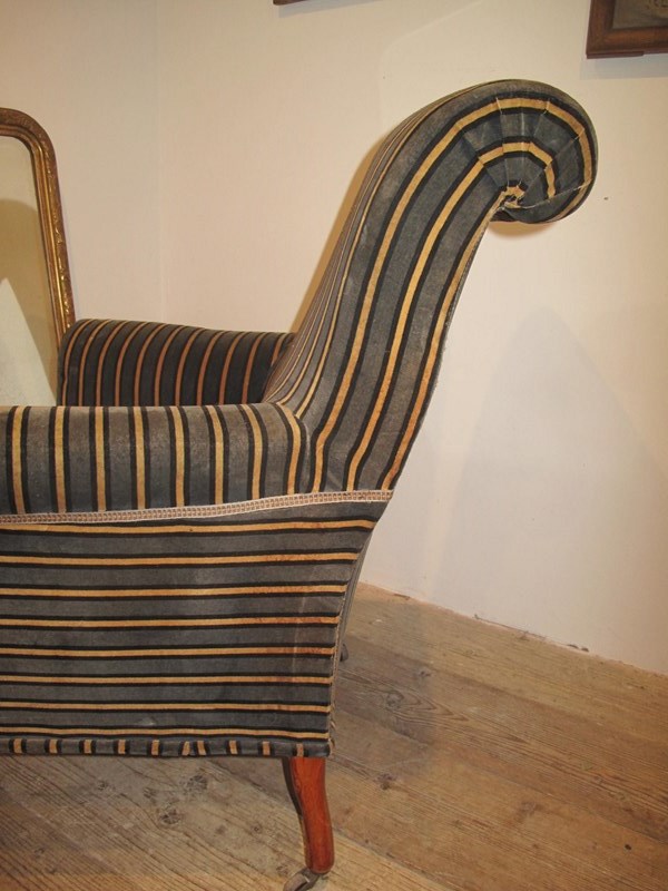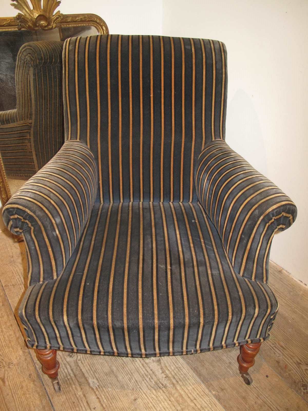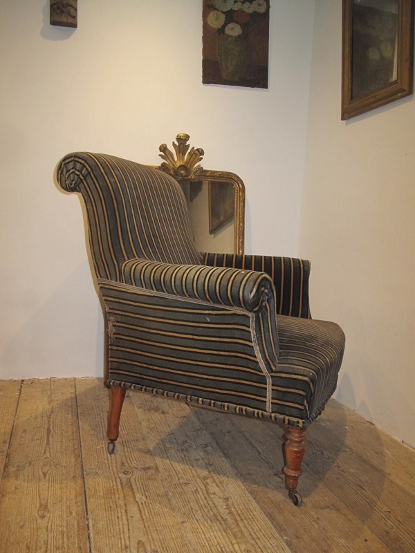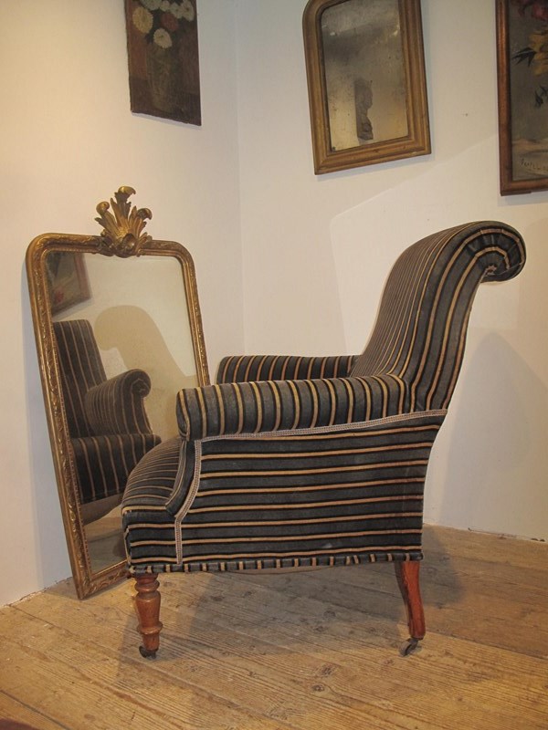 Large comfy Napoleon III chair in its original fabric. The chair is on its original free wheeling castors and has good springs and upholstery. c.1890.