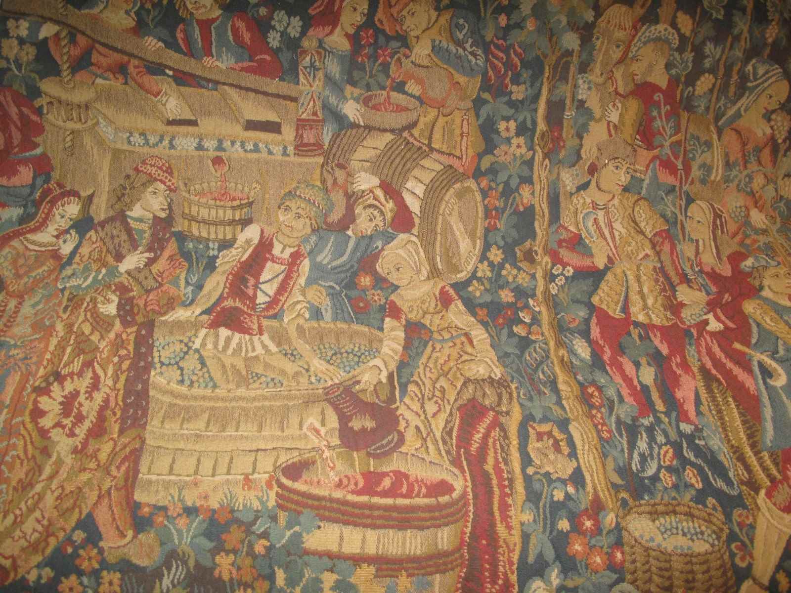 Good quality vineyard tapestry/wall hanging depicting grape picking and pressing by medieval villages. This top quality tapestry is in excellent condition. Early 20th century.