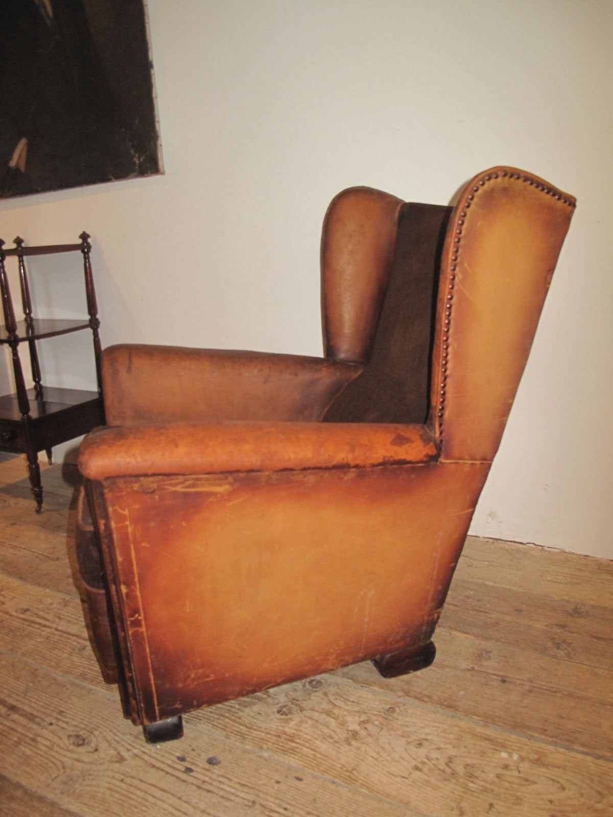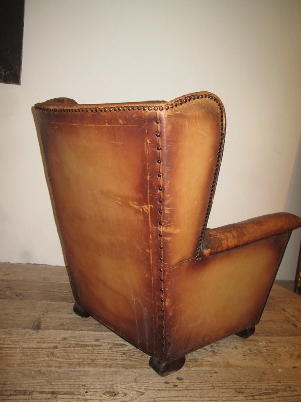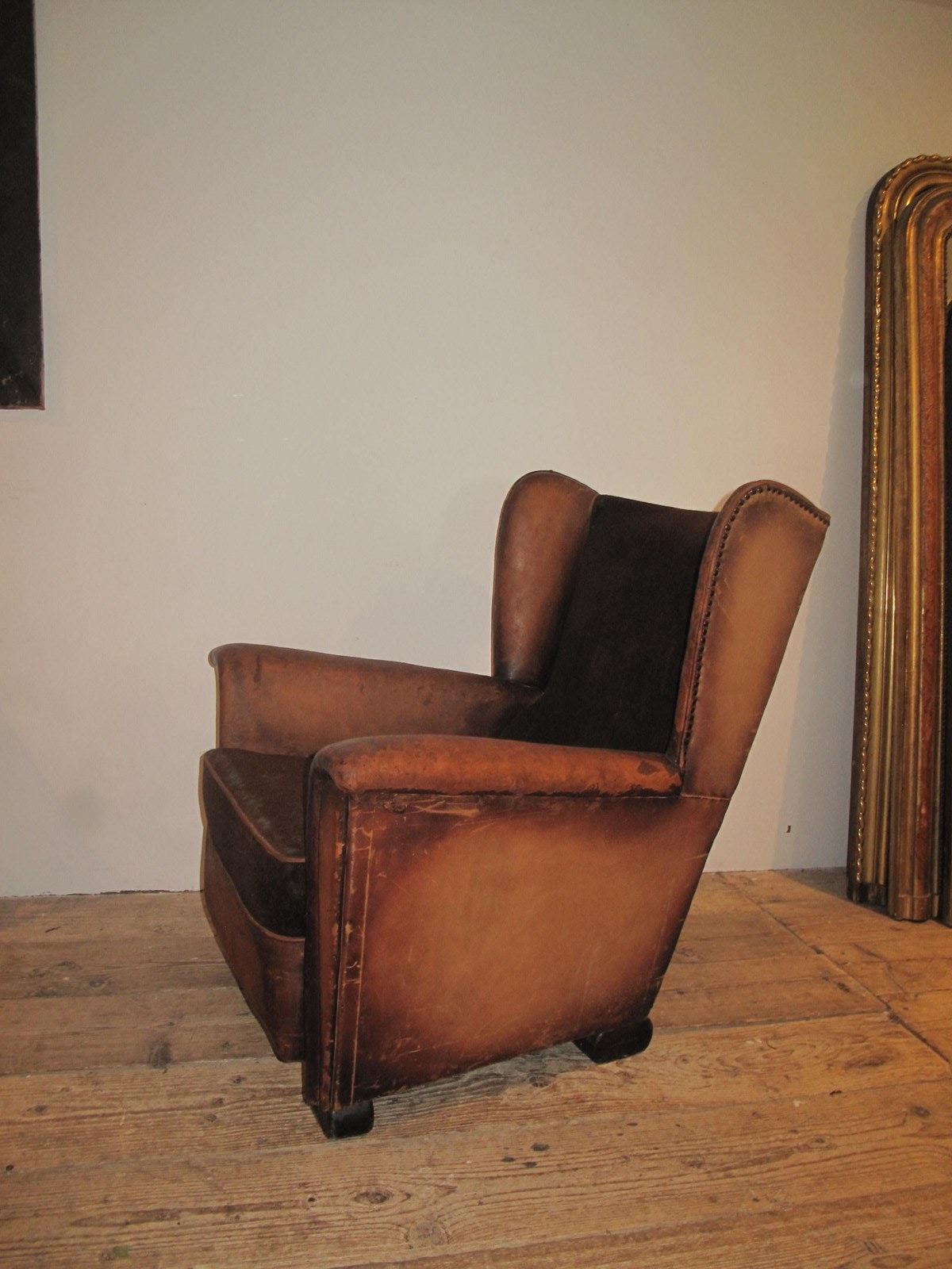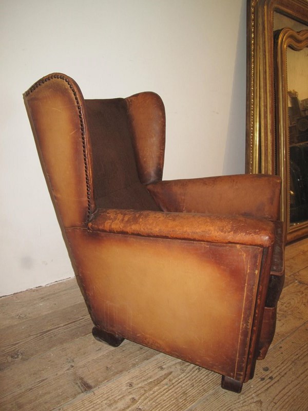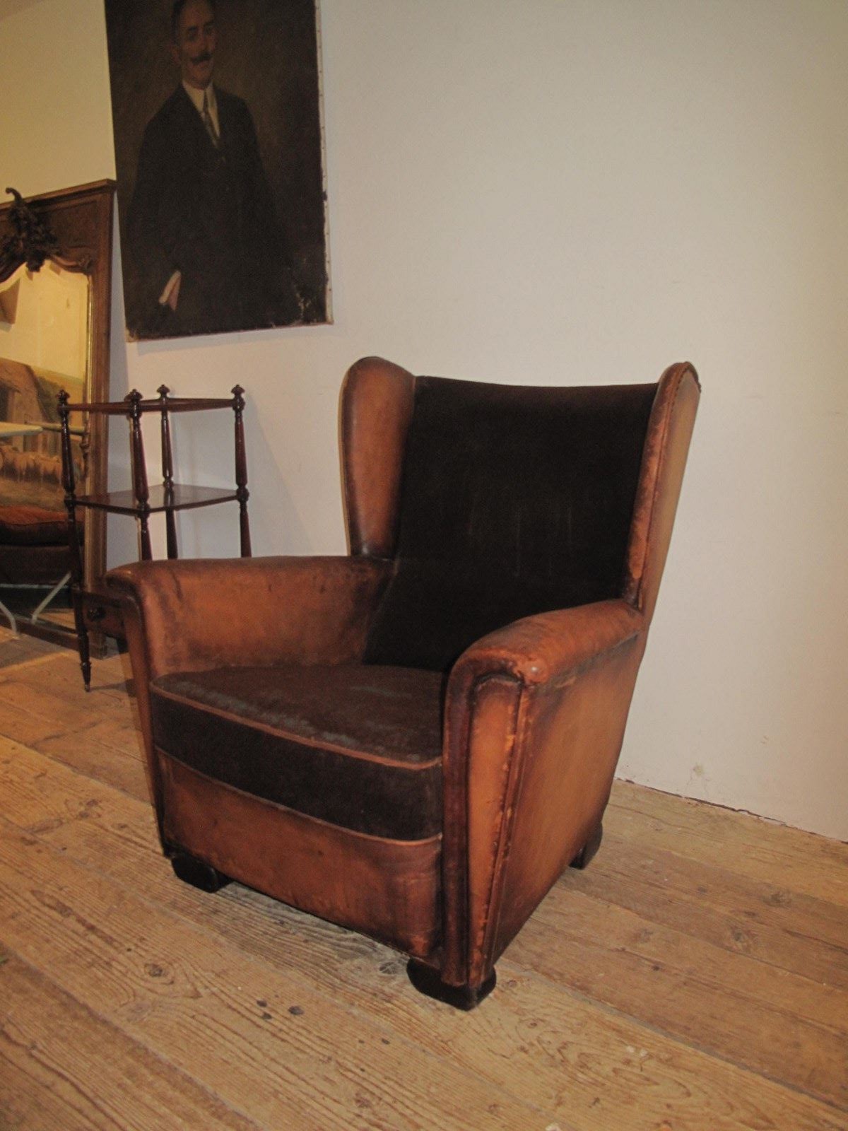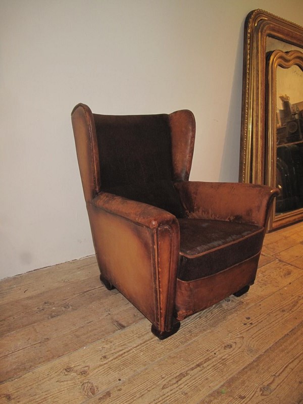 Unusual leather and velvet wing chair. The chair is totally original and has not been changed in any way. The chair is very comfortable and in good sturdy condition. c.1920.
