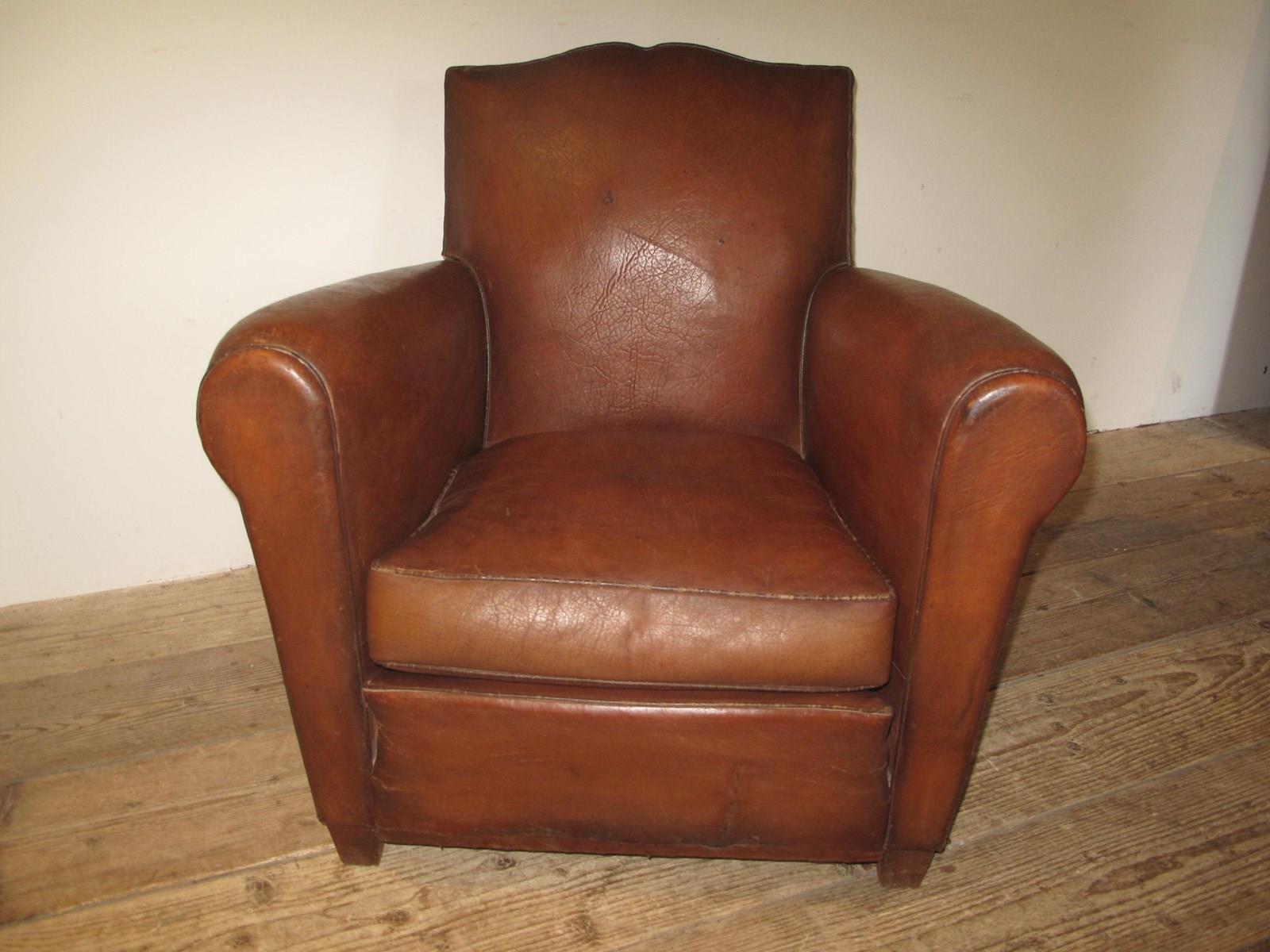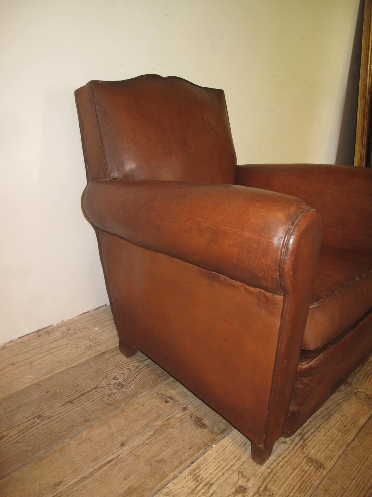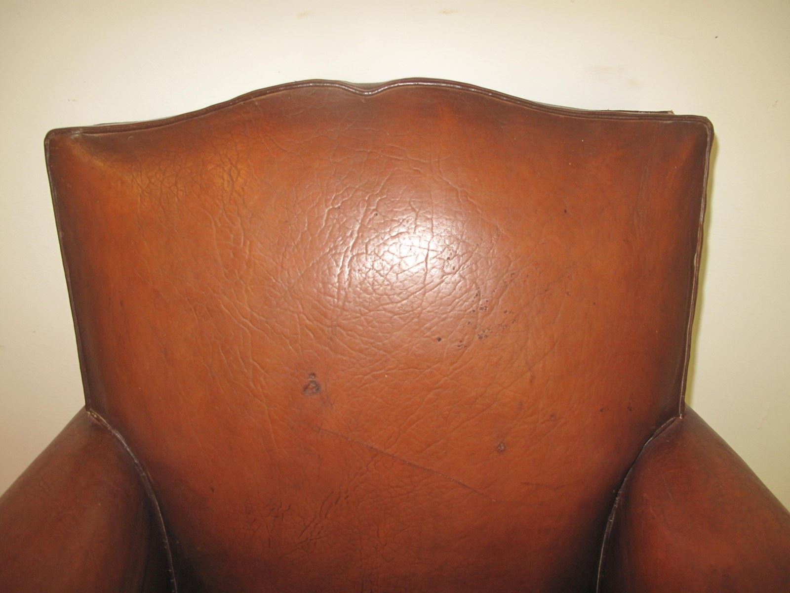 Leather club chair with the desirable moustache back. This sturdy leather chair is in good condition. c.1950.