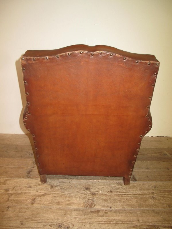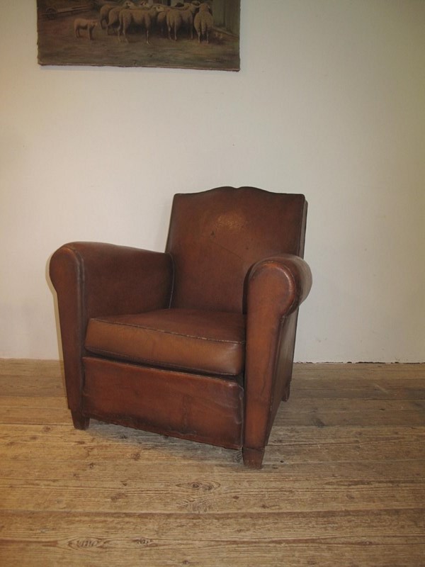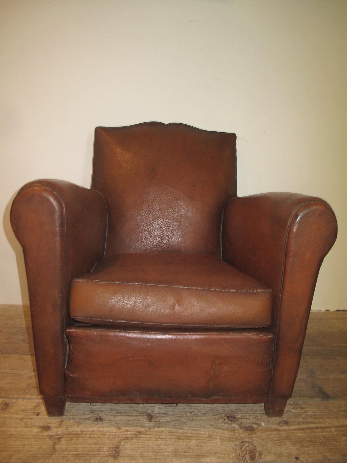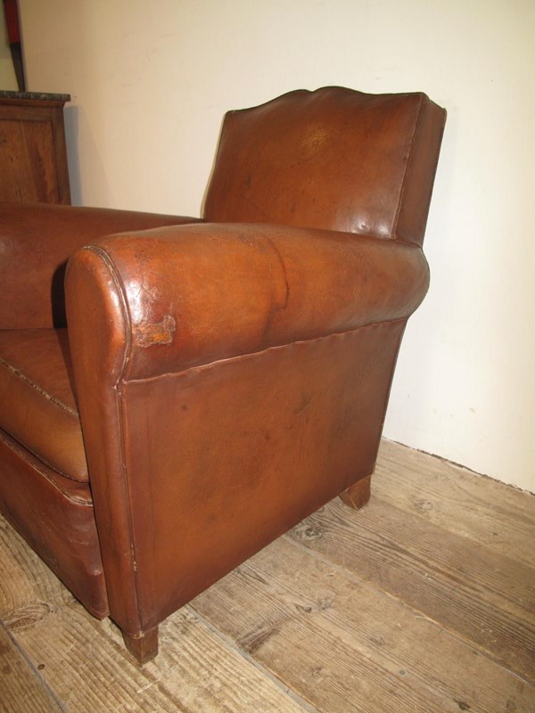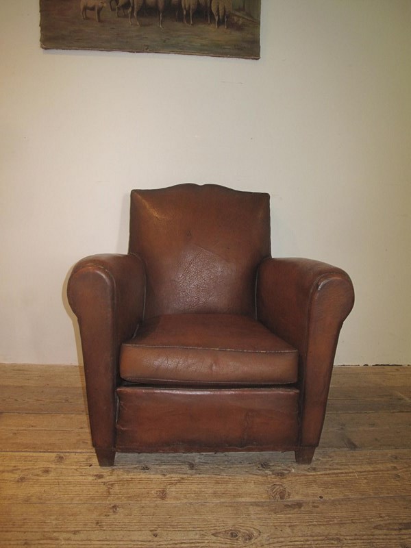 Leather club chair with the desirable moustache back. This sturdy leather chair is in good condition. c.1950.