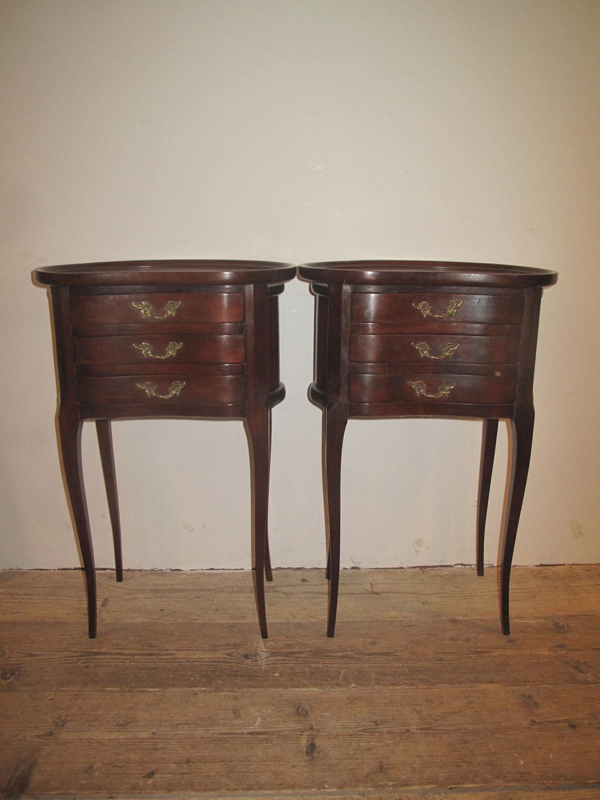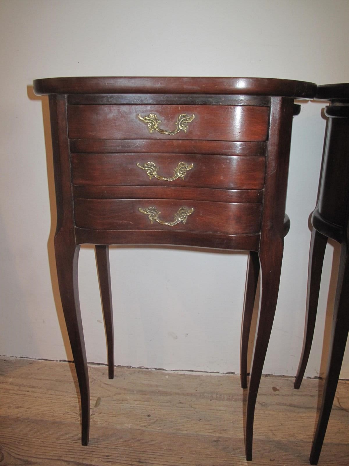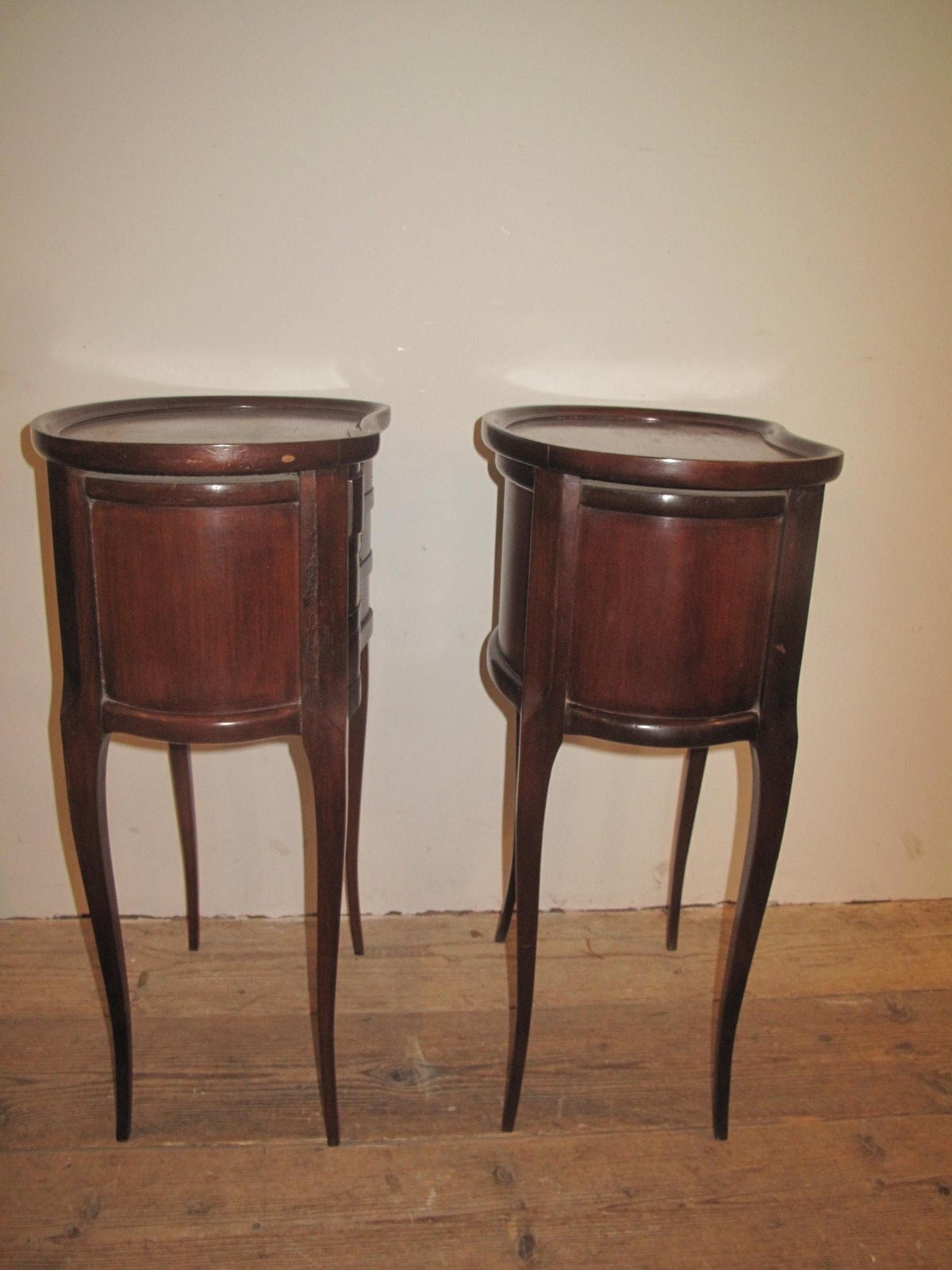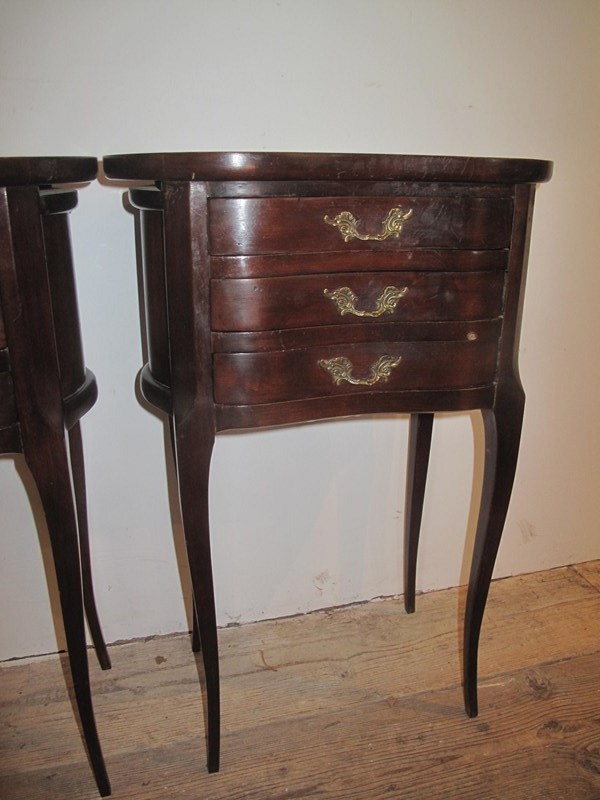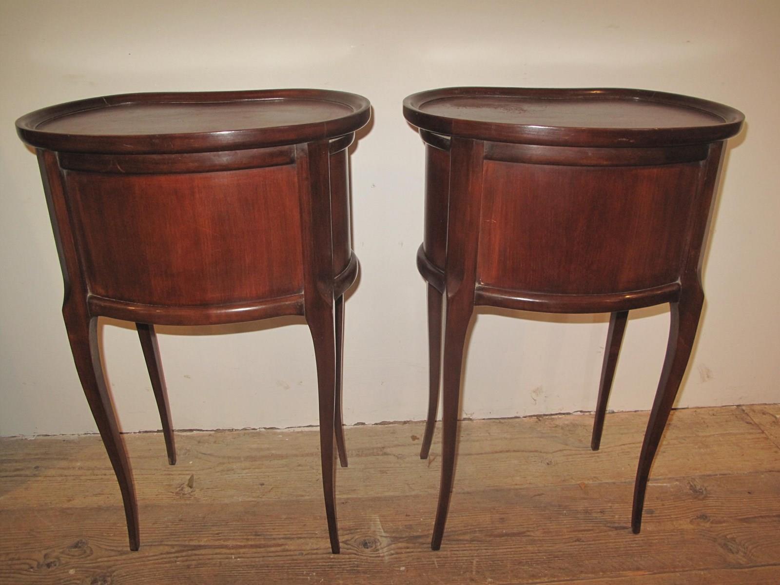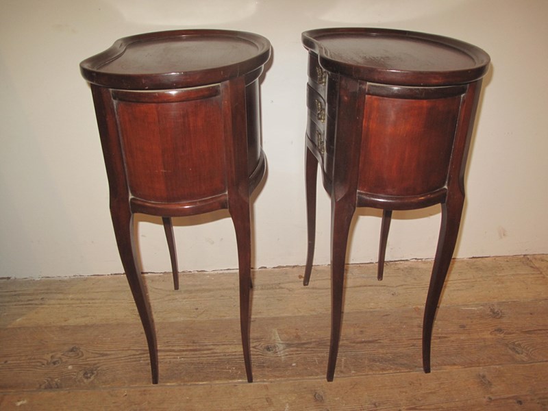 Pair of early 20th century kidney shaped bedside cabinets with brass handles. The cabinets are in good order and of the drawers slide easily.