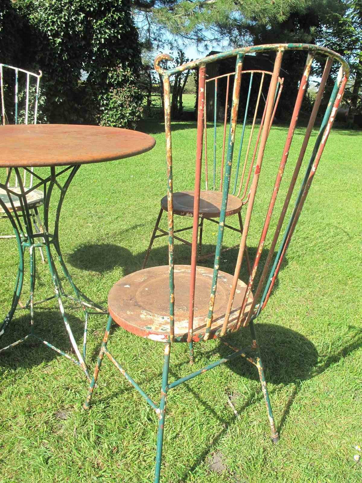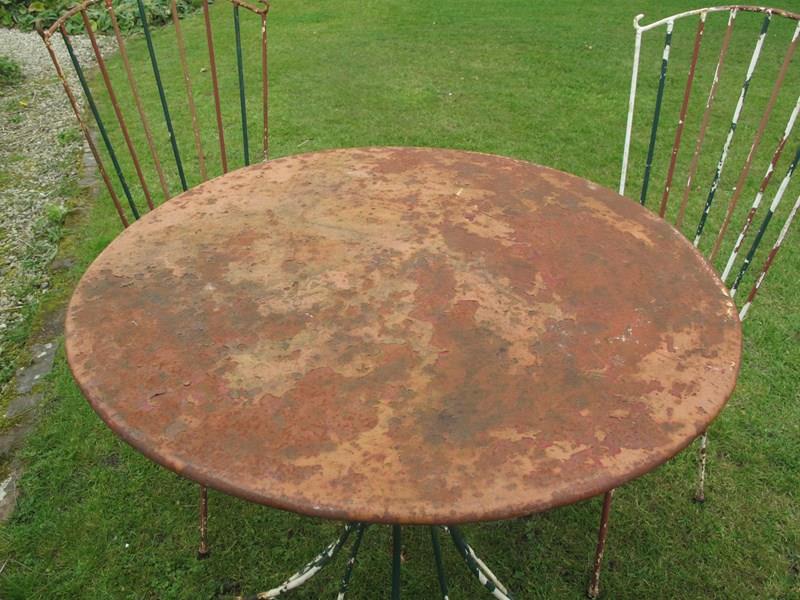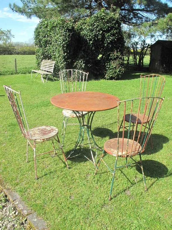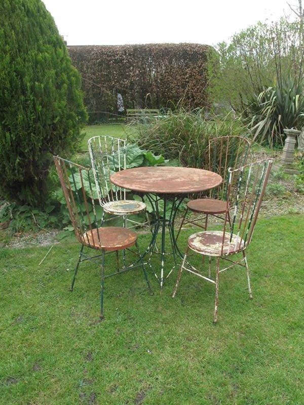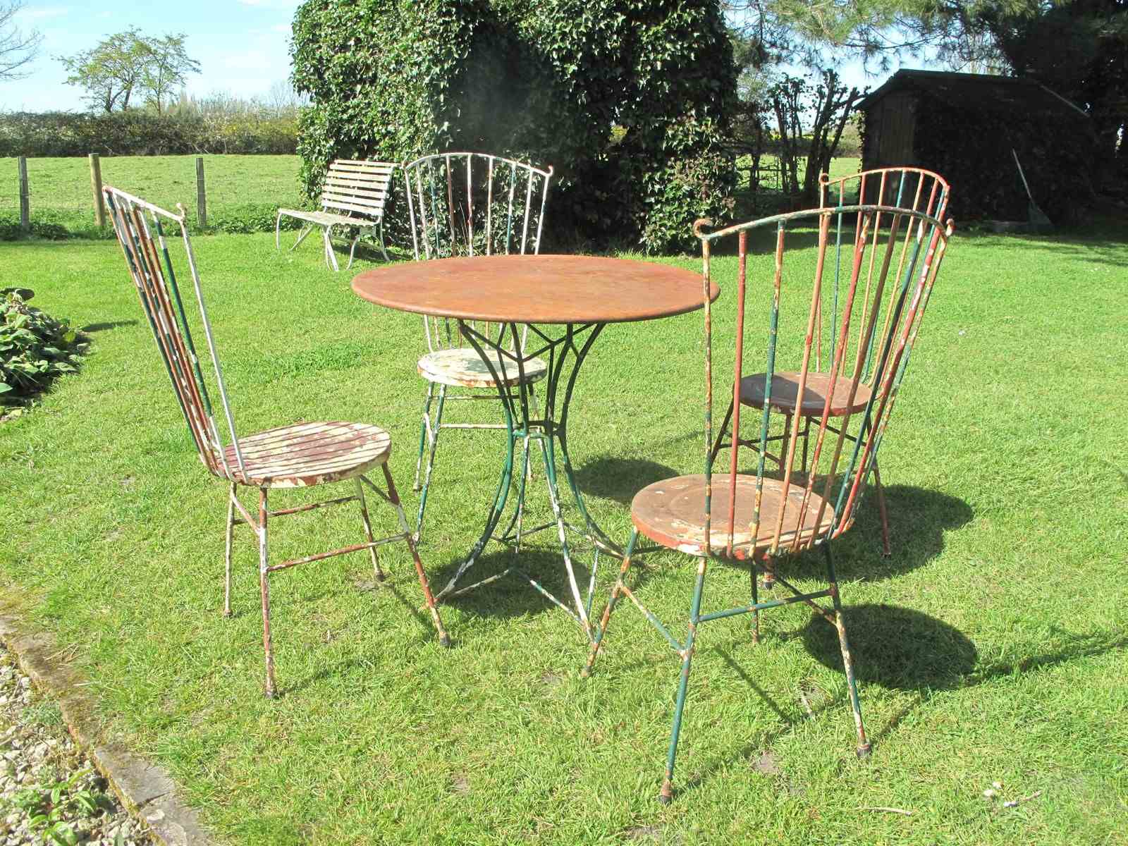 Rare top quality garden set in its original flaky paint. The garden set is in heavy gauge metal which will last for years to come. Al the chairs and the table are solid with no damage or repairs. The measurement is for the table.