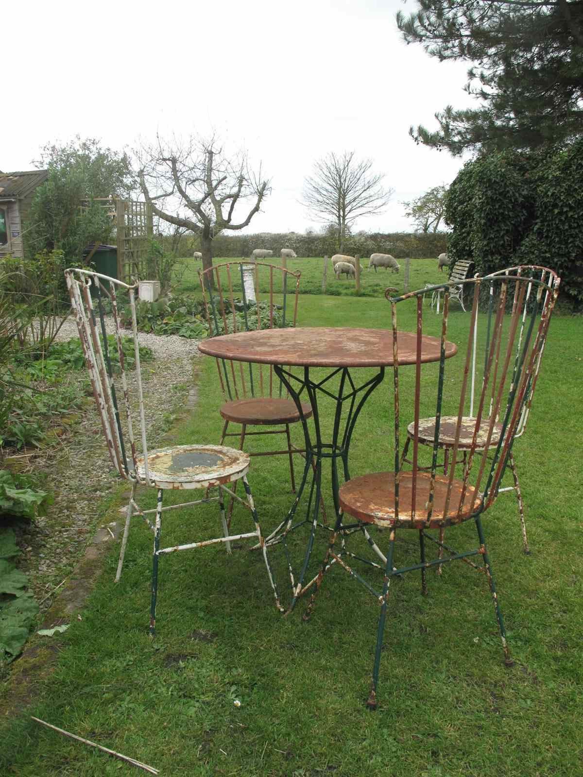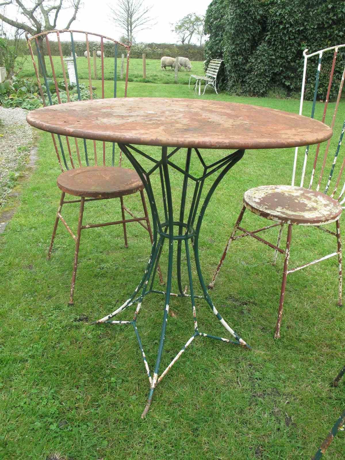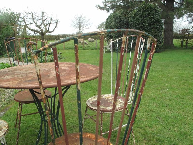 Rare top quality garden set in its original flaky paint. The garden set is in heavy gauge metal which will last for years to come. Al the chairs and the table are solid with no damage or repairs. The measurement is for the table.