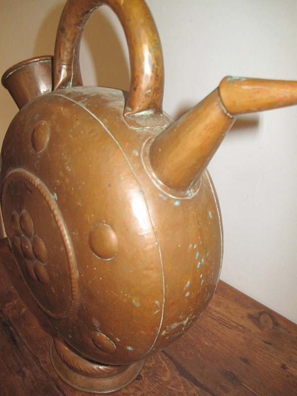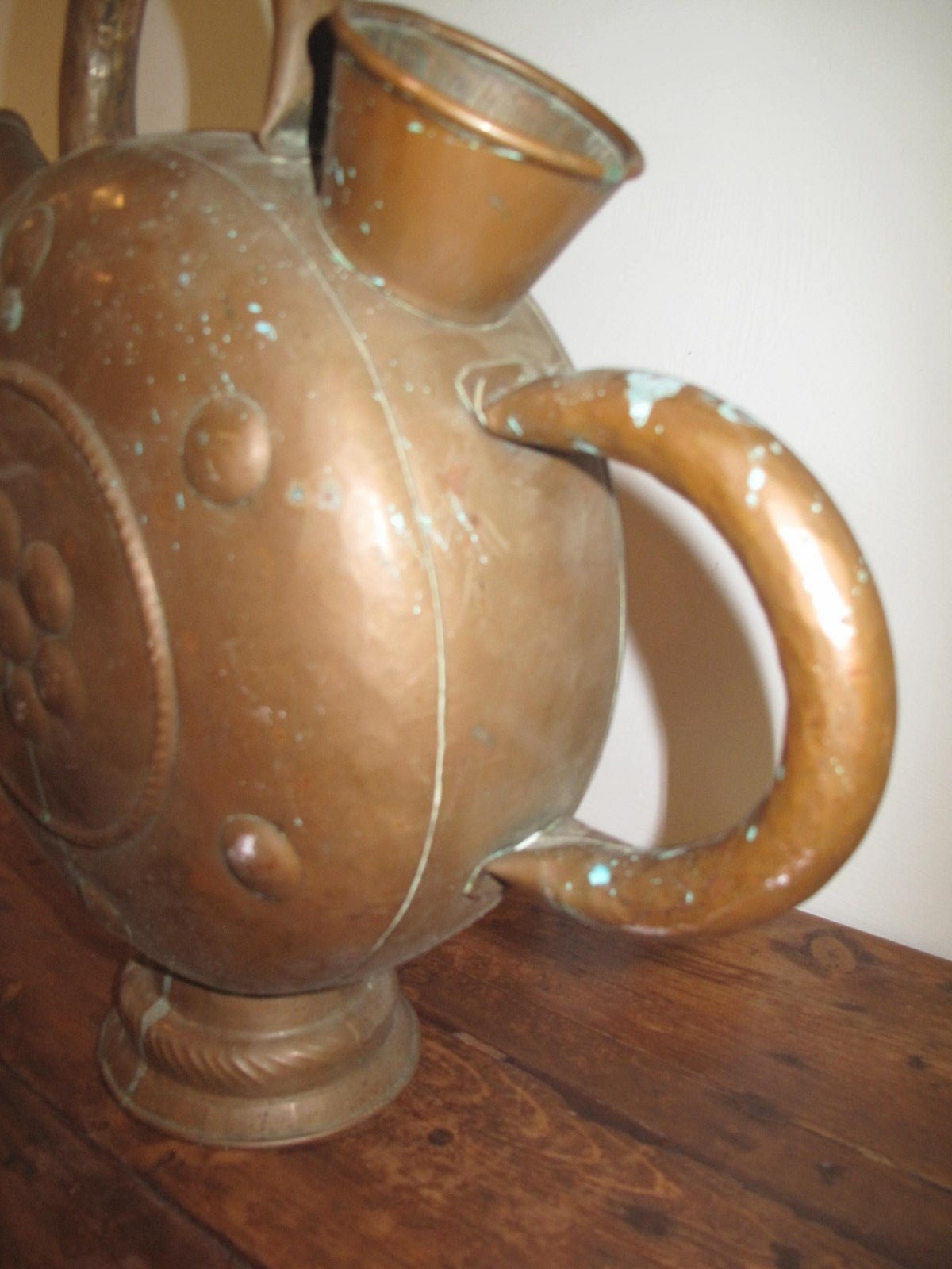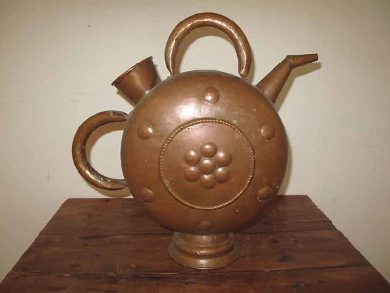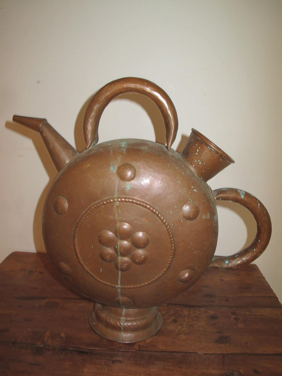 Spanish copper wine jug from the French Spanish border. These jugs are increasingly hard to find and this one is in good condition apart from some odd paint splashes. Early 20th century.