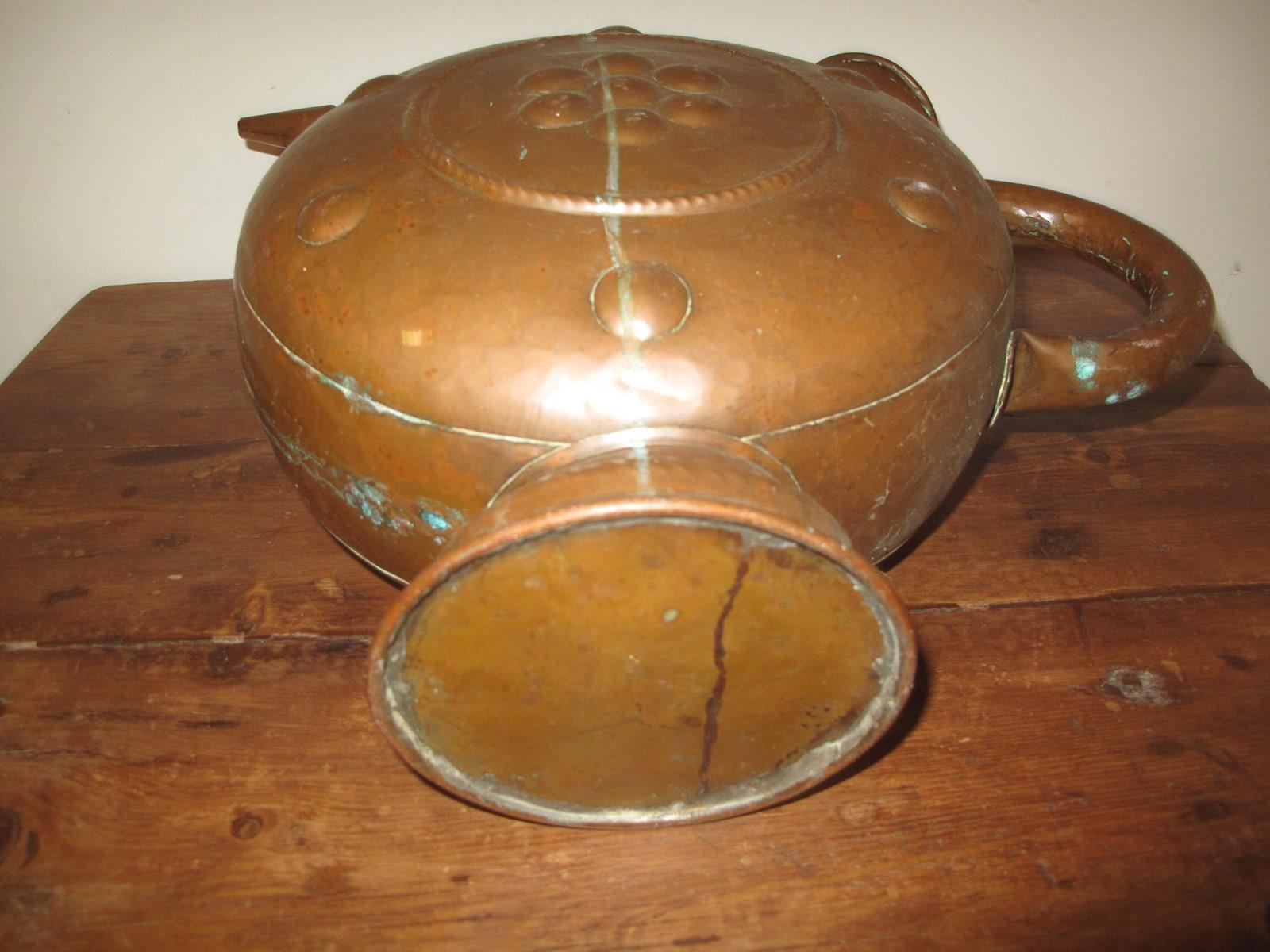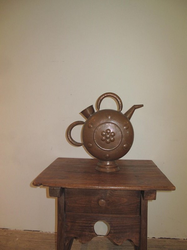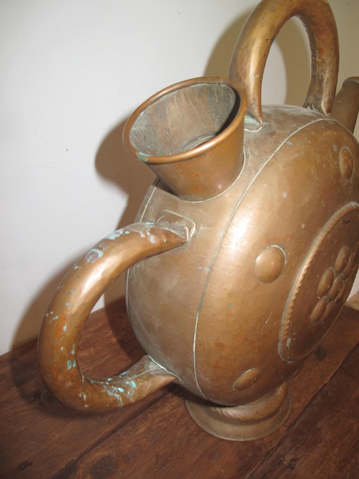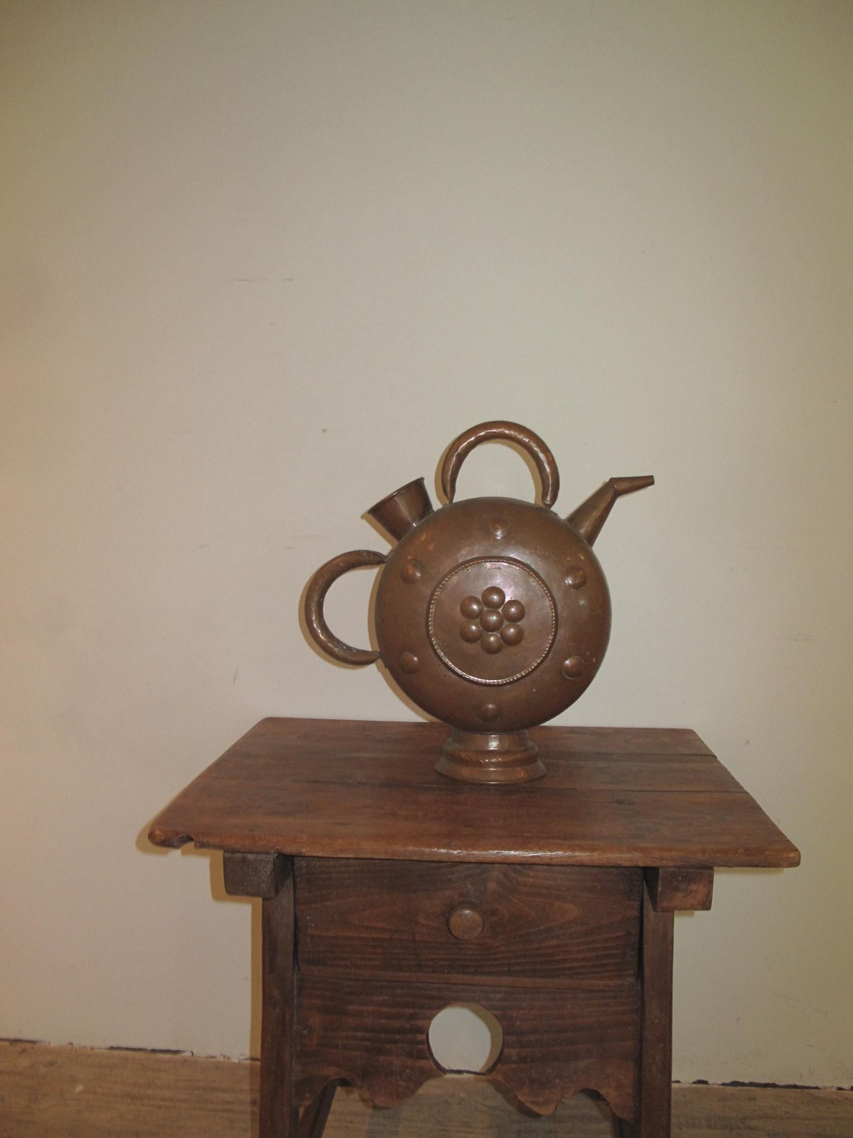 Spanish copper wine jug from the French Spanish border. These jugs are increasingly hard to find and this one is in good condition apart from some odd paint splashes. Early 20th century.