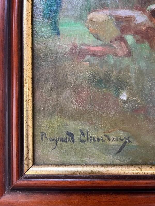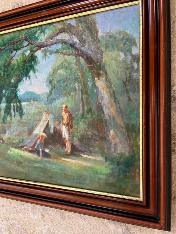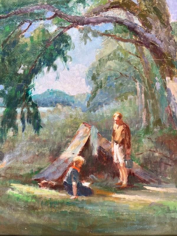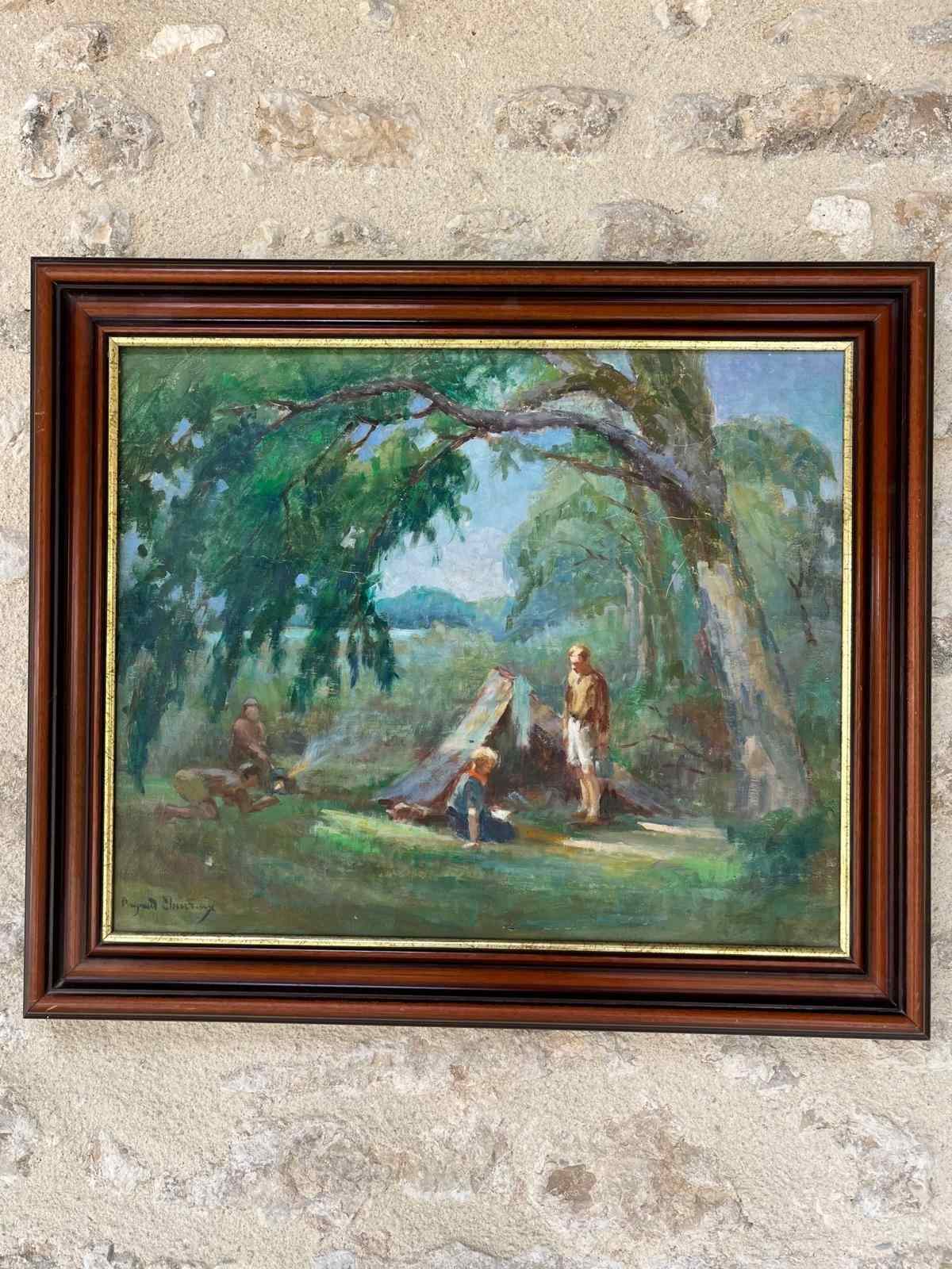 French 1940´s Signed oil on canvas of camping scene size 75 x 64