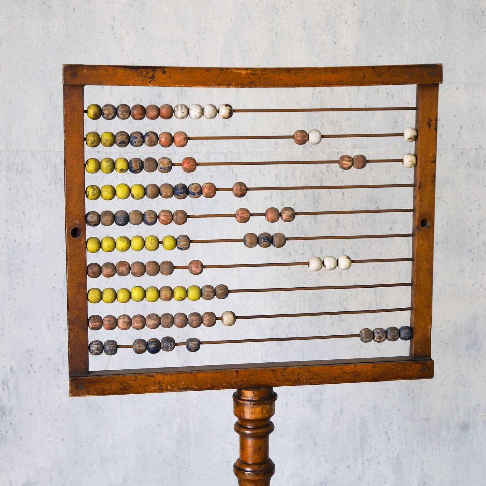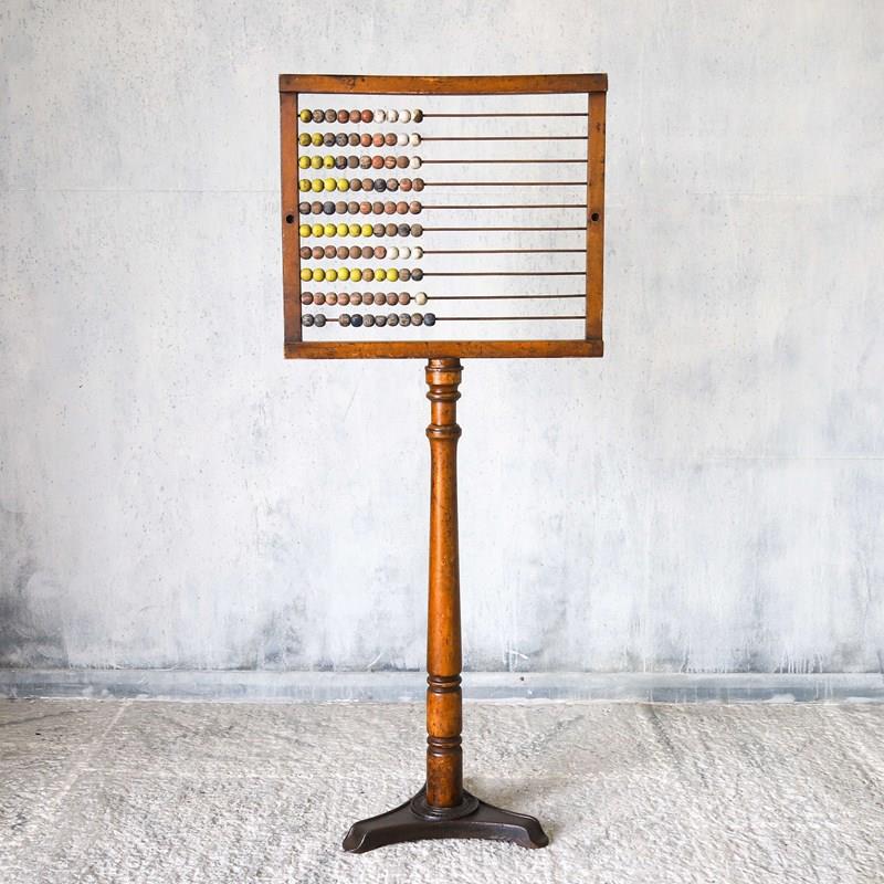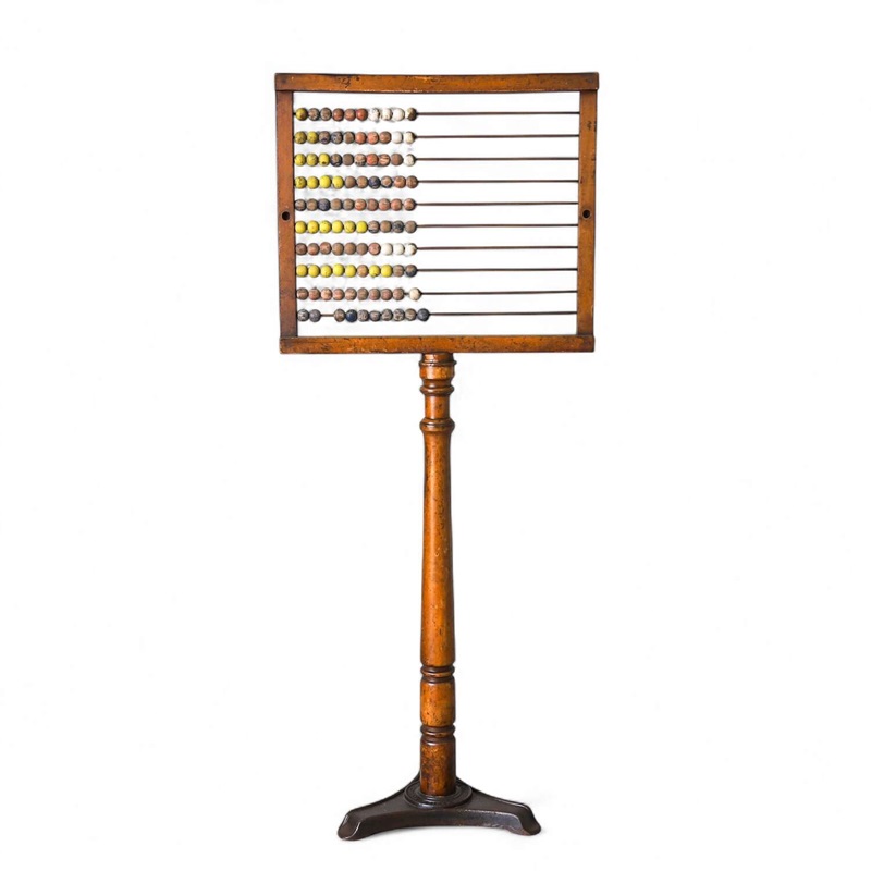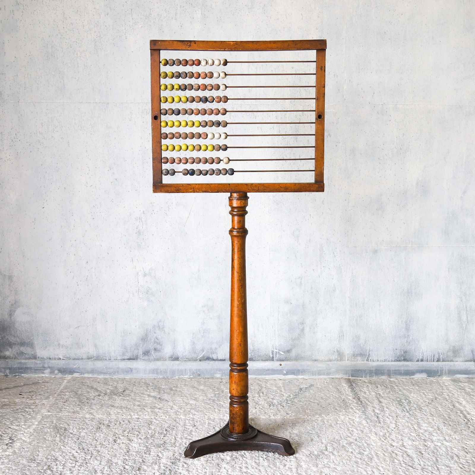 English 19th century school abacus on single mahogany stand. Set on iron base with makers mark all original lovely patina. Size height 142cm width 58cm