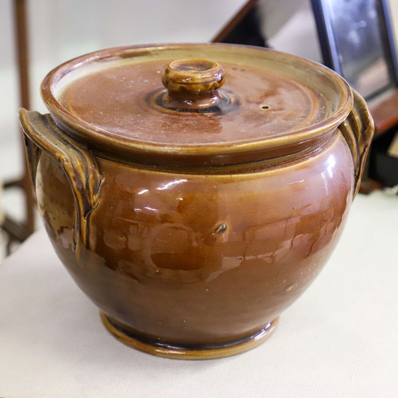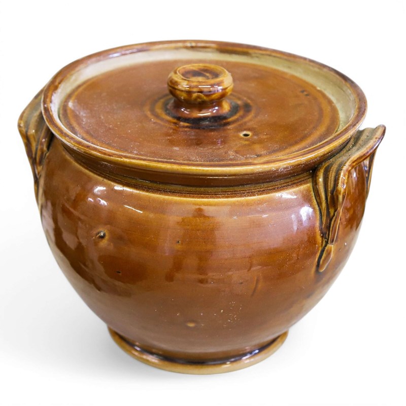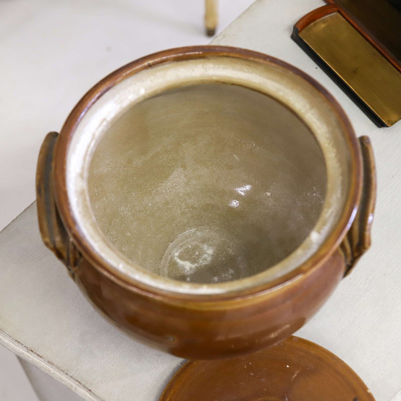 Terre de Fer’s distinctive glazed finish - rich, glossy, and beautifully aged - allowed these serving bowls to complement finer tableware or stand alone in rustic kitchens. Their simple pedestal form, like this one, lends a quiet sophistication, reminding us that even the most practical objects can carry an air of refinement.