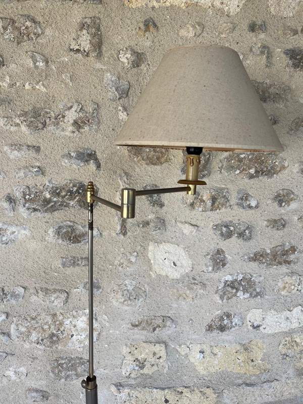 Circa 1970’s floor lamp with articulated arm and adjustable height. Solid well balanced construction Made from metal and brass. This has a great mid century look. In the style of Maison Bagues