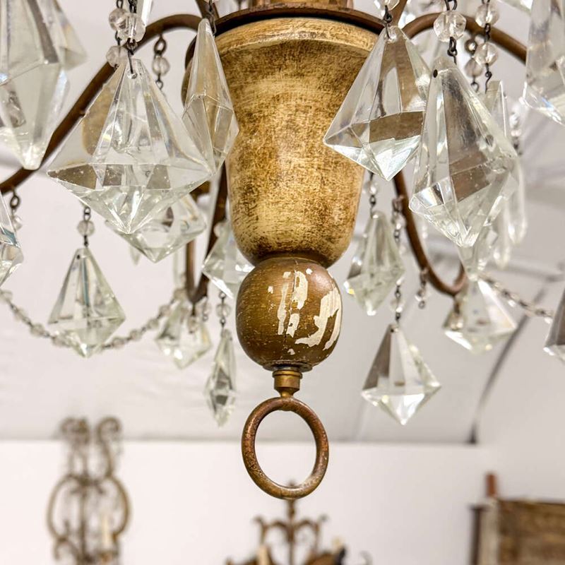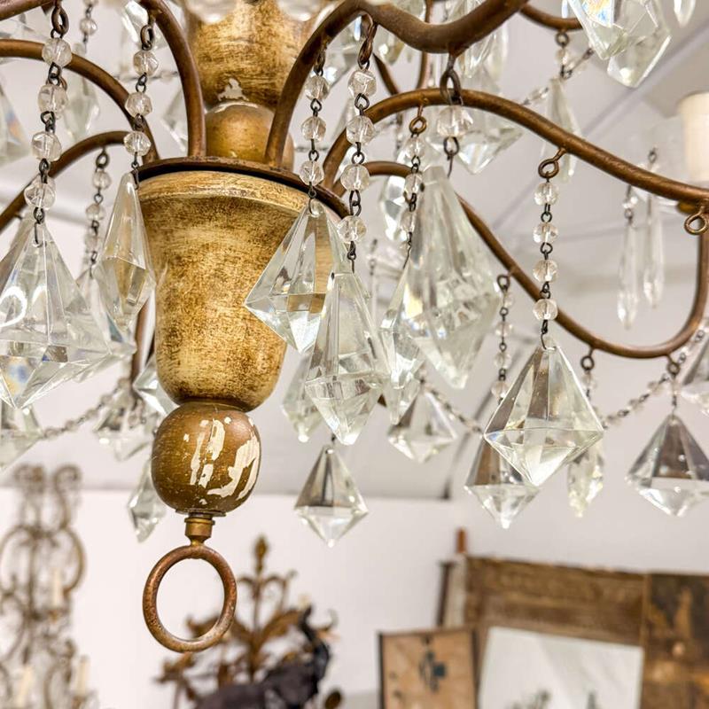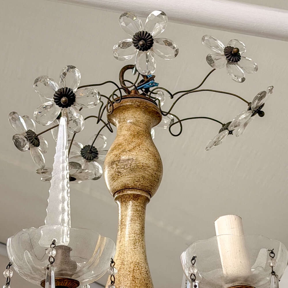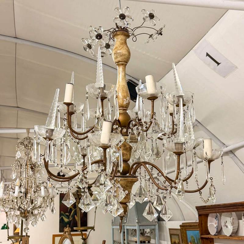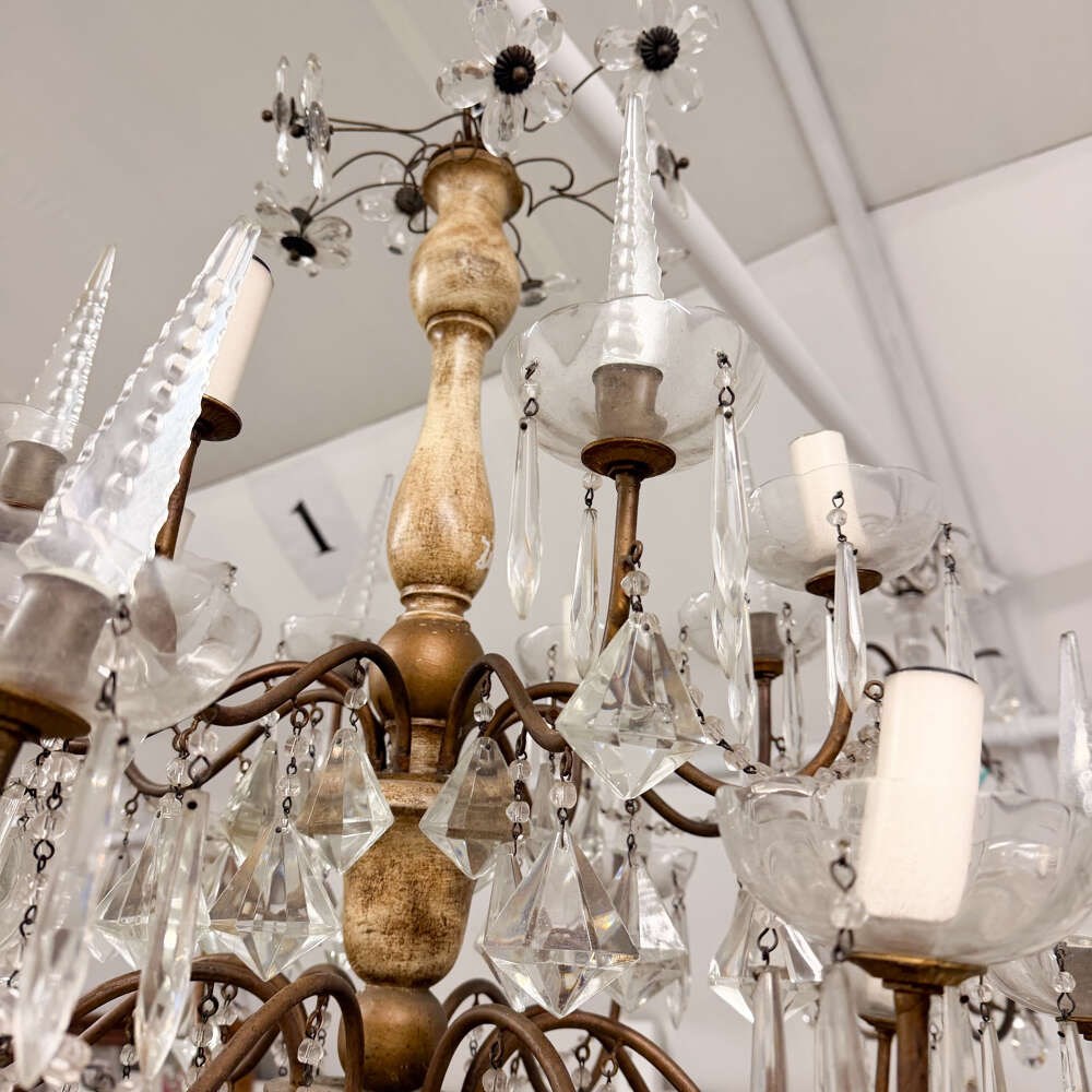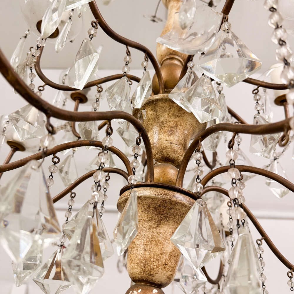 A dramatic and elegant large Italian crystal chandelier dating to the mid 20th century, circa 1940s. This impressive piece features a central turned wooden stem, painted and enriched with gilt metal arms, from which hang faceted crystal drops that beautifully catch and reflect the light.