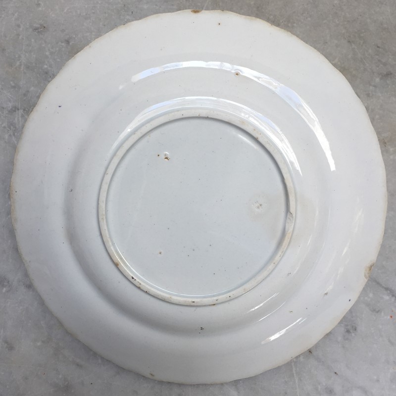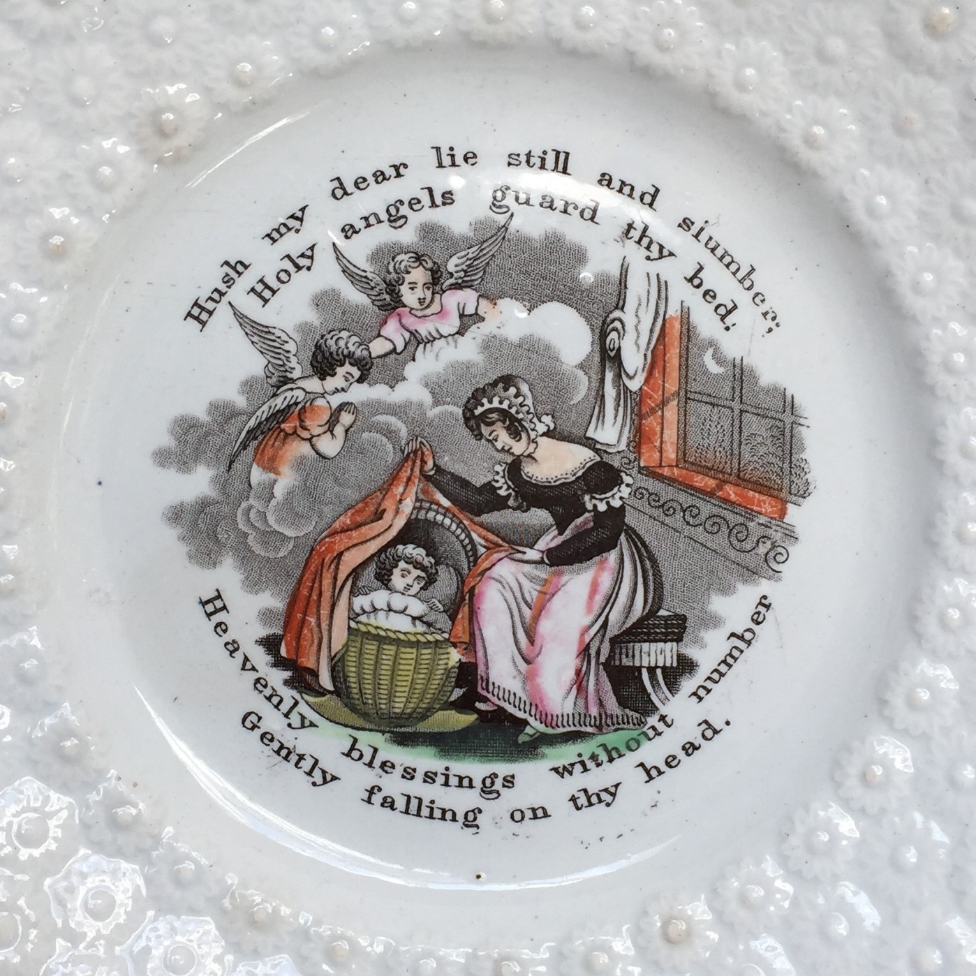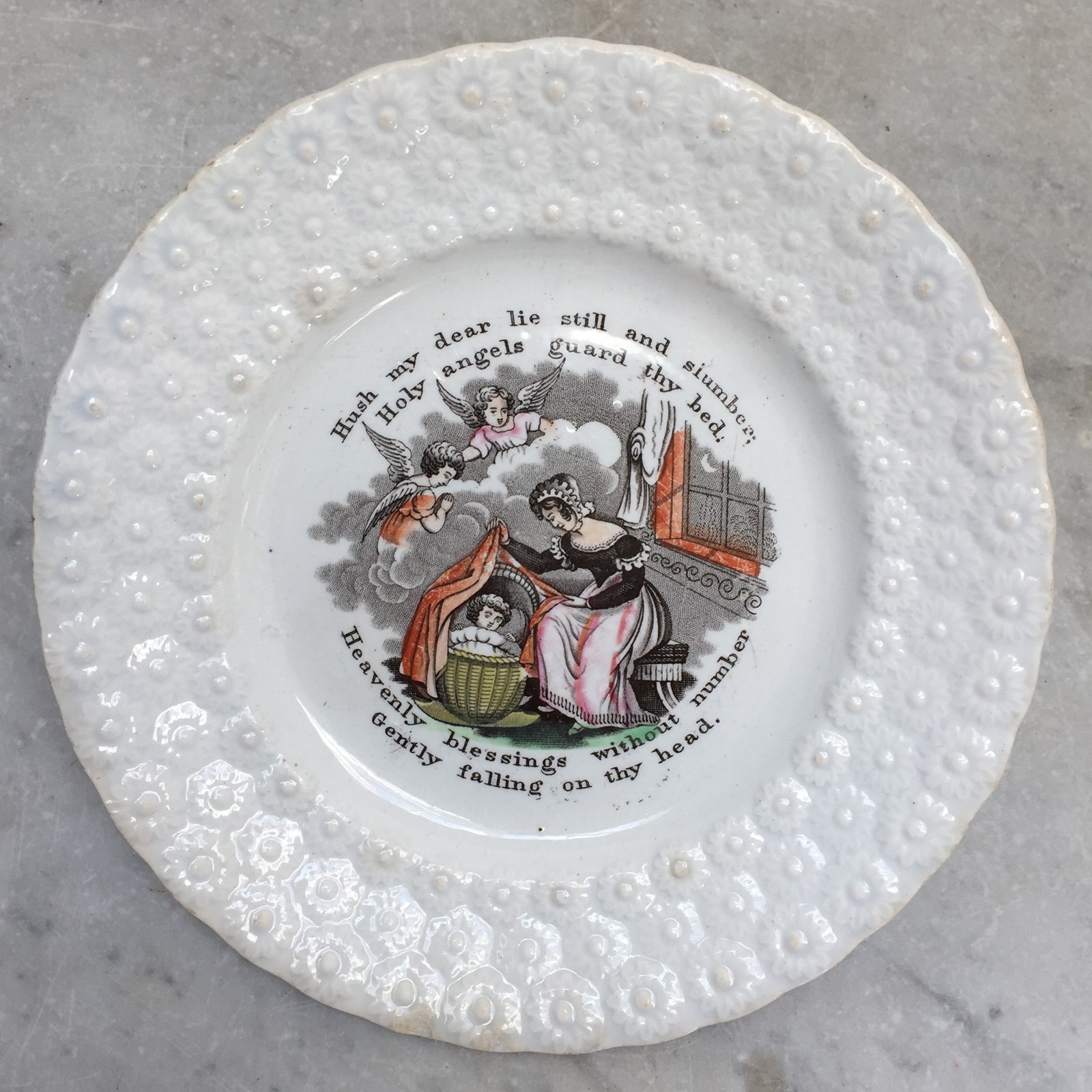 Lovely Children's 'Motto' plate, mid 19th century Transfer printed in brown and enamelled in rose, orange, green and lemon Border of moulded Daisies