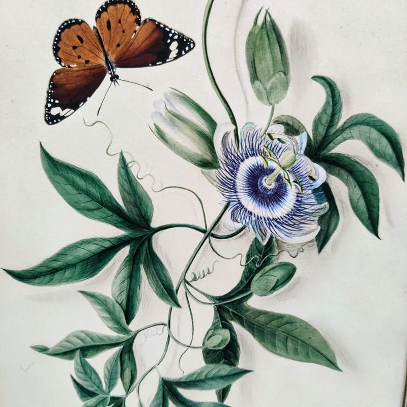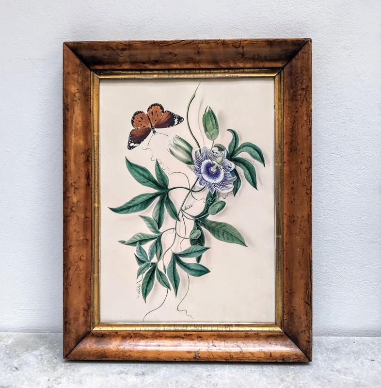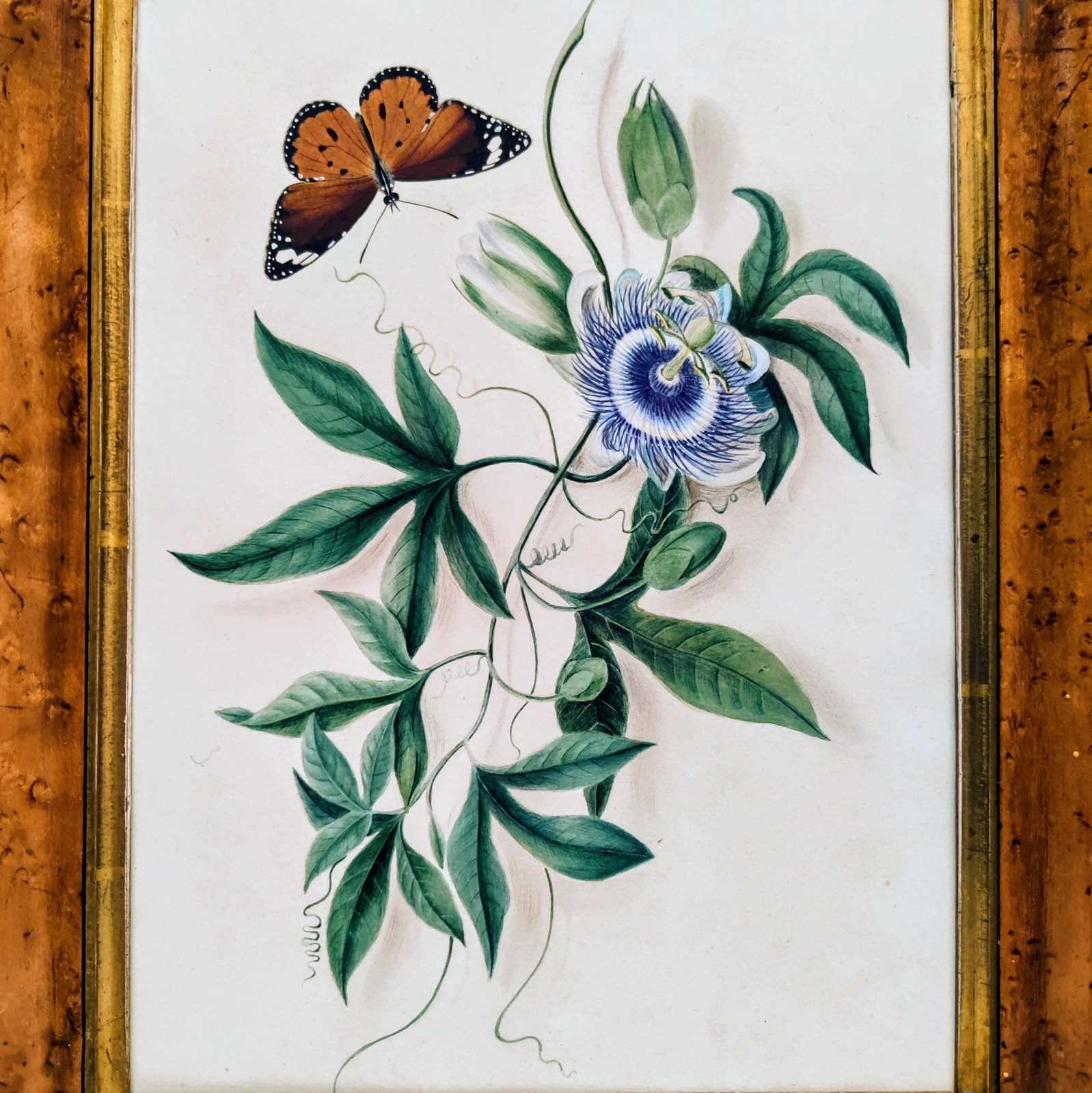Beautiful, early C19th watercolour of butterfly and a sprig of Passionflower in a large birds eye maple frame