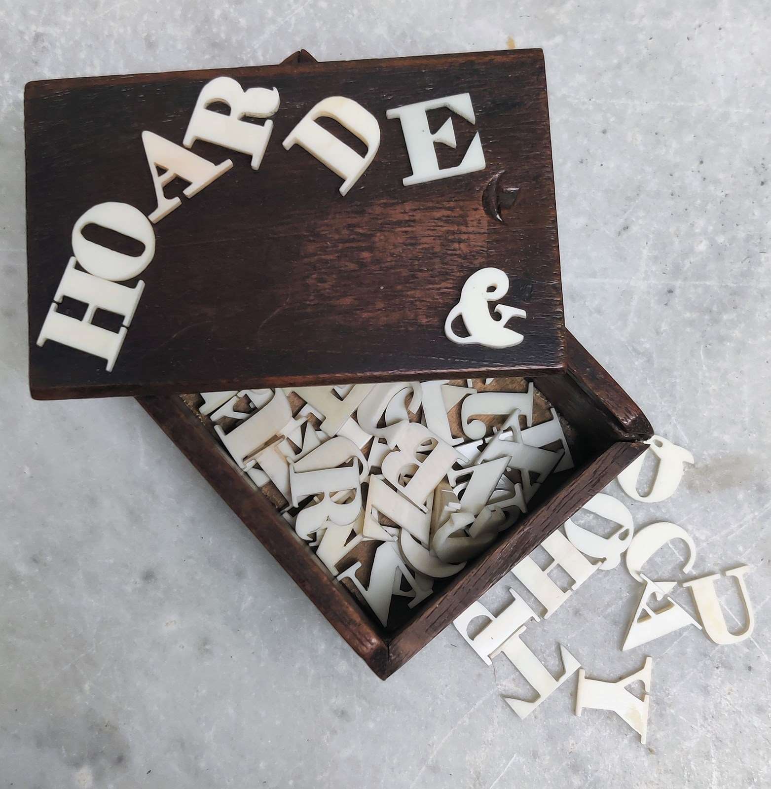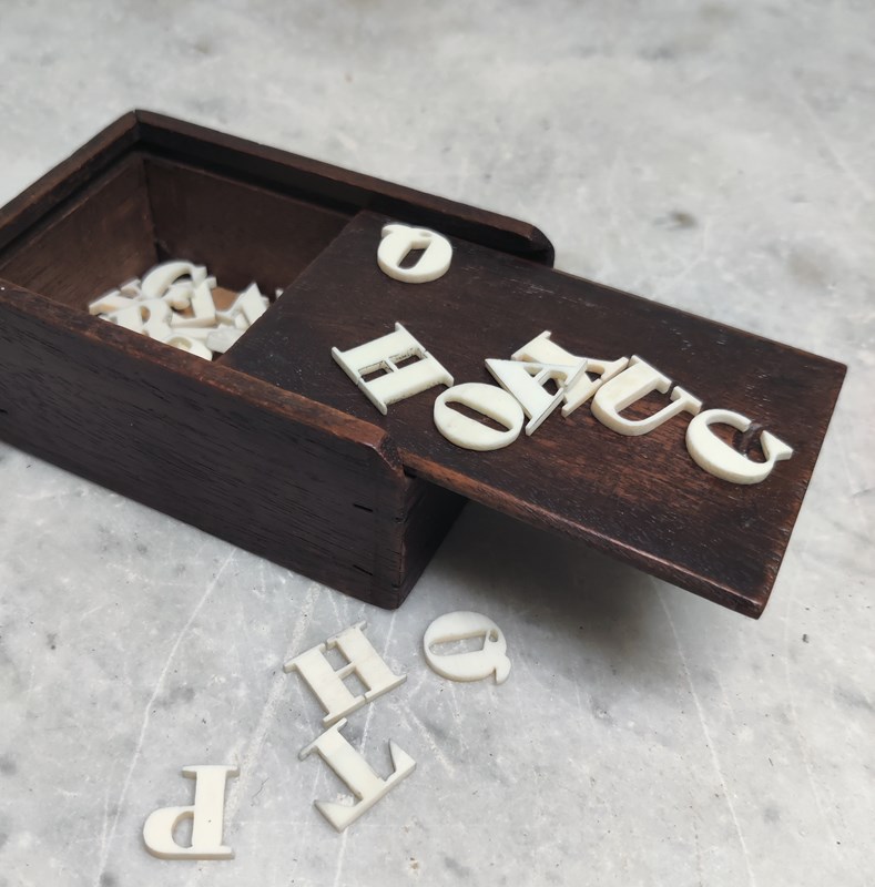 A fine set of 19th century bone, hand cut letters in a lovely mahogany box