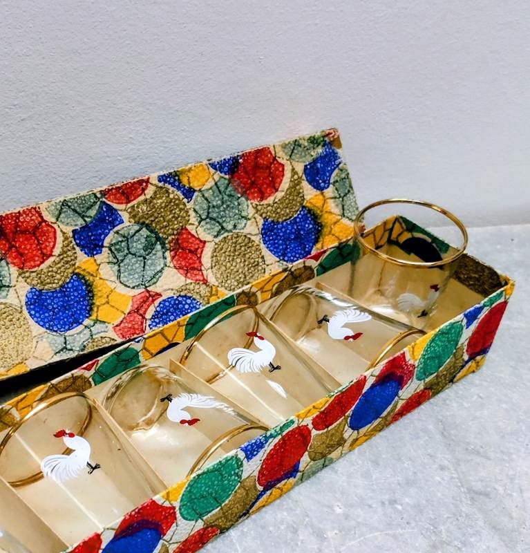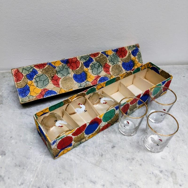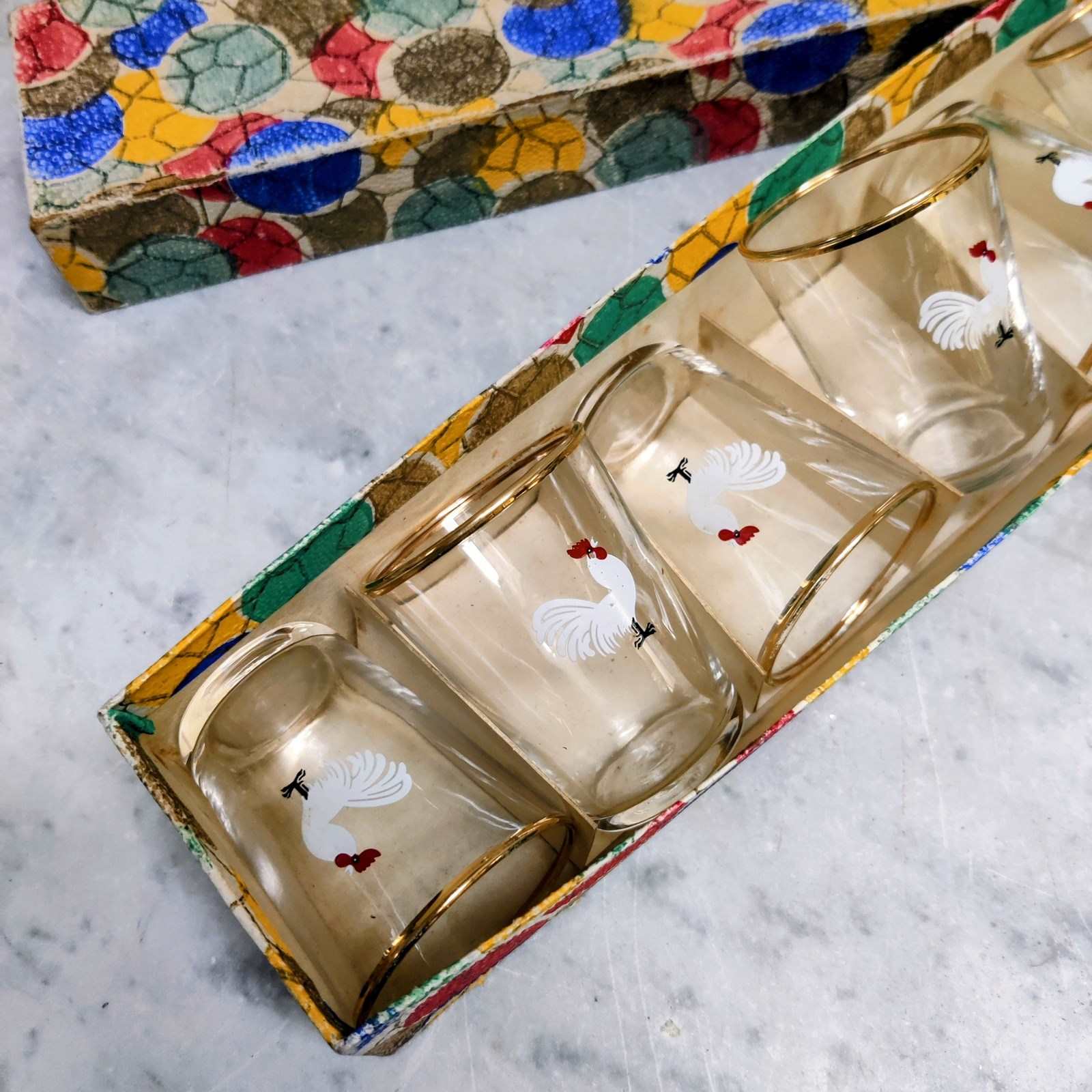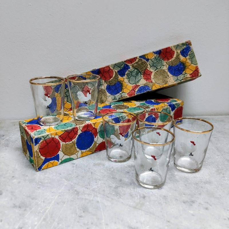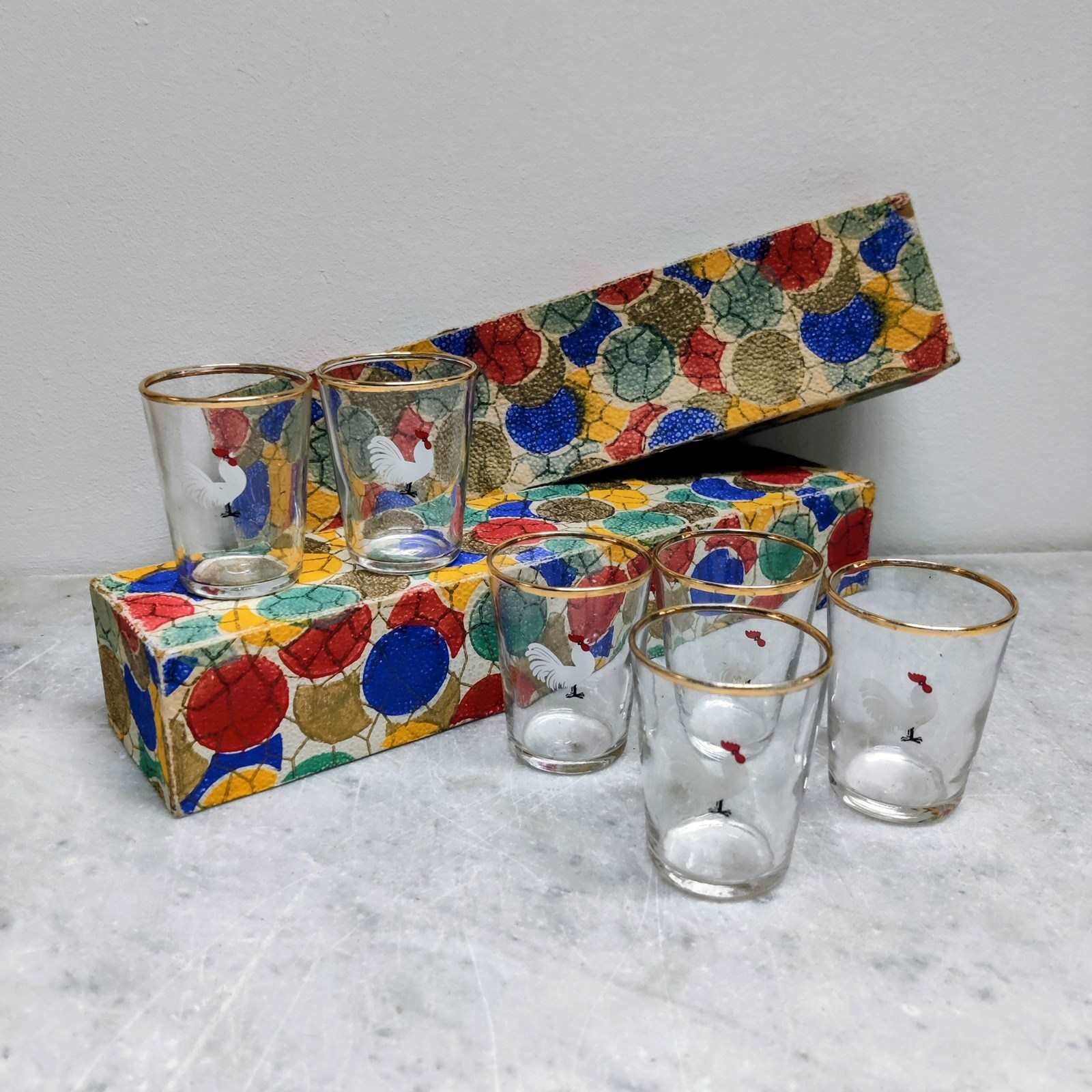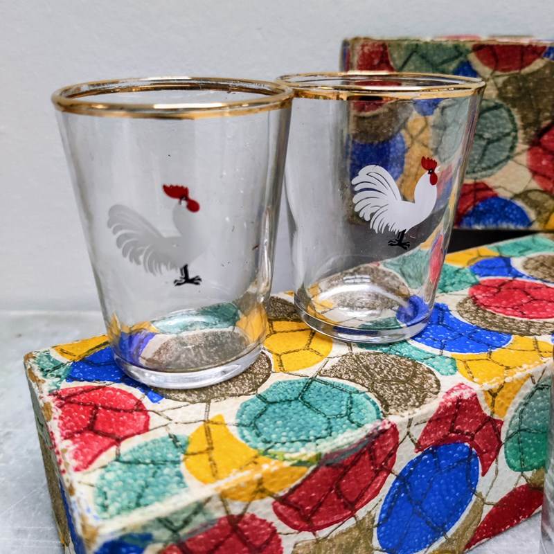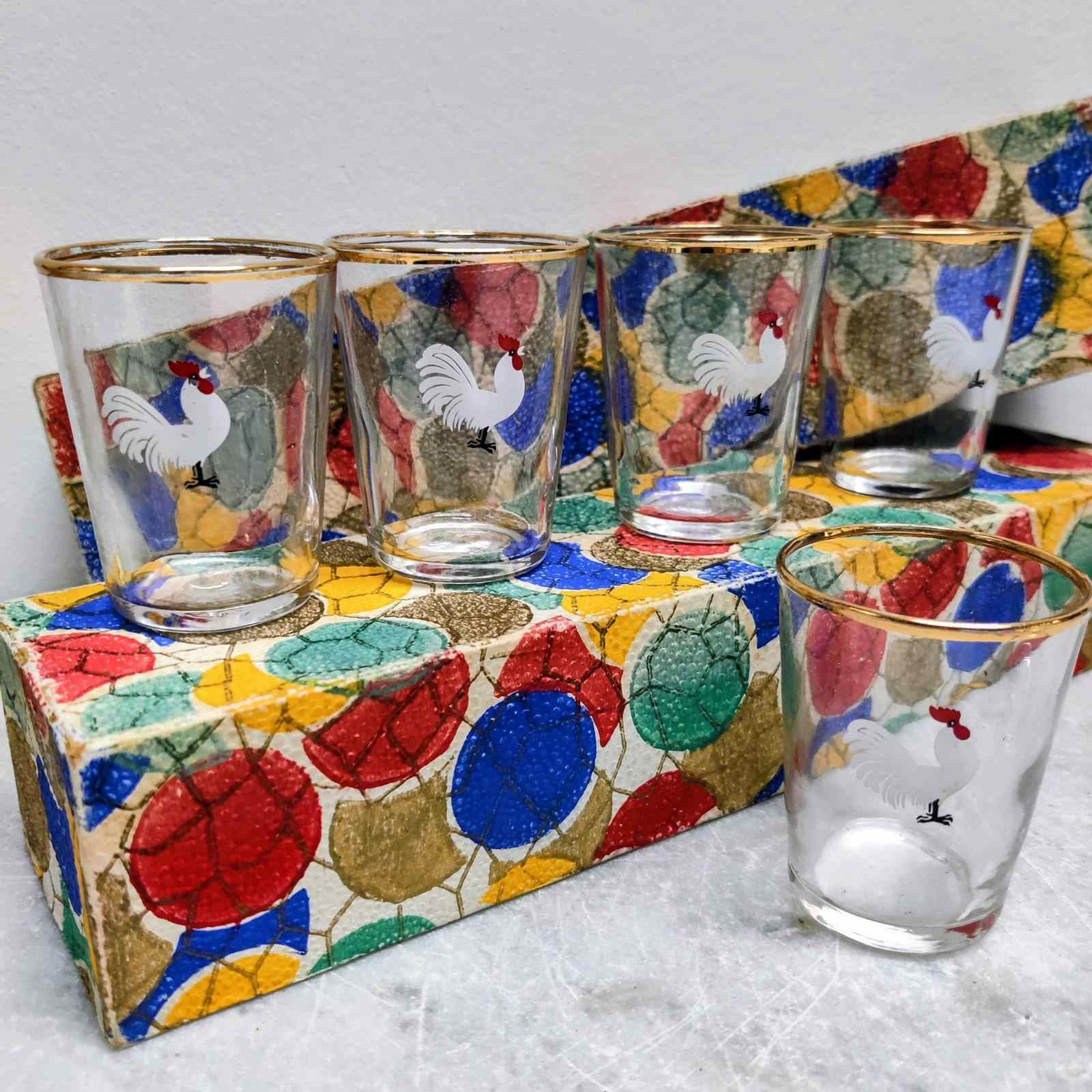 Each glass has a gold rim and a white, red and black cockerel on the side