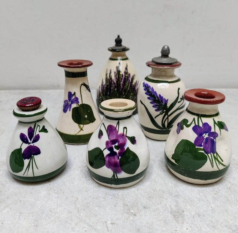 A collection of 6 pretty, early 20th century perfume bottles, three with stoppers