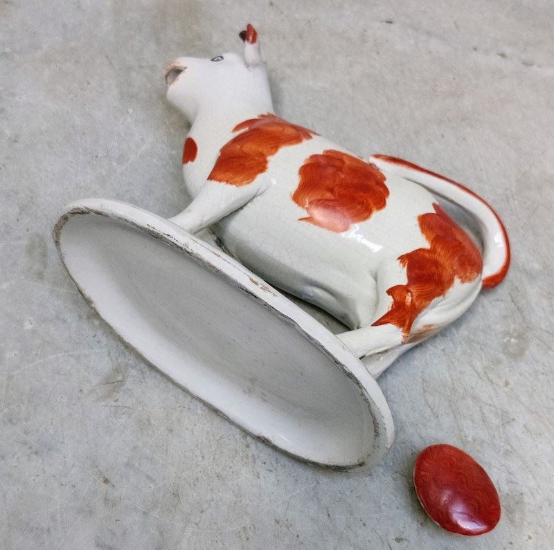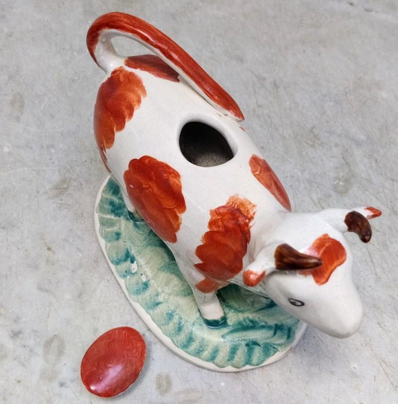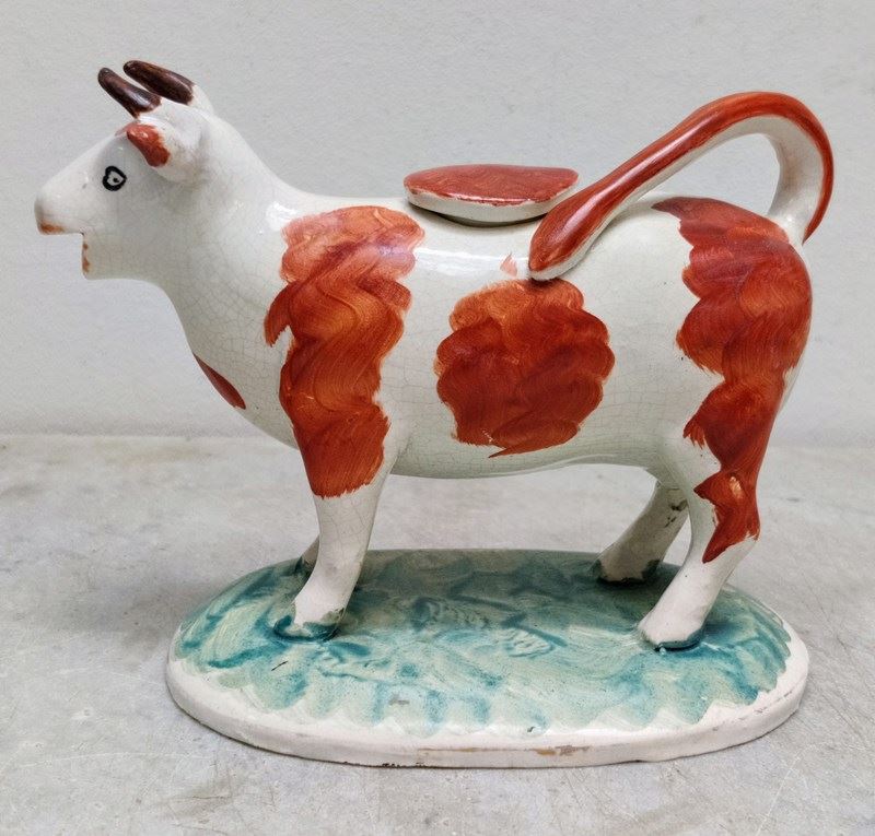 Charming Hand Painted creamware Cow Creamer, standing on a grassy patch in a field With little painted stopper